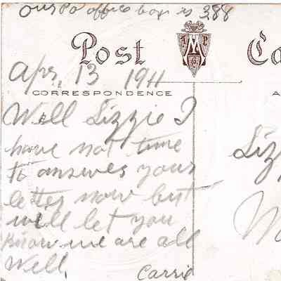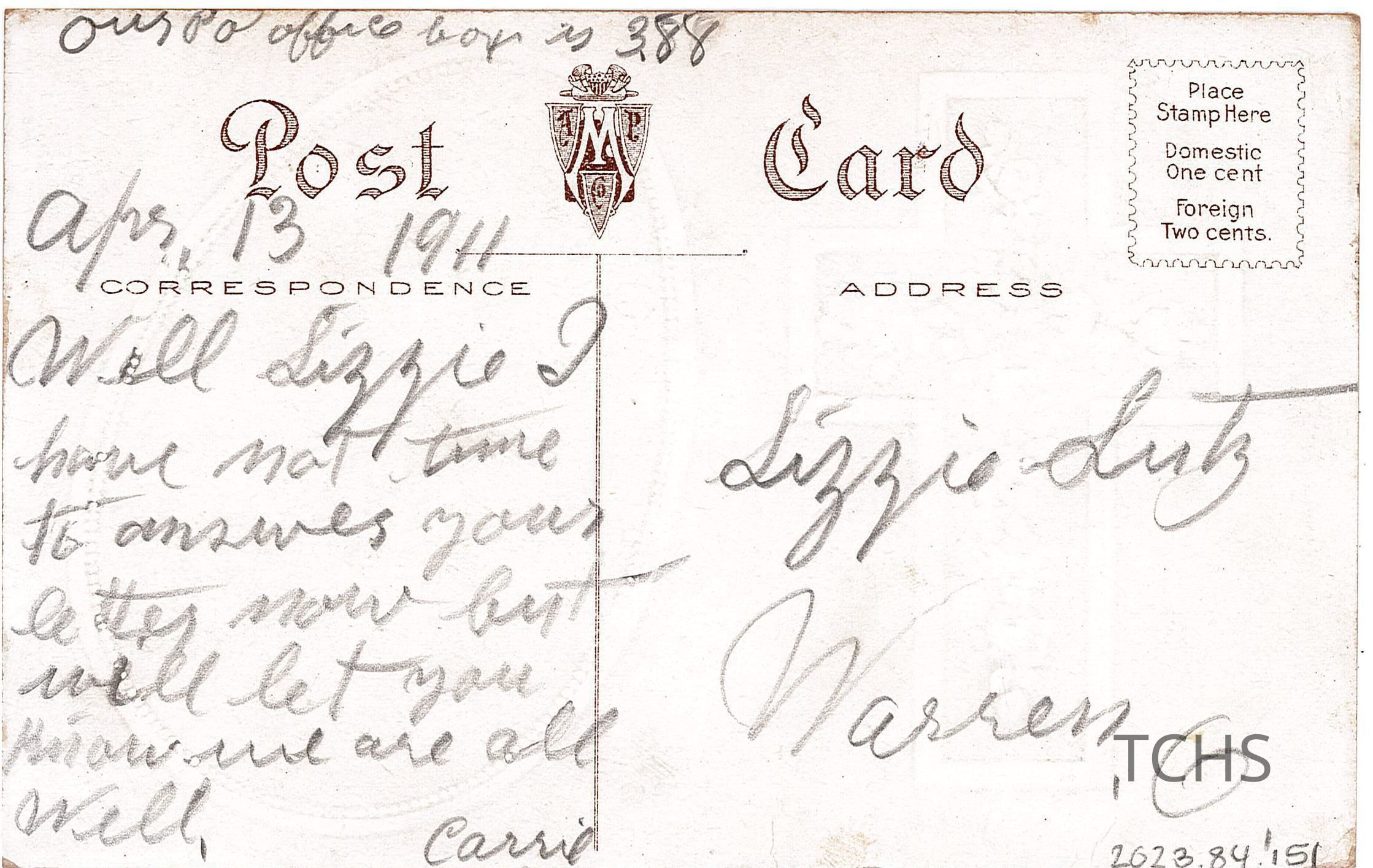 An Easter postcard to Elizabeth "Lizzie" Lutz from Carrie, dated April 13th, 1911.Acquisition