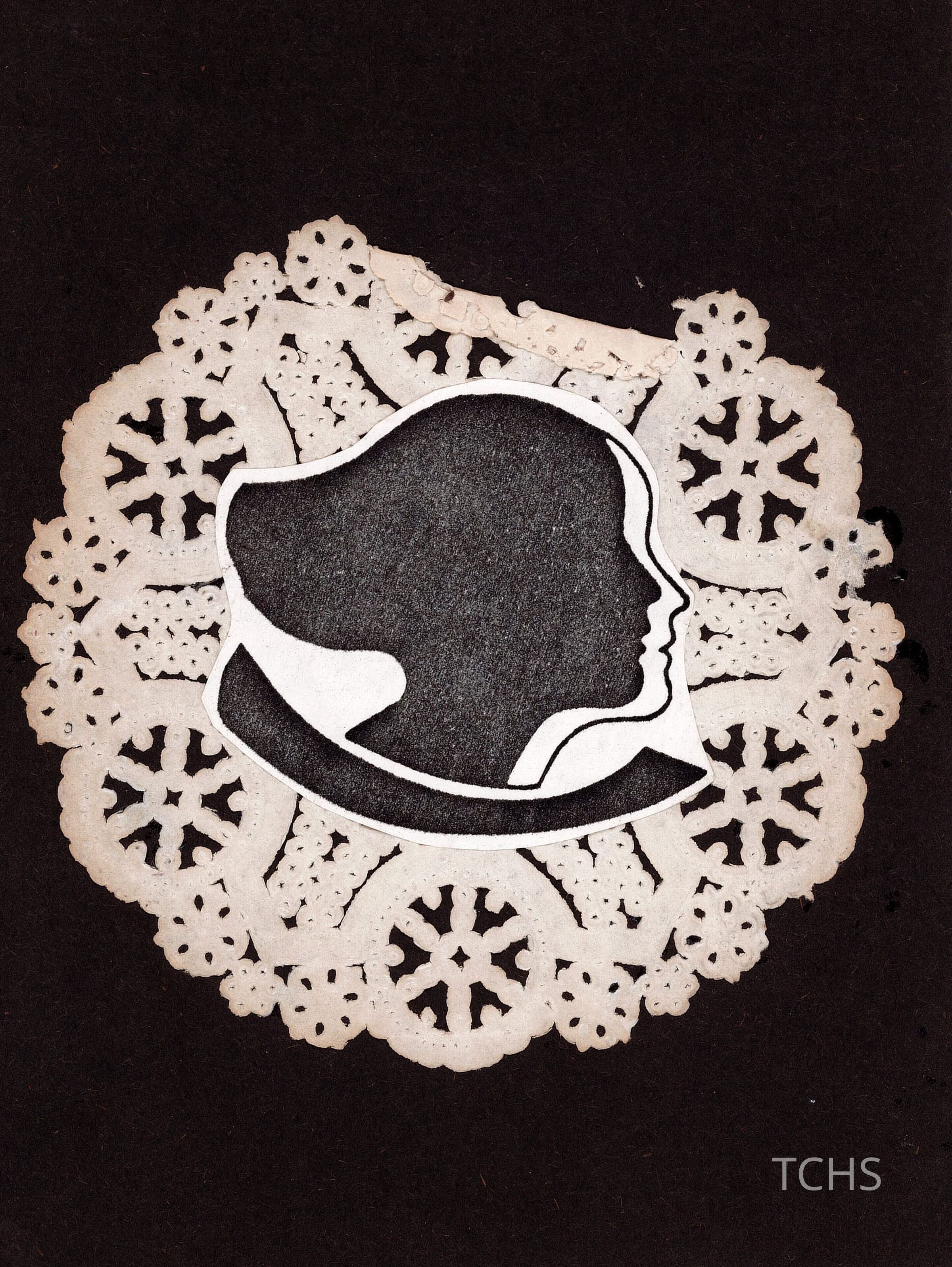 Arts and Drama Club of Warren annual program for 1981-1982. Handmade program on black paper with a circular white paper lace behind a black and white face silhouette.Collection