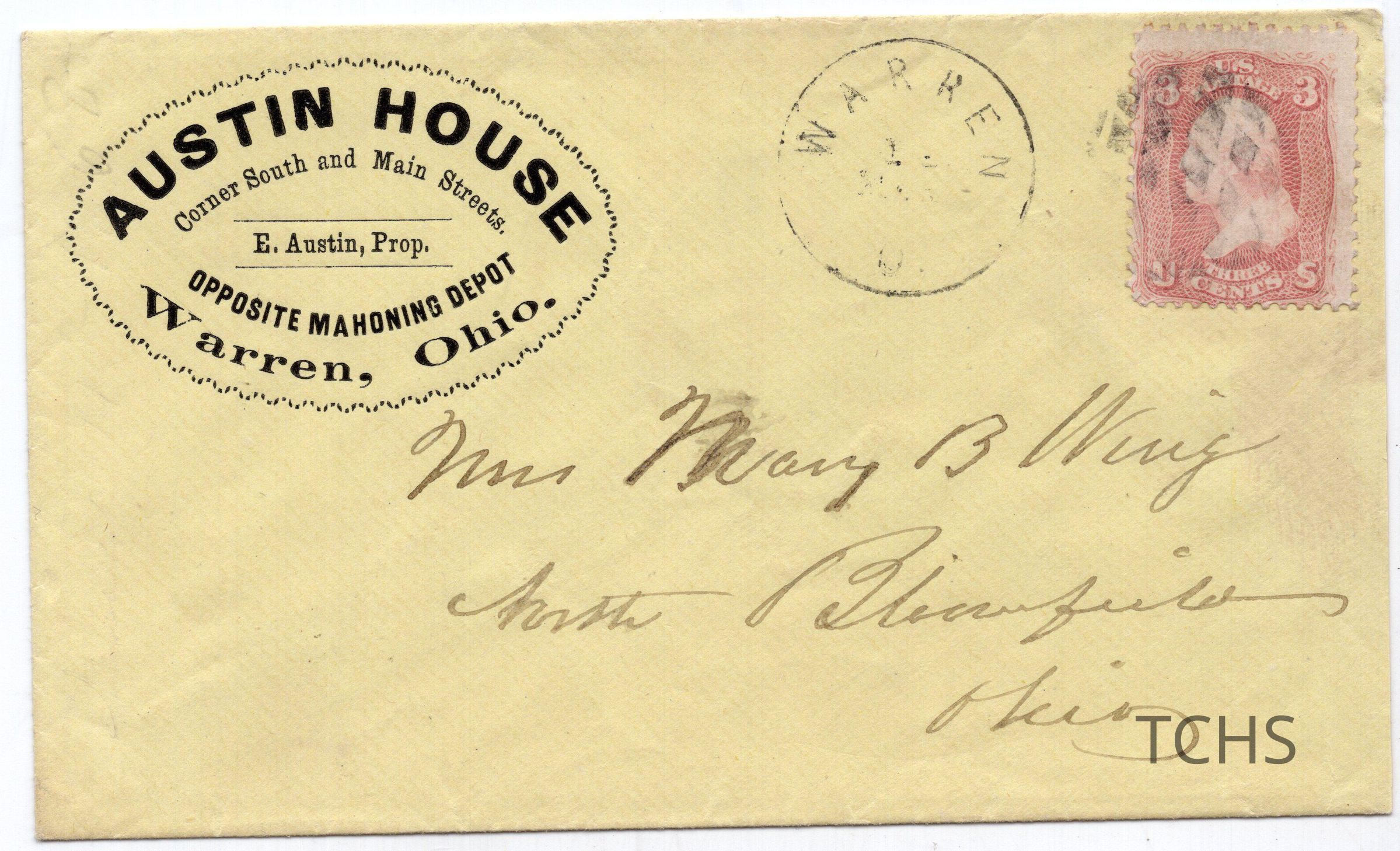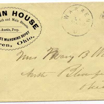 Envelope from Austin House, corner of South and Main Streets, Warren to Mary B. Wing of North Bloomfield. E. Austin was the proprietor.Collection