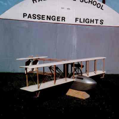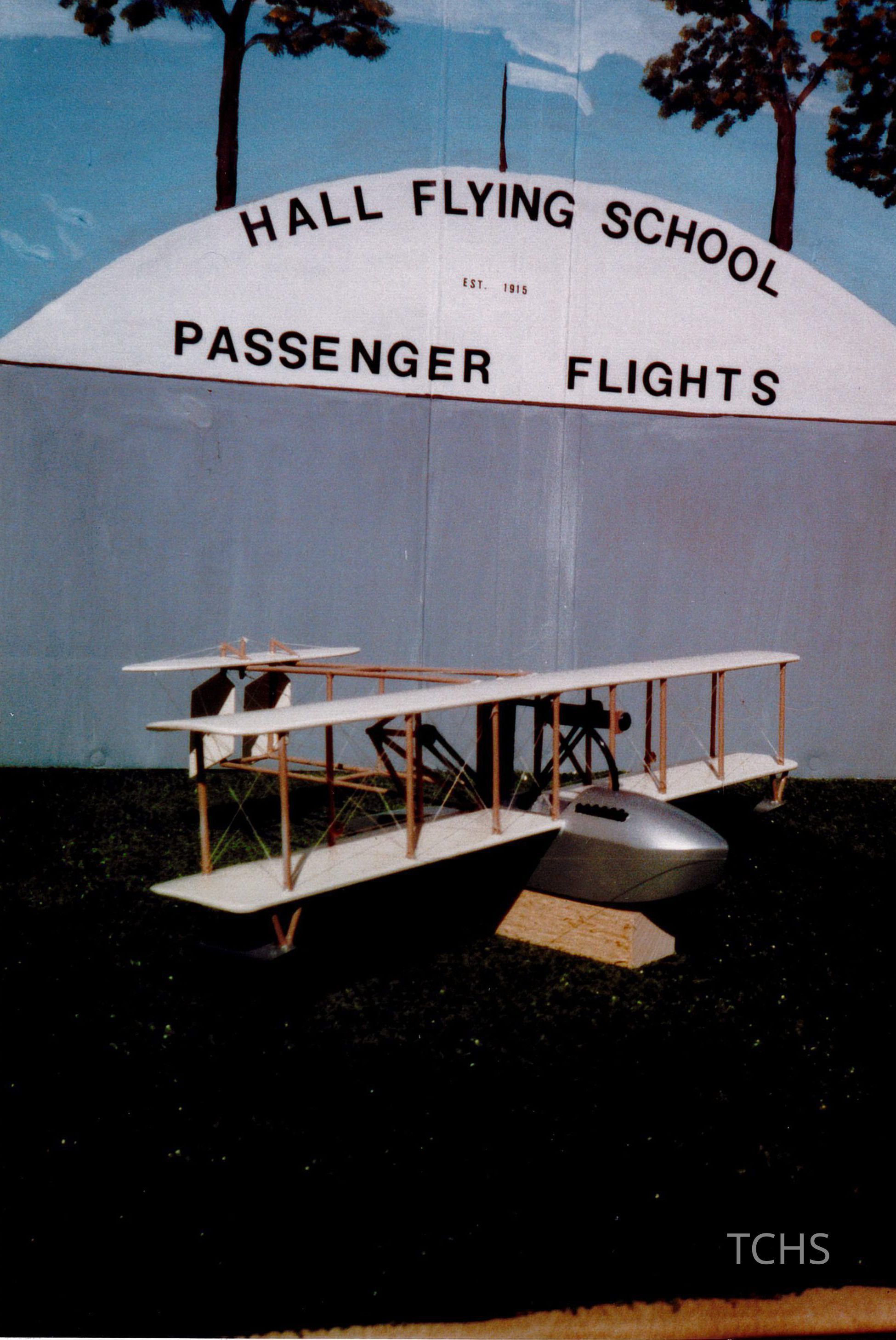 Photograph showing a diorama of the Hall Flying School with a white & grey model airplane in front of it.Acquisition