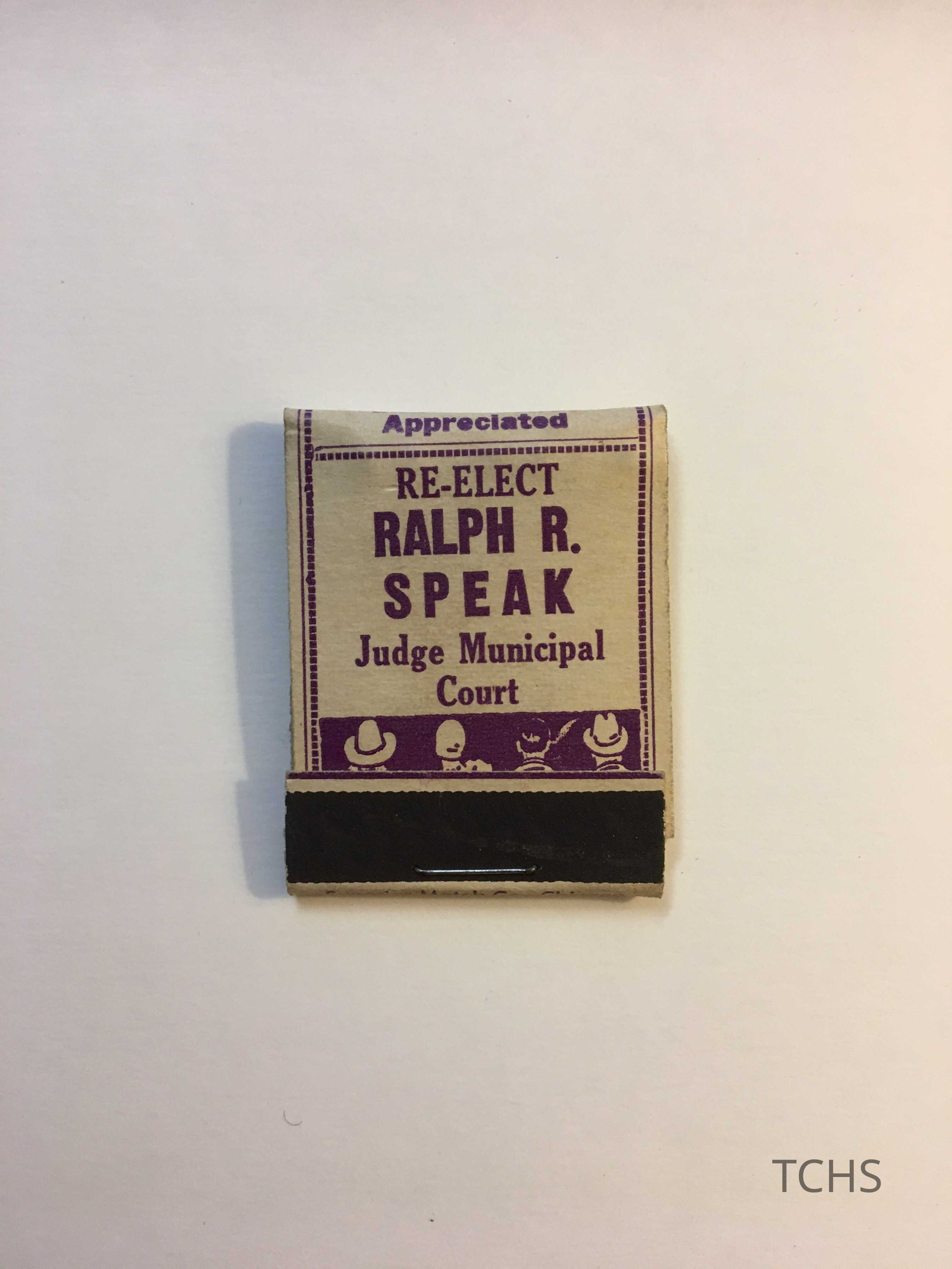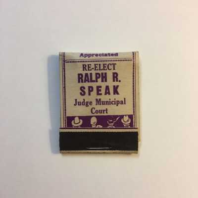 Matchbook, white with purple letters, that reads "Re-Elect Ralph R. Speak Judge Municipal Court"Collection