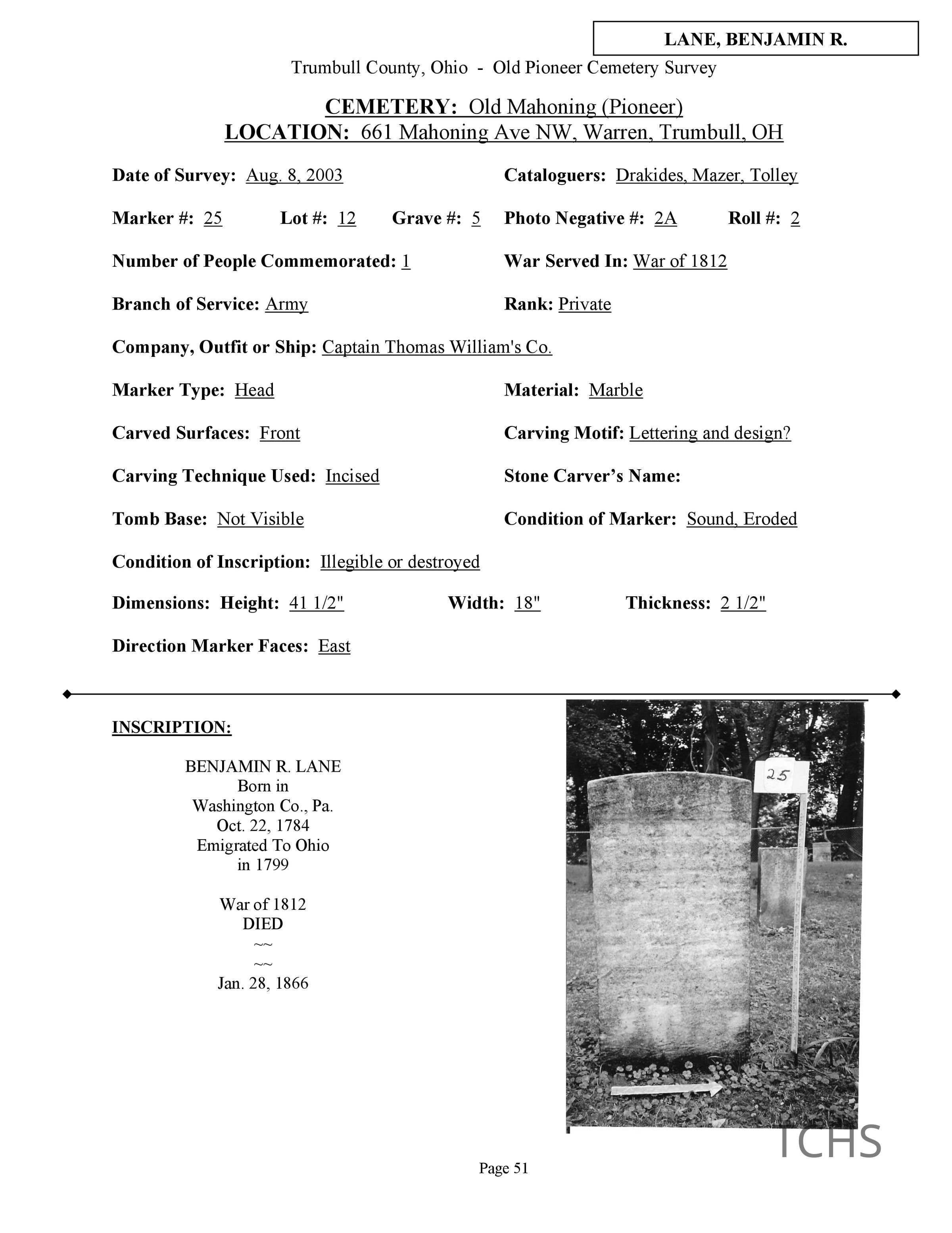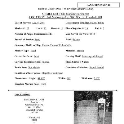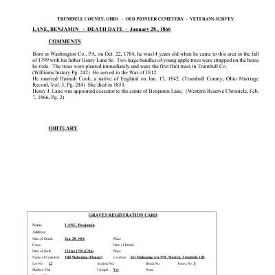 Benjamin R. Lane died January 28, 1866 at the age of 81 and is buried at the Old Mahoning (Pioneer) Cemetery. *There is an additional page attached that was found in the Veterans Index*