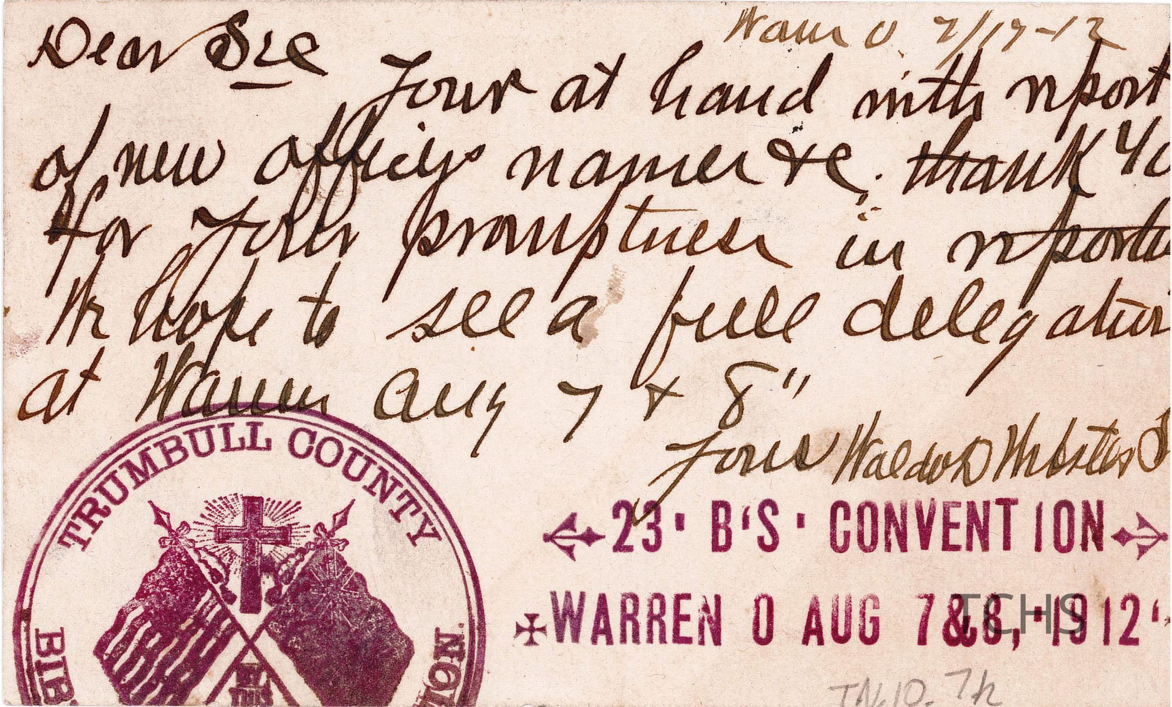 Trumbull County Bible Society convention dated August 7 and 8th, 1912.Acquisition