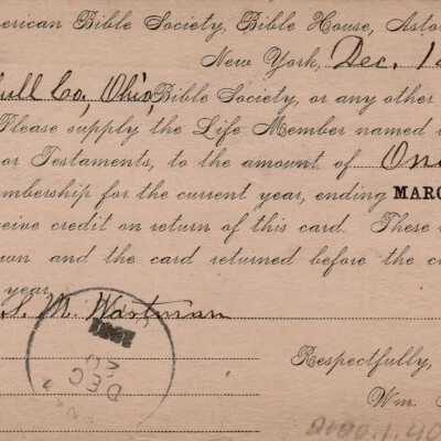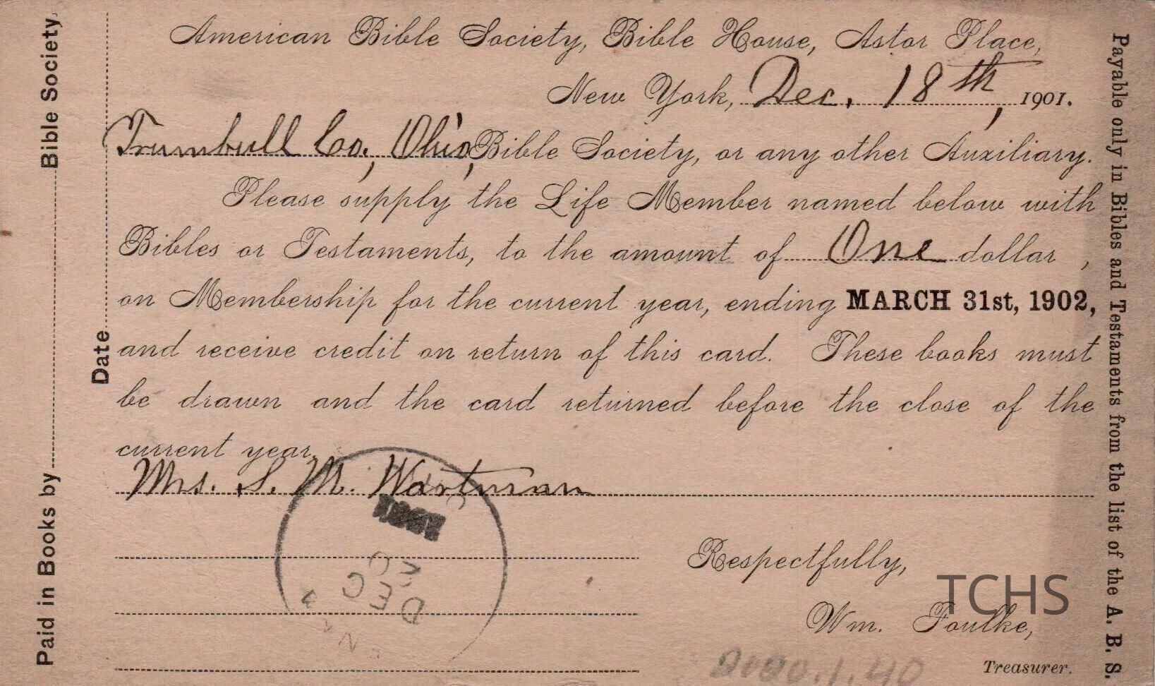 Membership card for S. M. Wartman from the Trumbull County Bible SocietyLocation