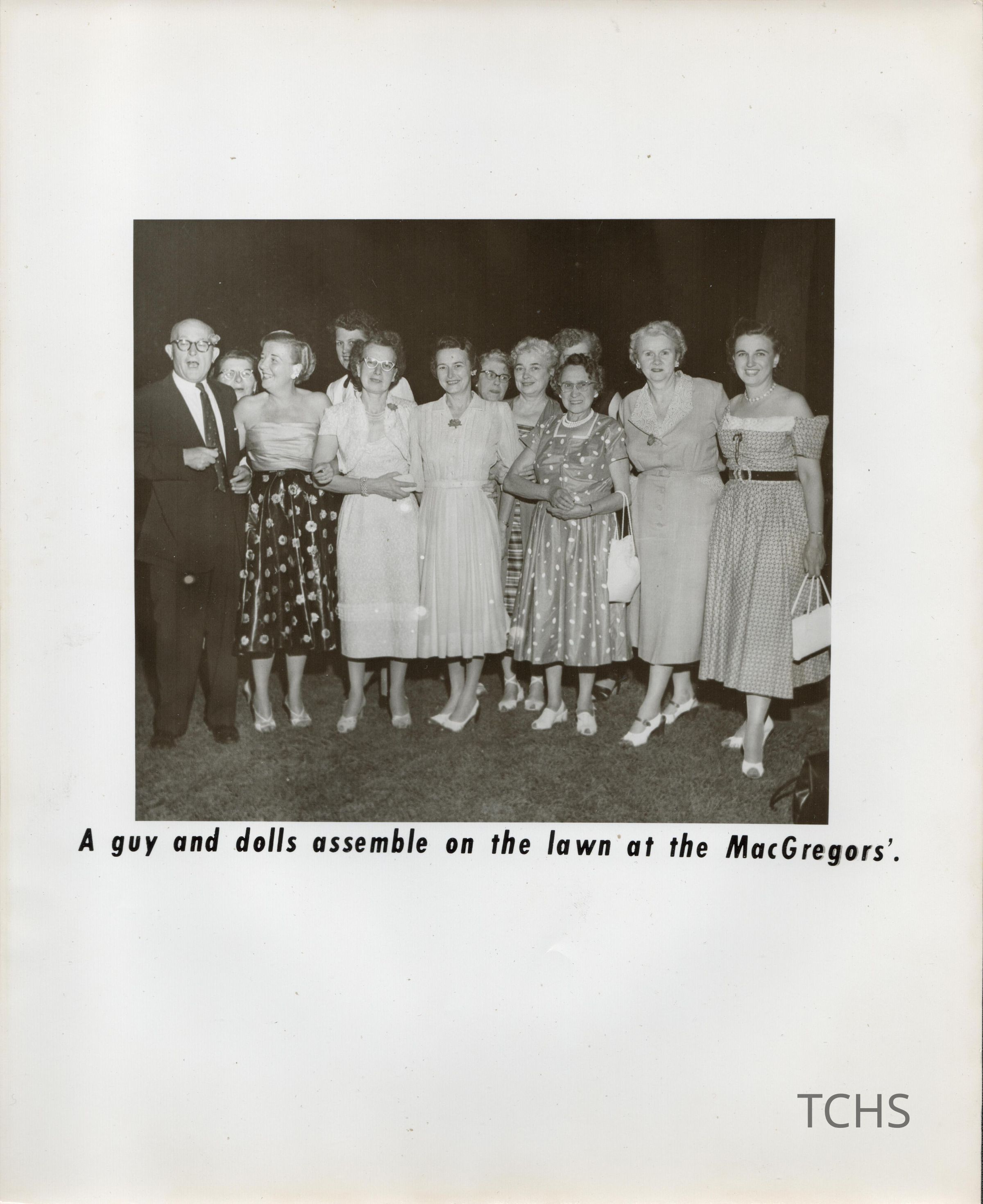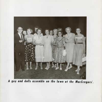 "A guy and dolls assemble on the lawn at the MacGregors"Collection