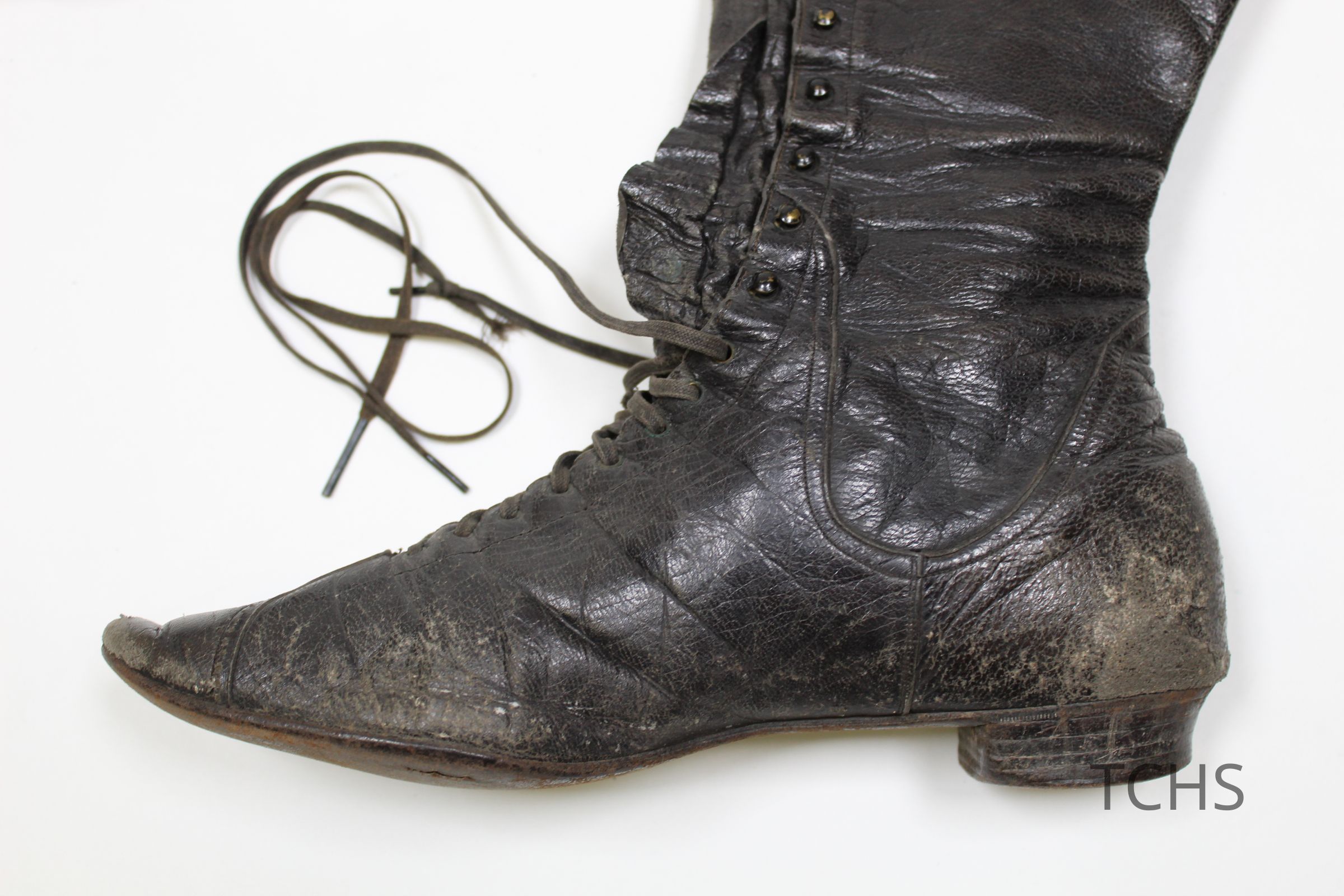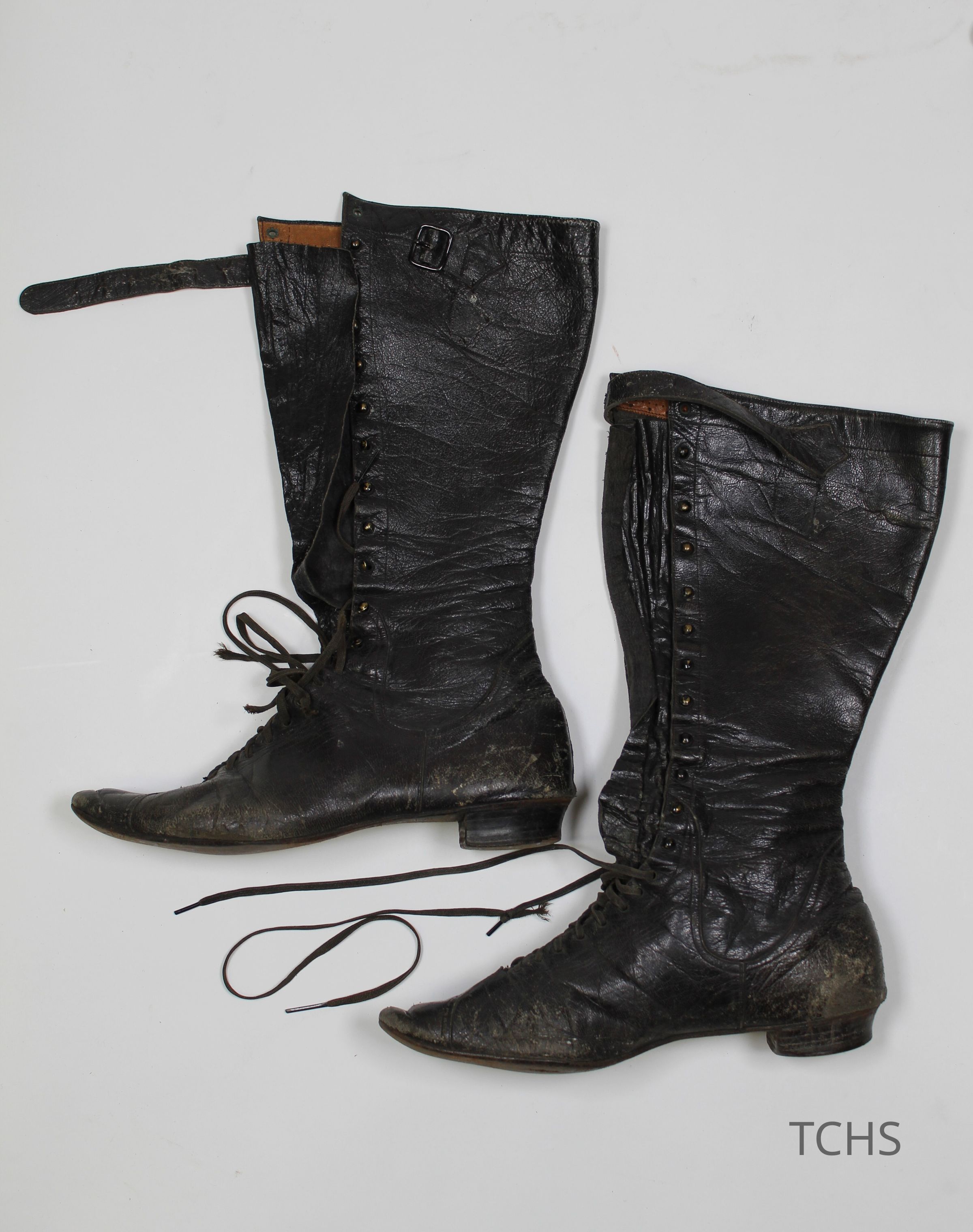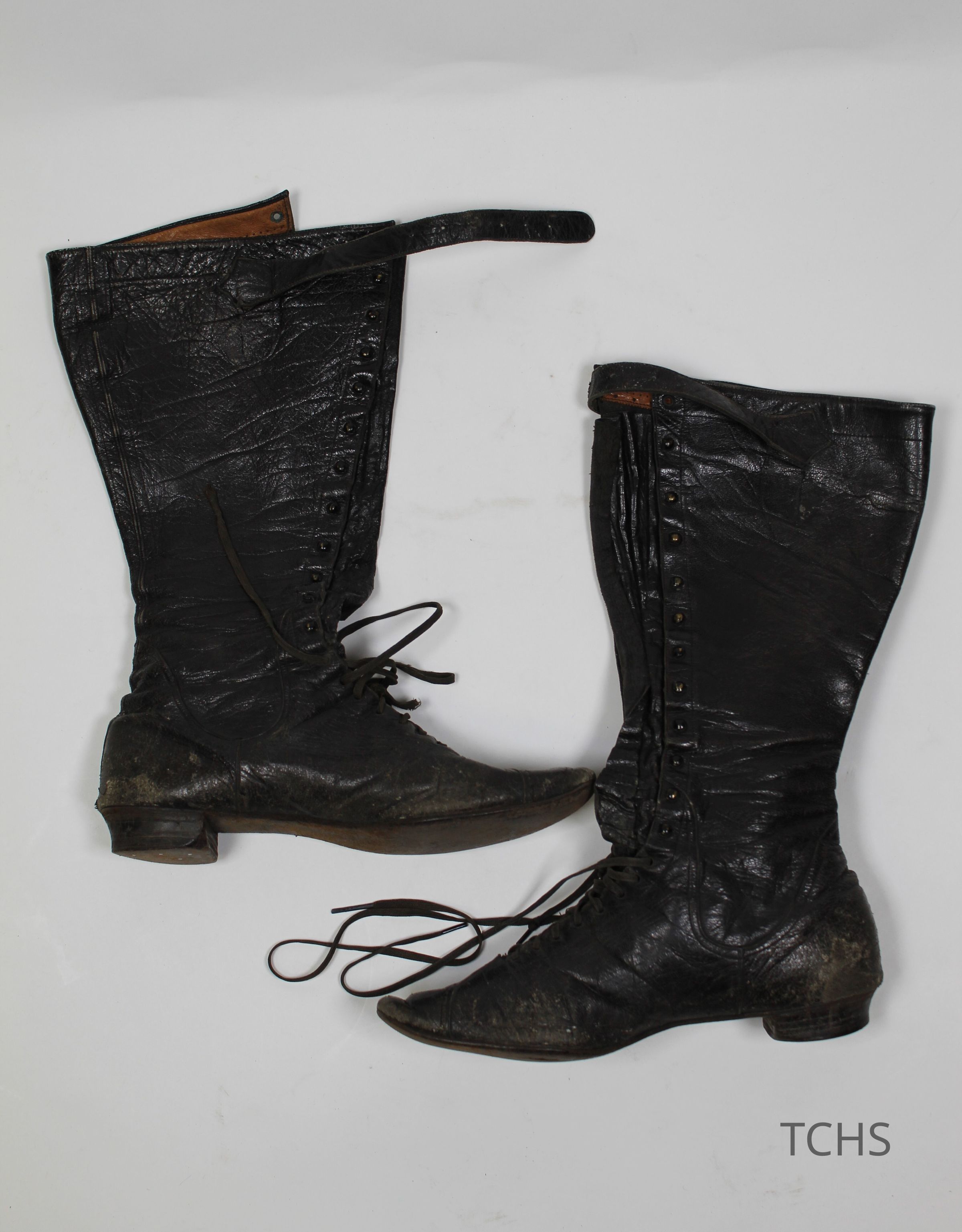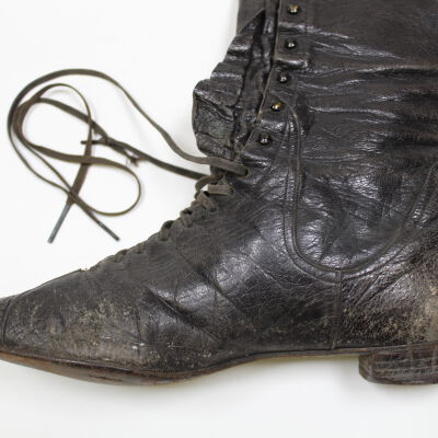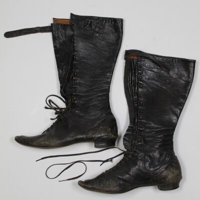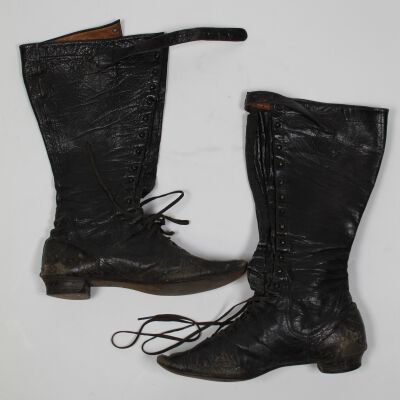 A pair of tall black lace up boots with a small heel.Acquisition