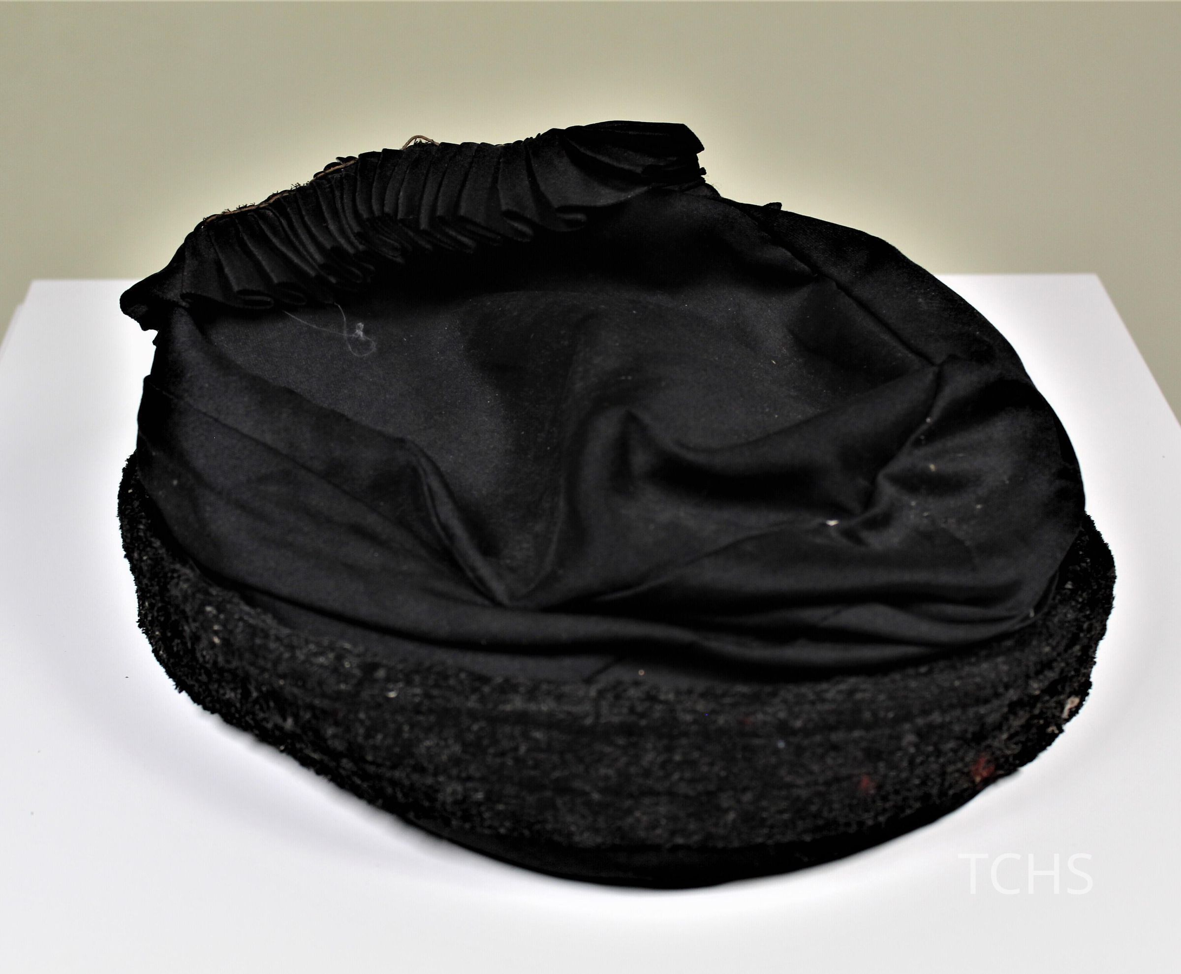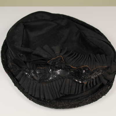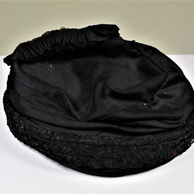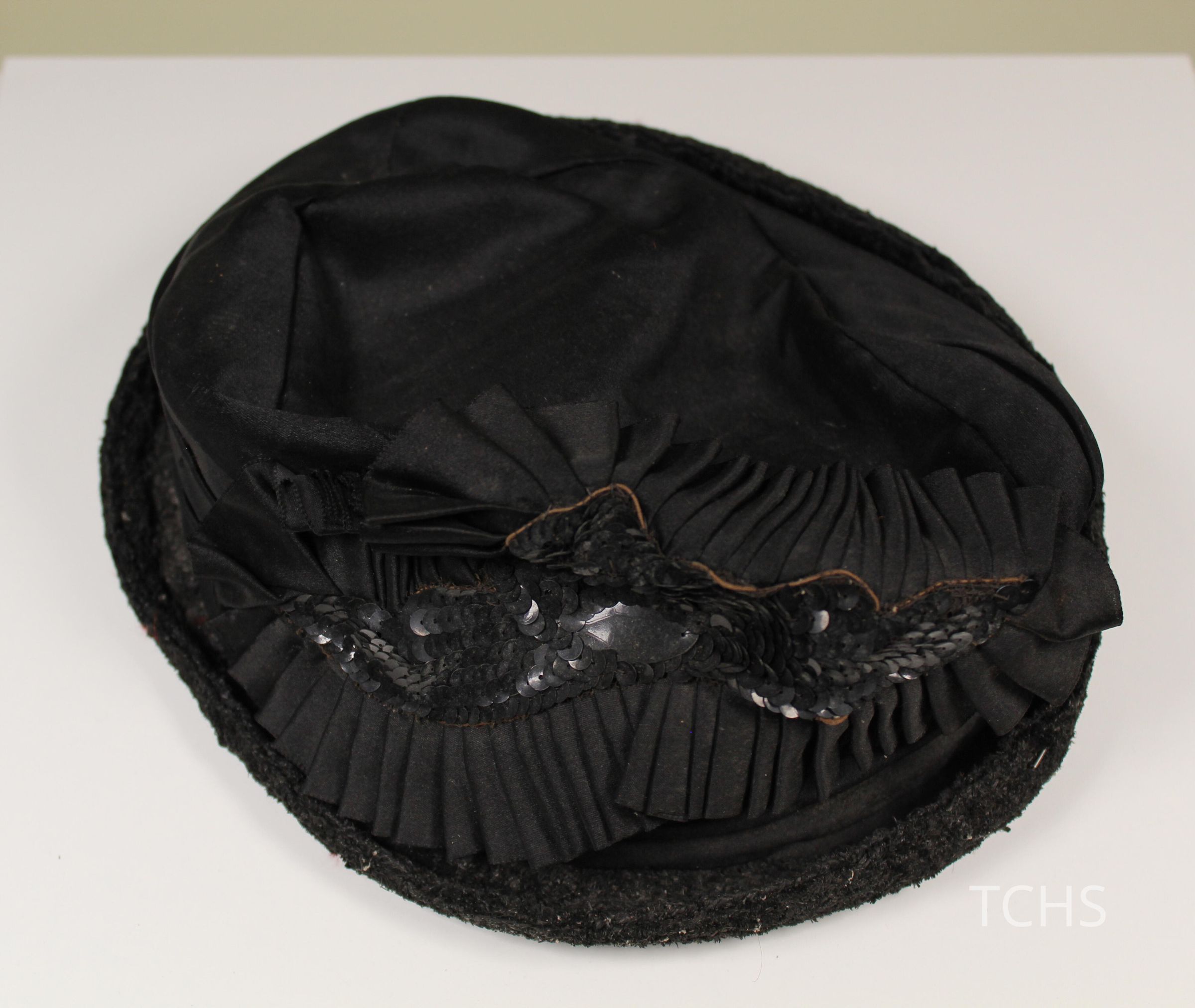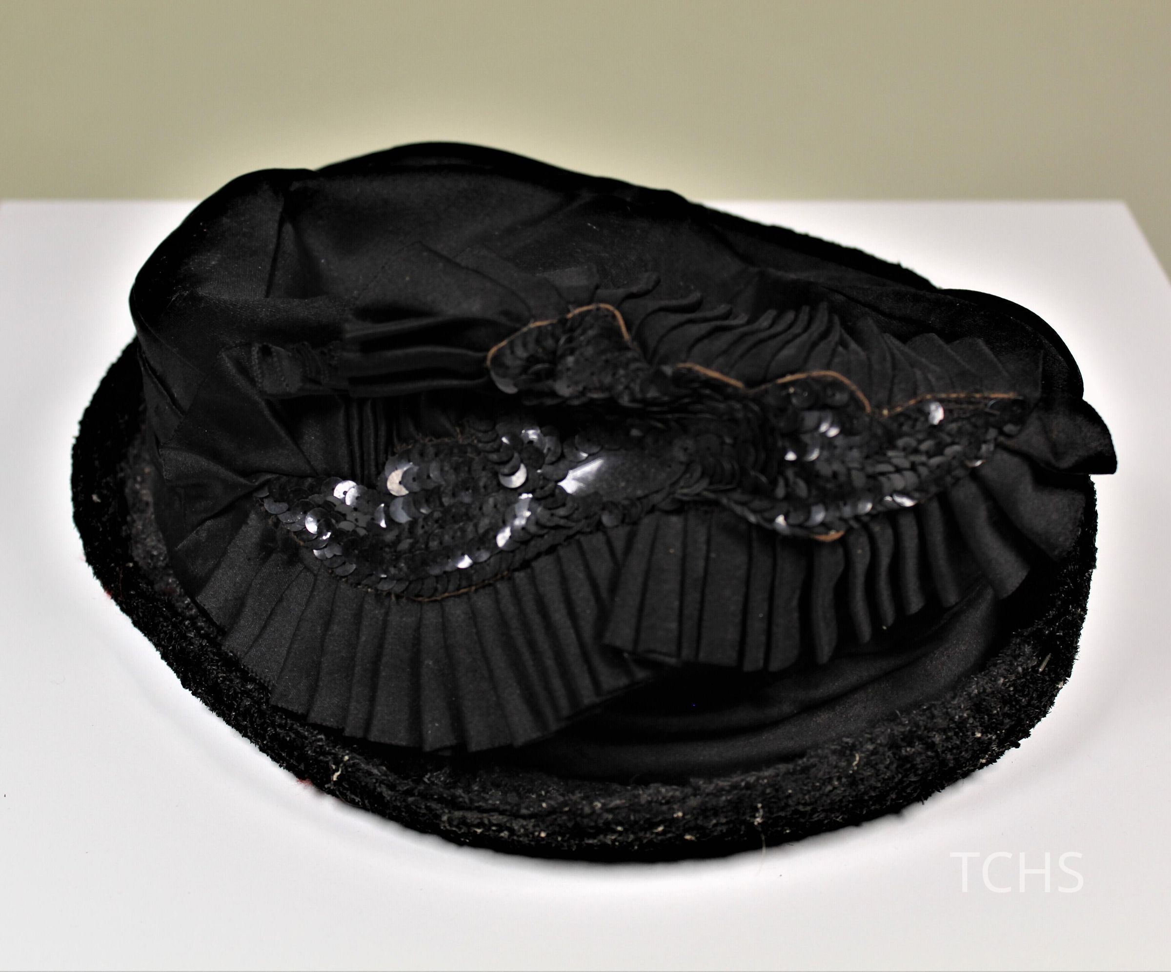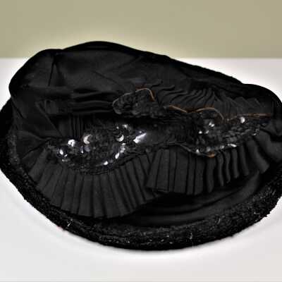 Black hat with black sequins and pleating in front.