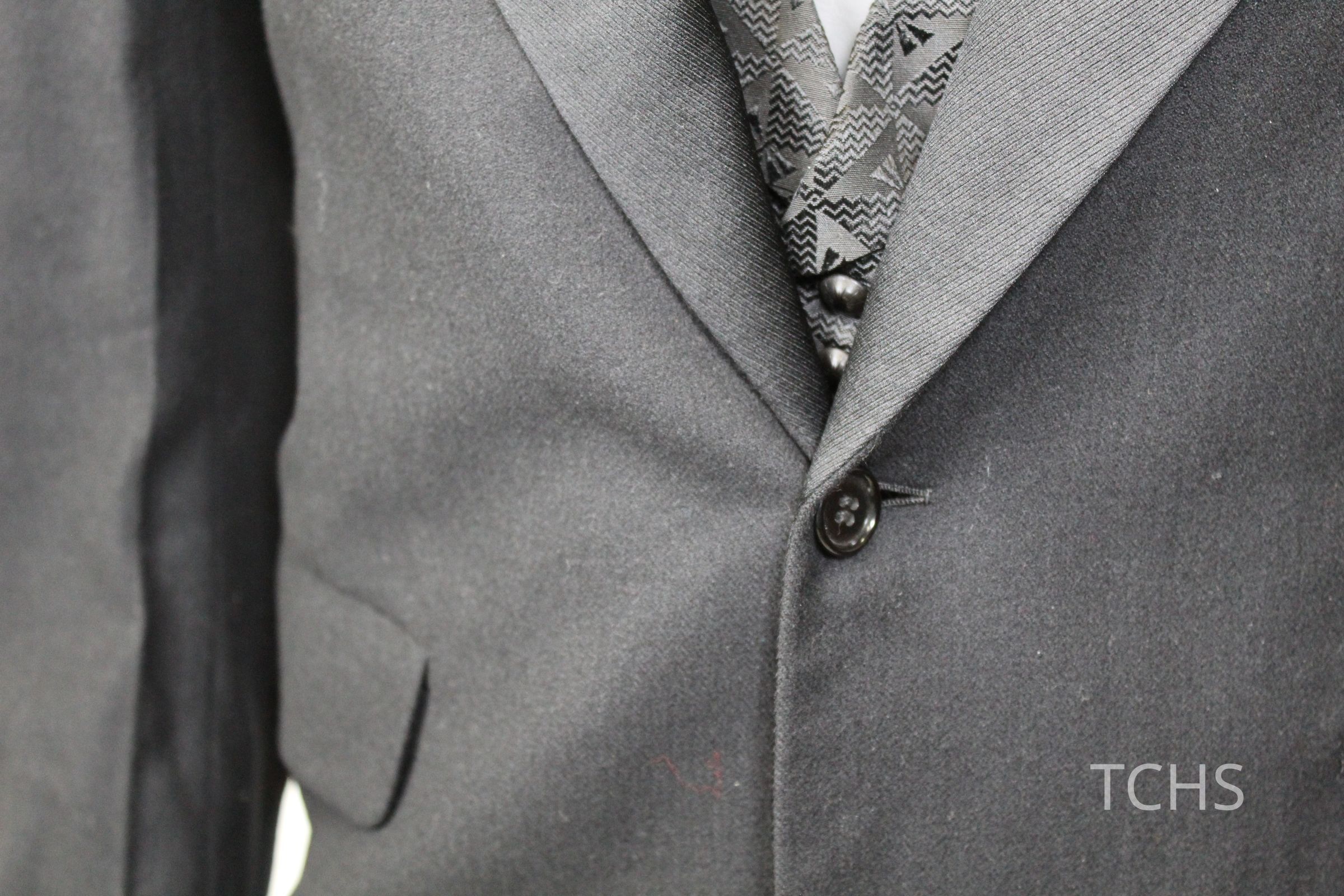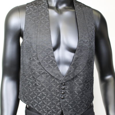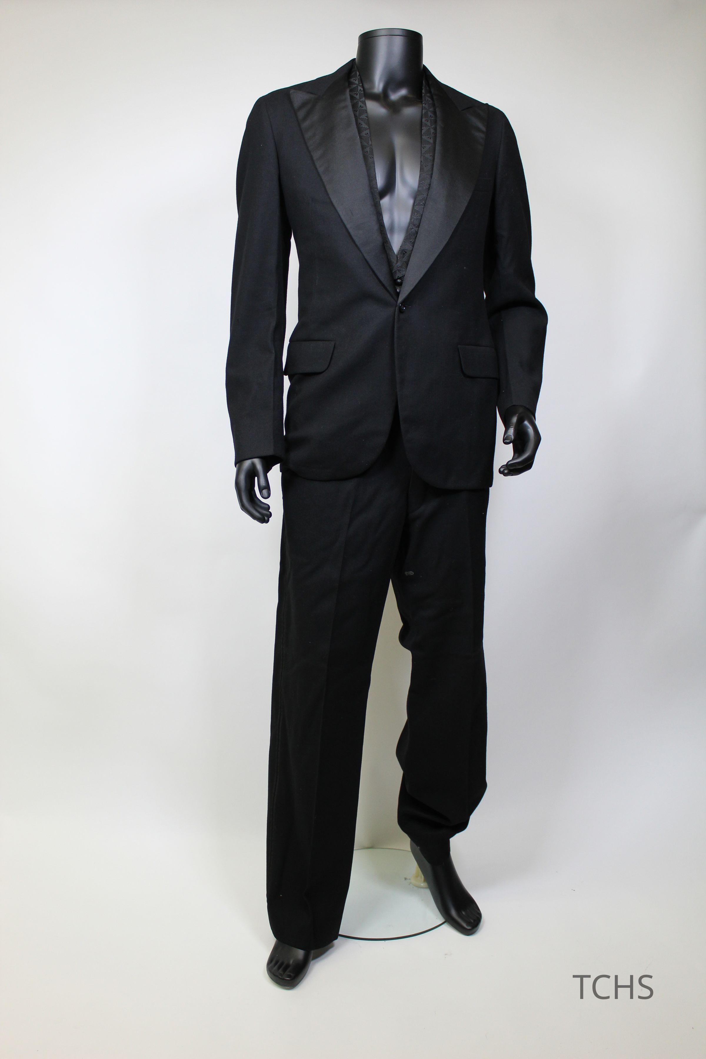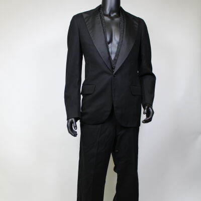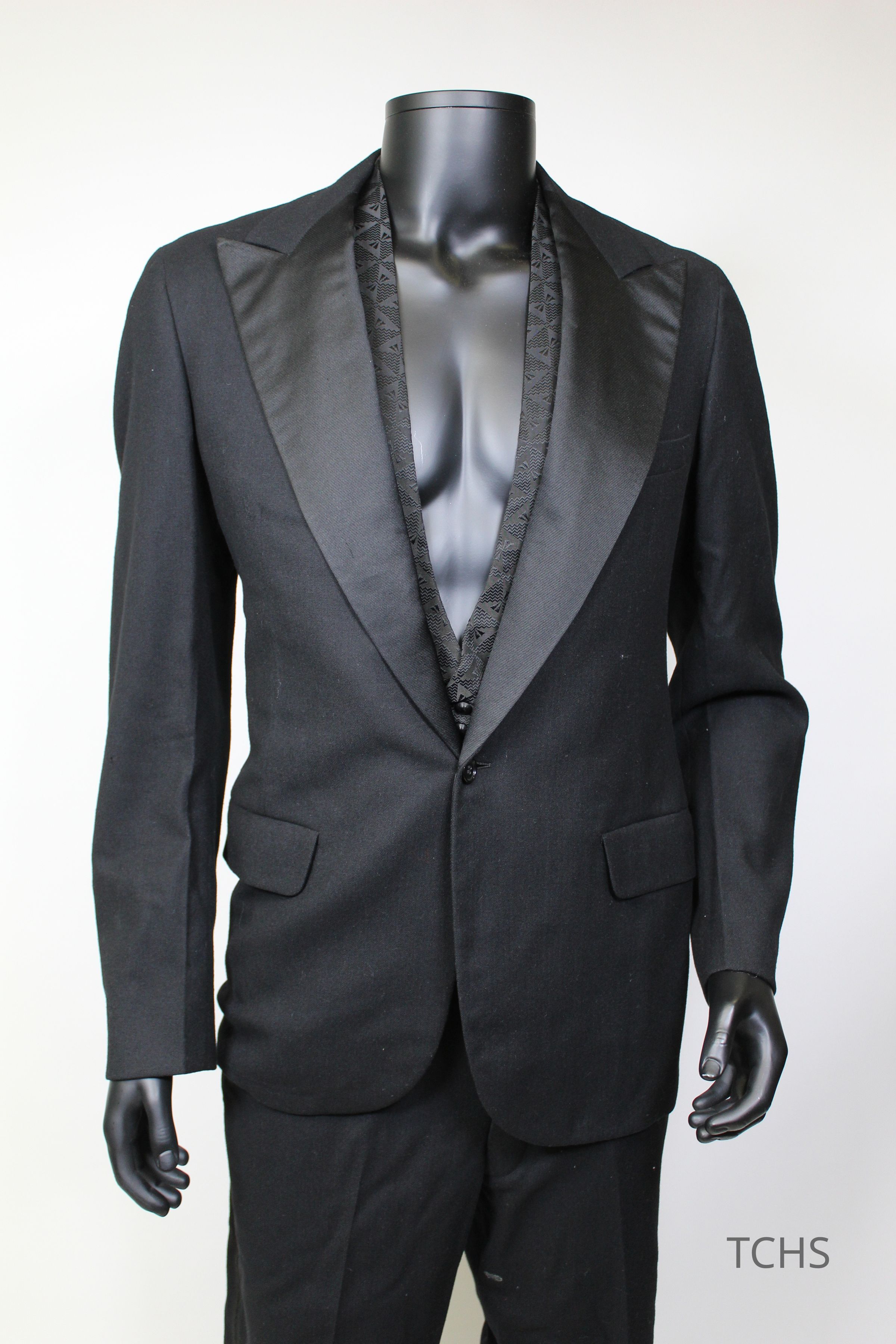 A three-piece suit including a suit jacket, vest, and pants. The vest is made of a fabric with a simple geometric pattern.Acquisition