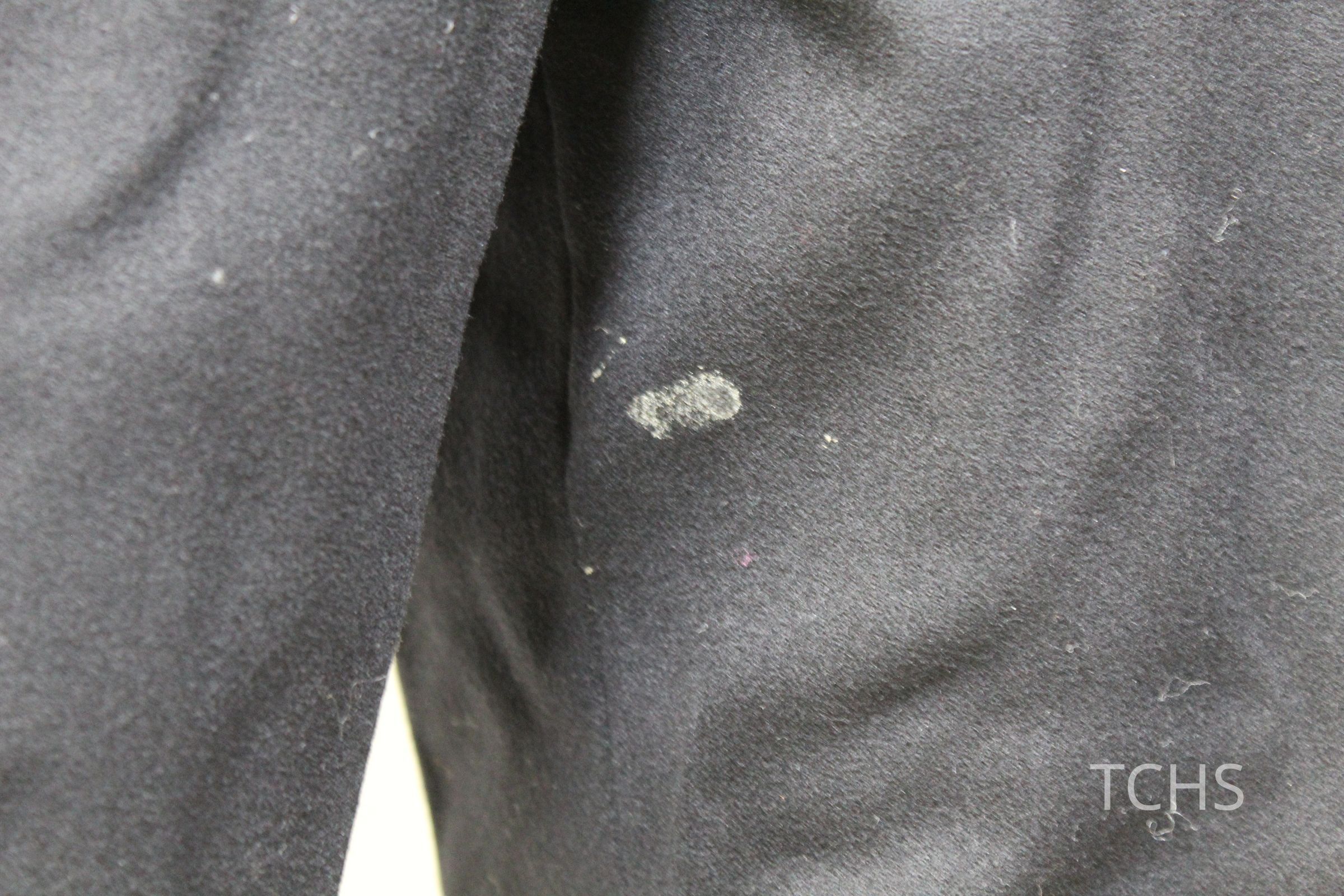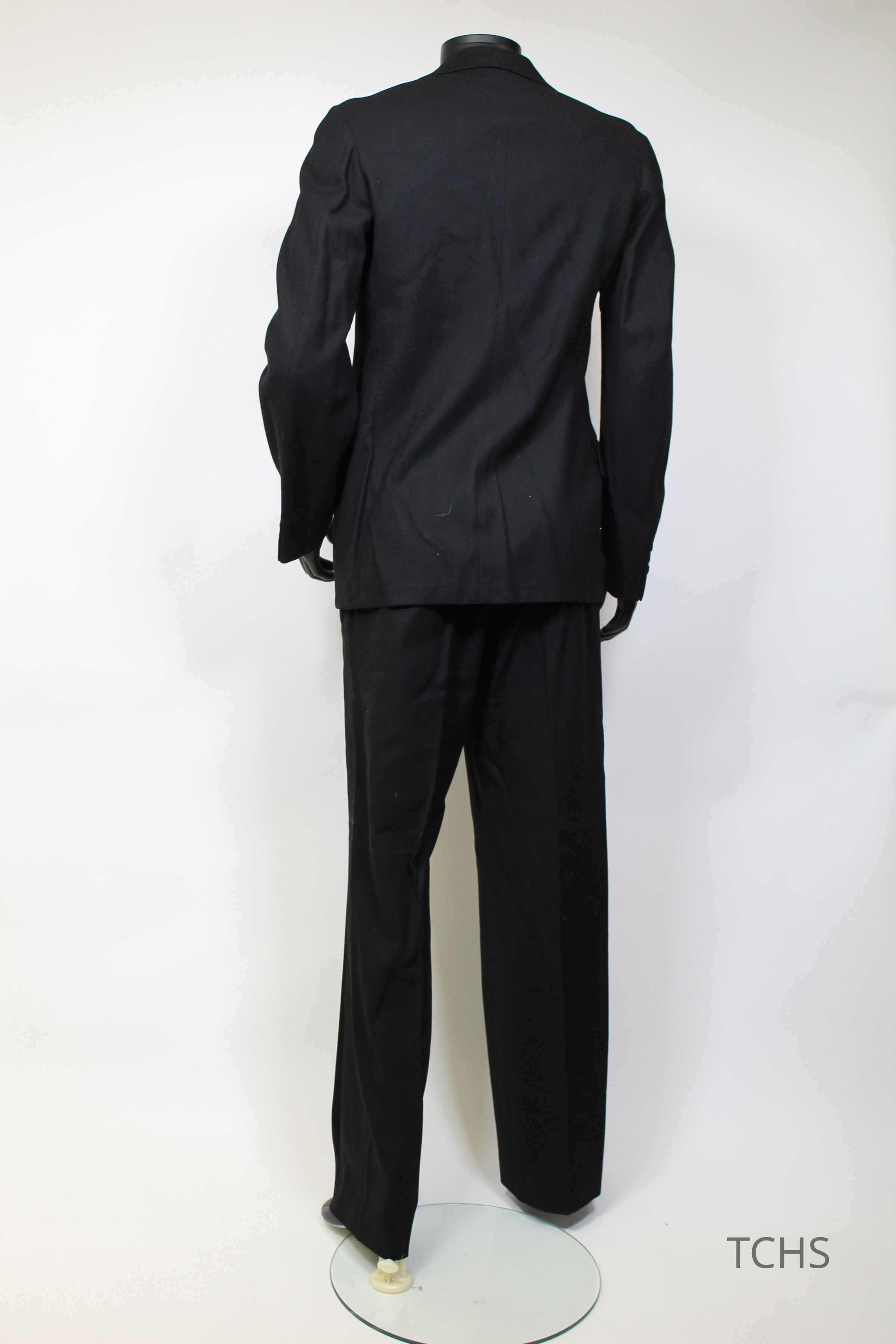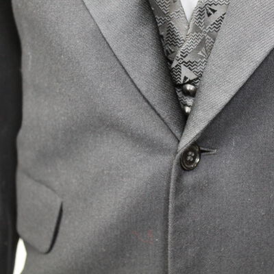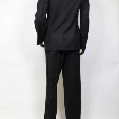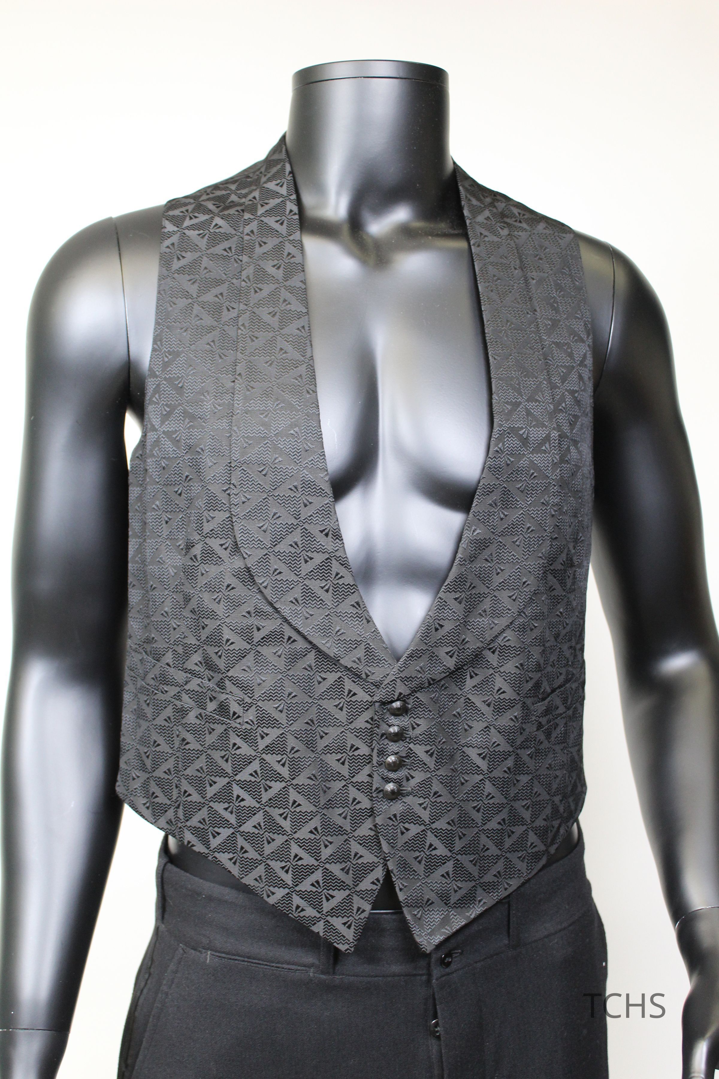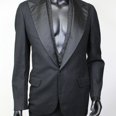 A three-piece suit including a suit jacket, vest, and pants. The vest is made of a fabric with a simple geometric pattern.Acquisition