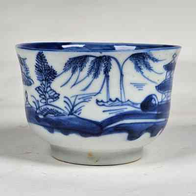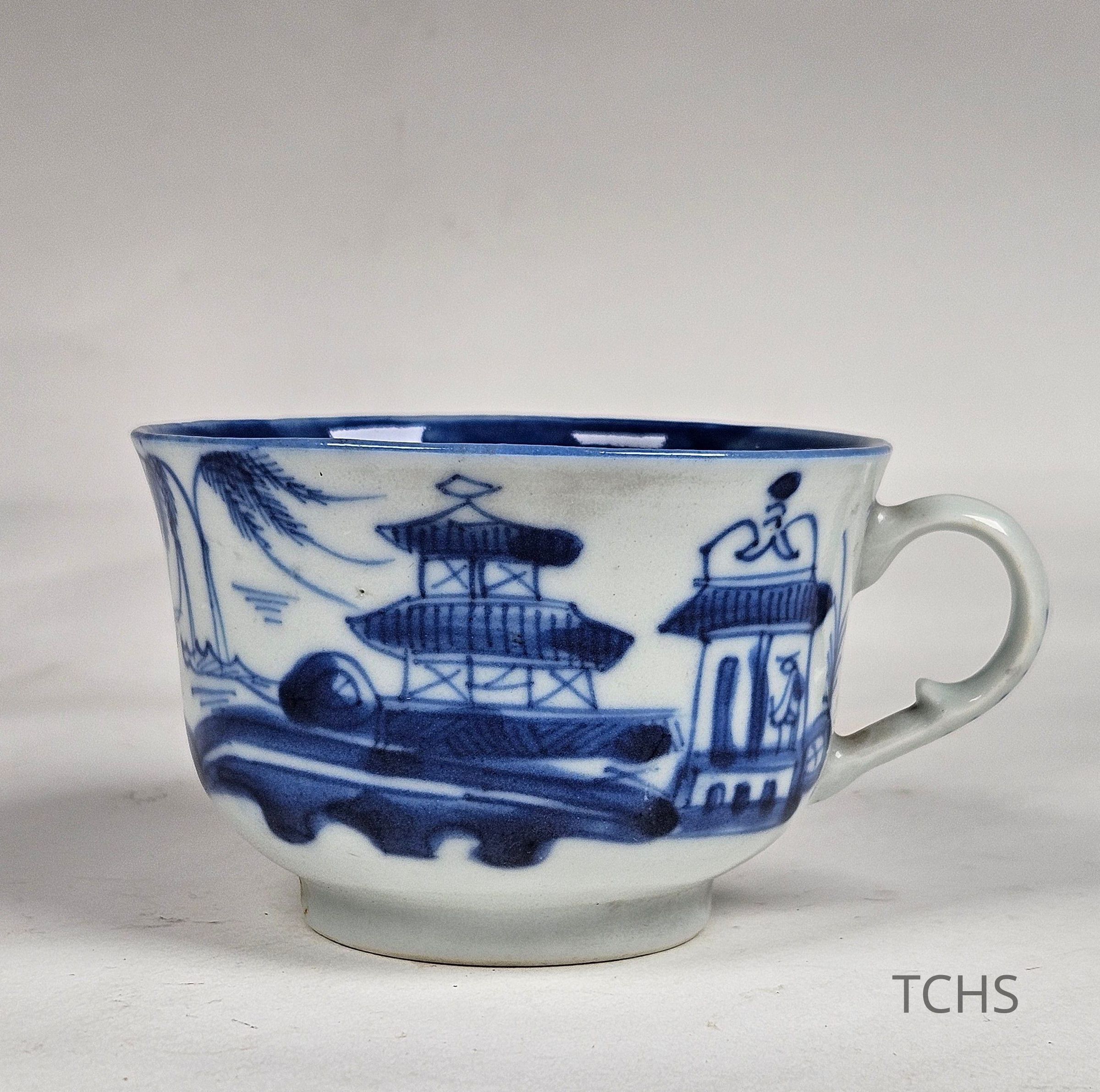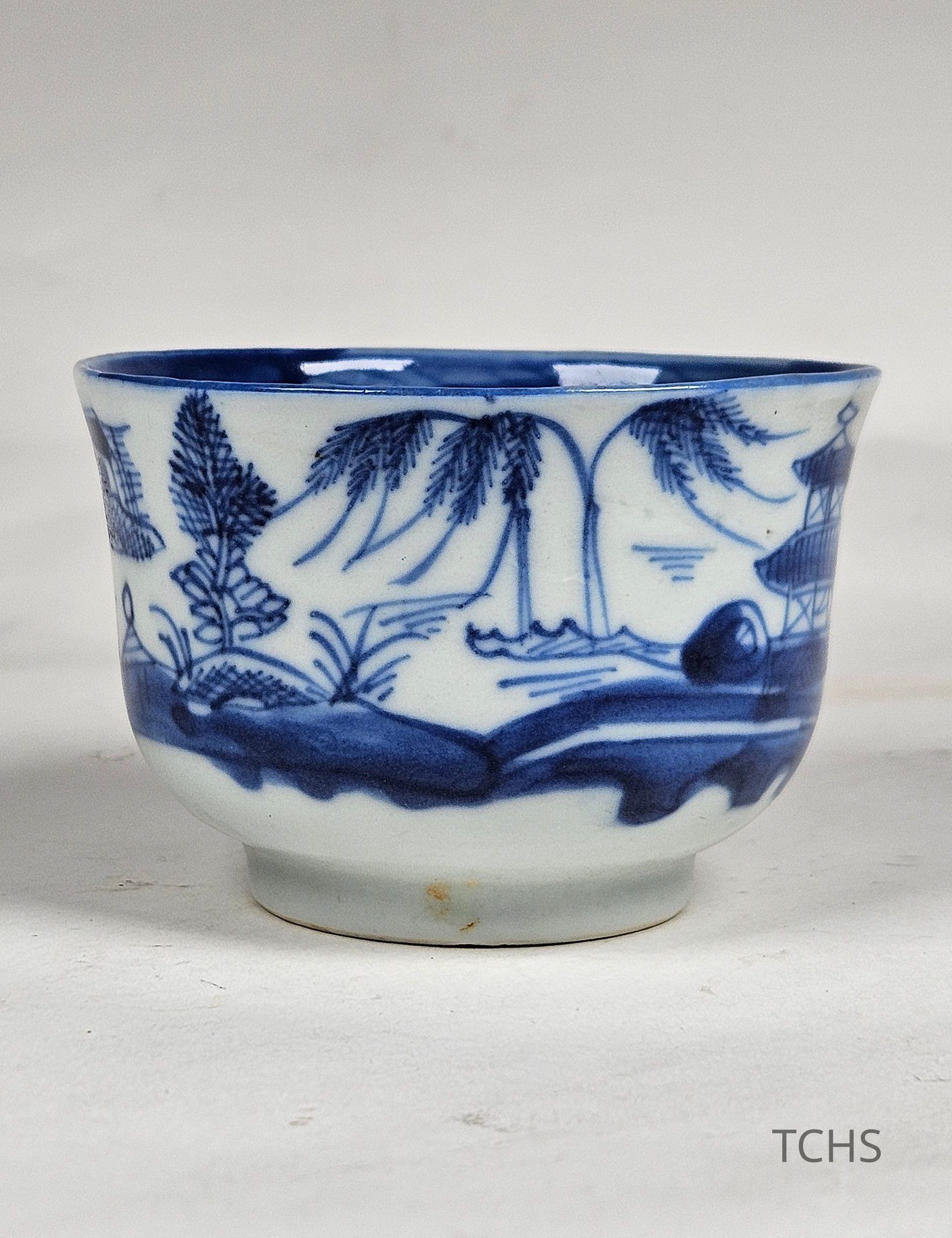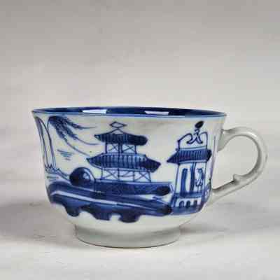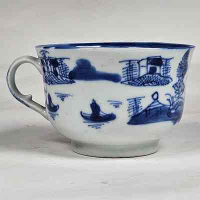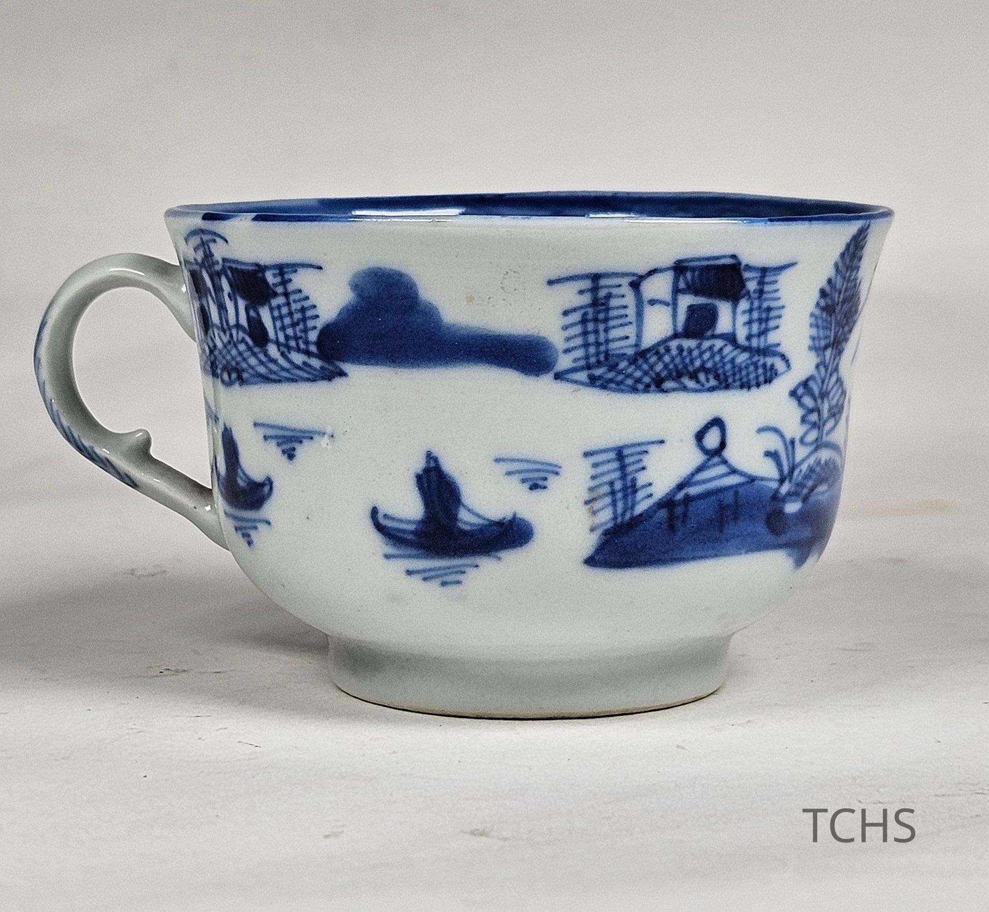 4 cups with handles, Blue Canton China Ware brought from China by John Miller, c.1810, and given to his daughter, Lydia Miller Edwards.Collection