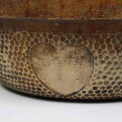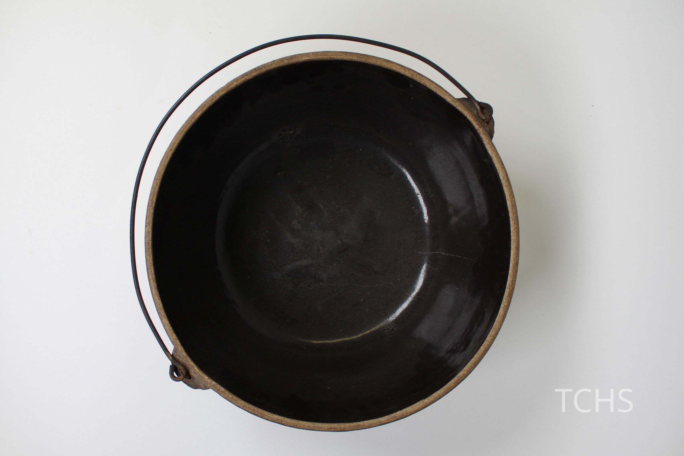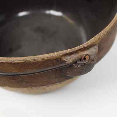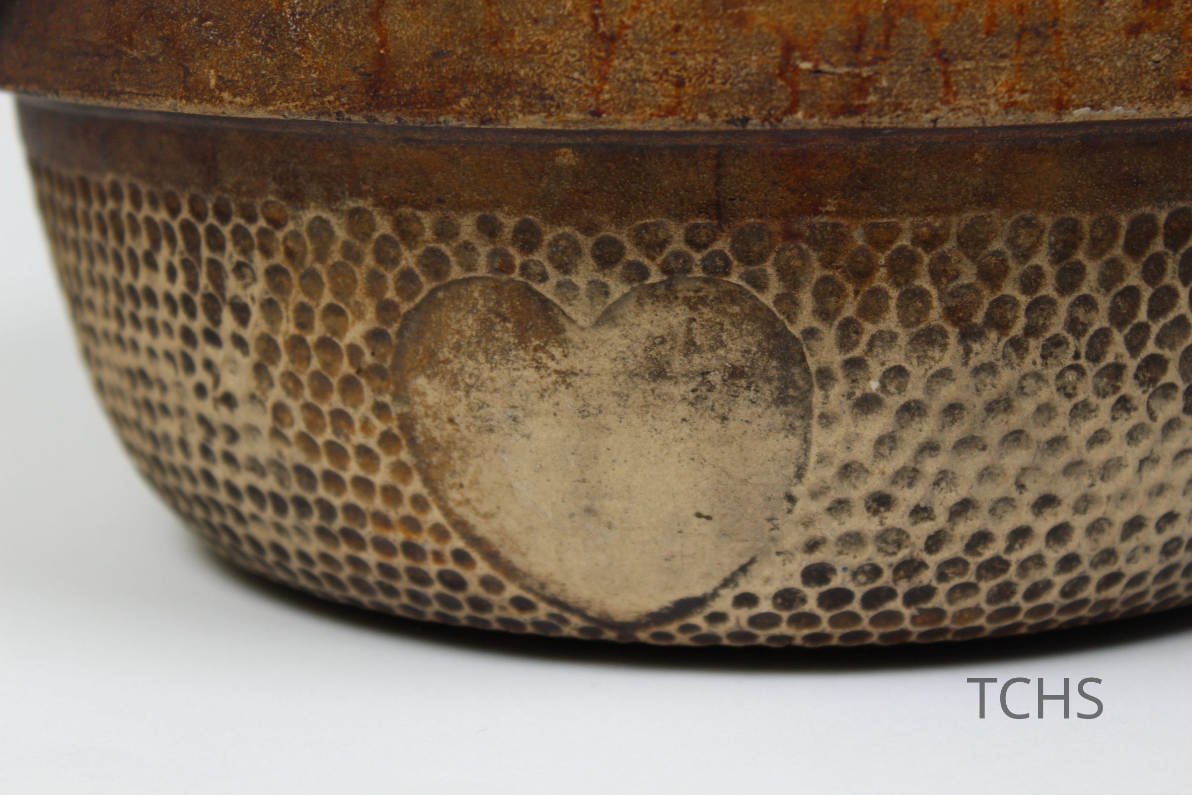 A brown ceramic bowl with a wire handle; on the side there is a dotted texture and hearts.Location