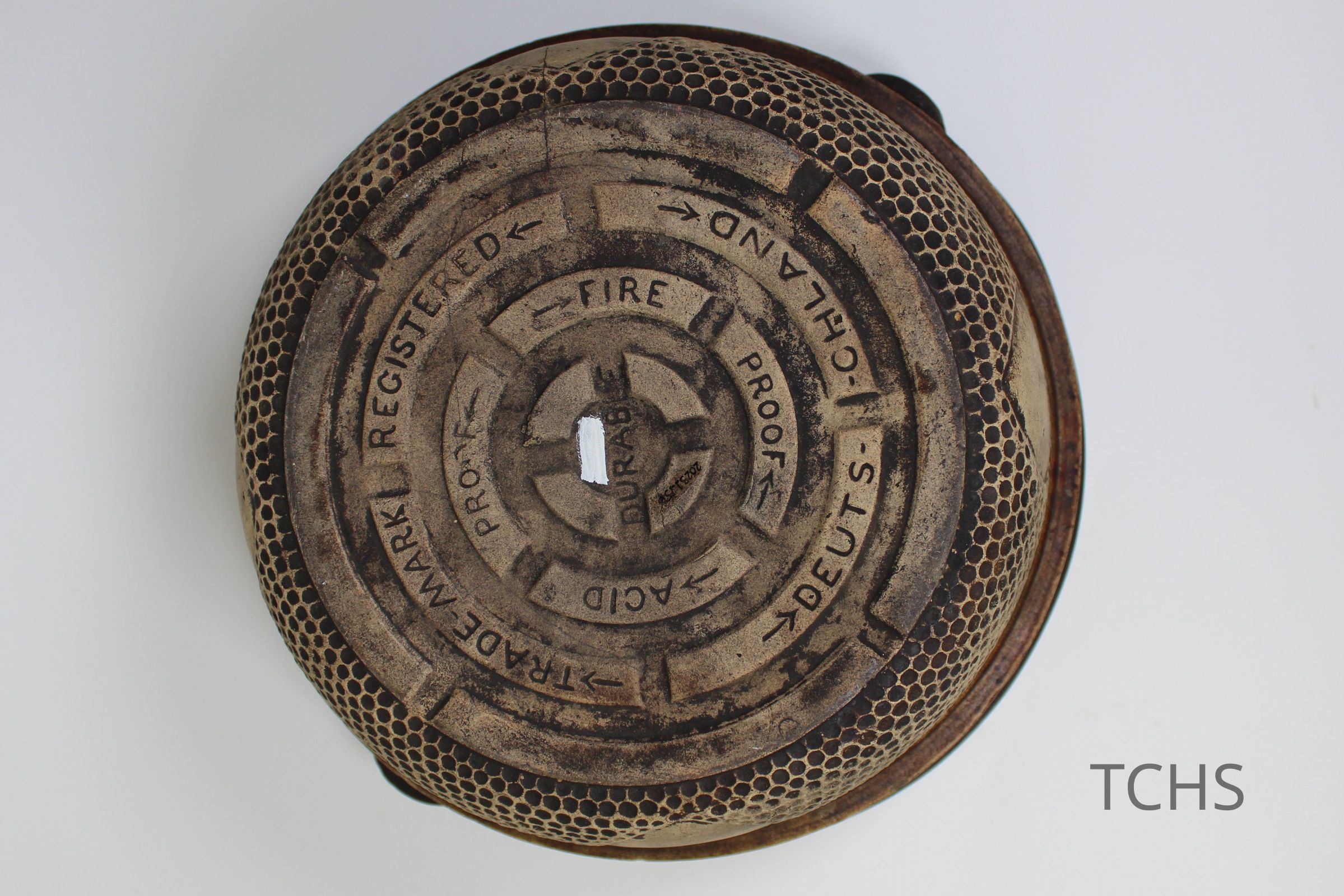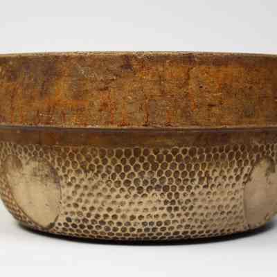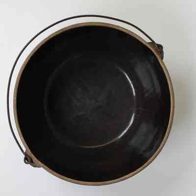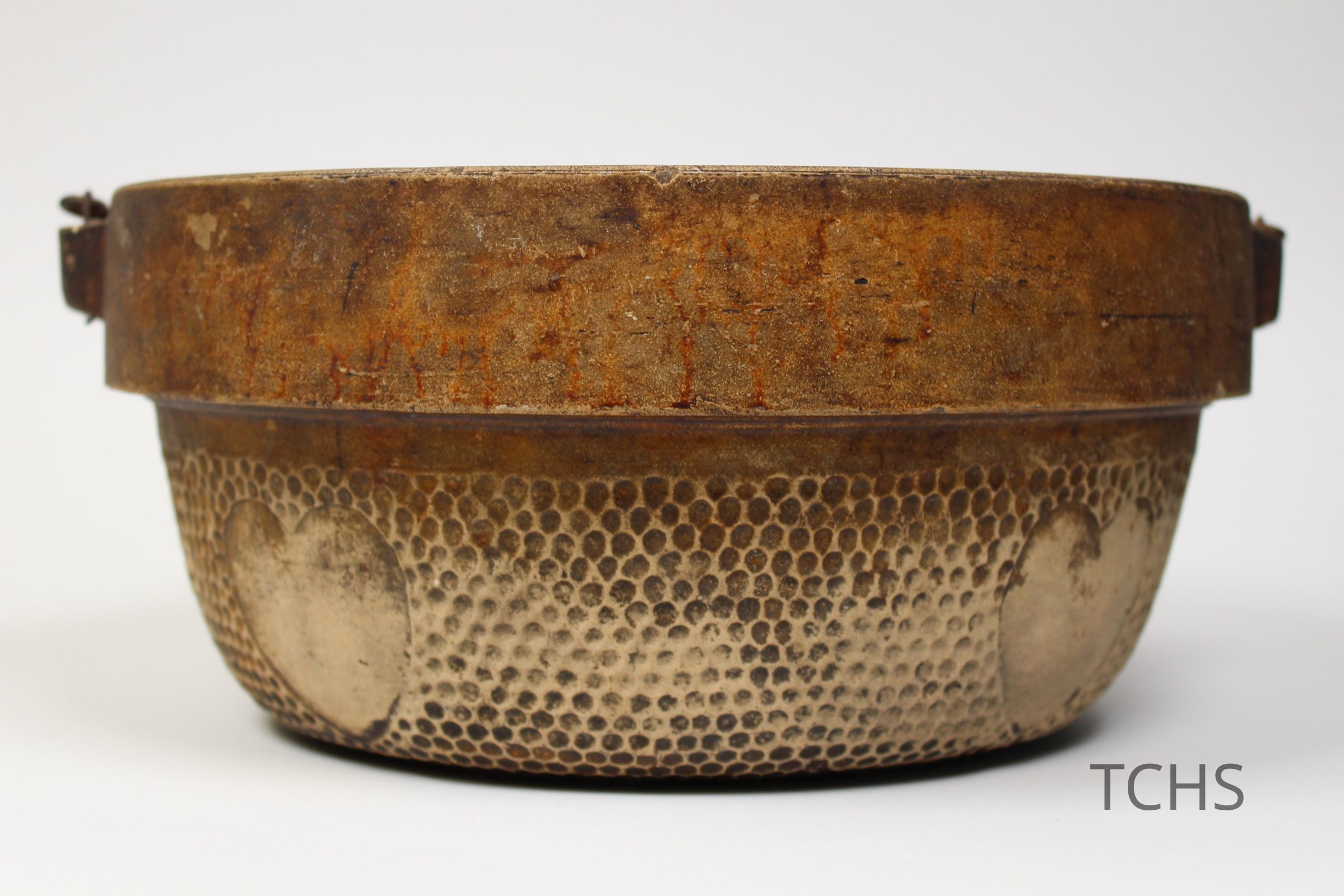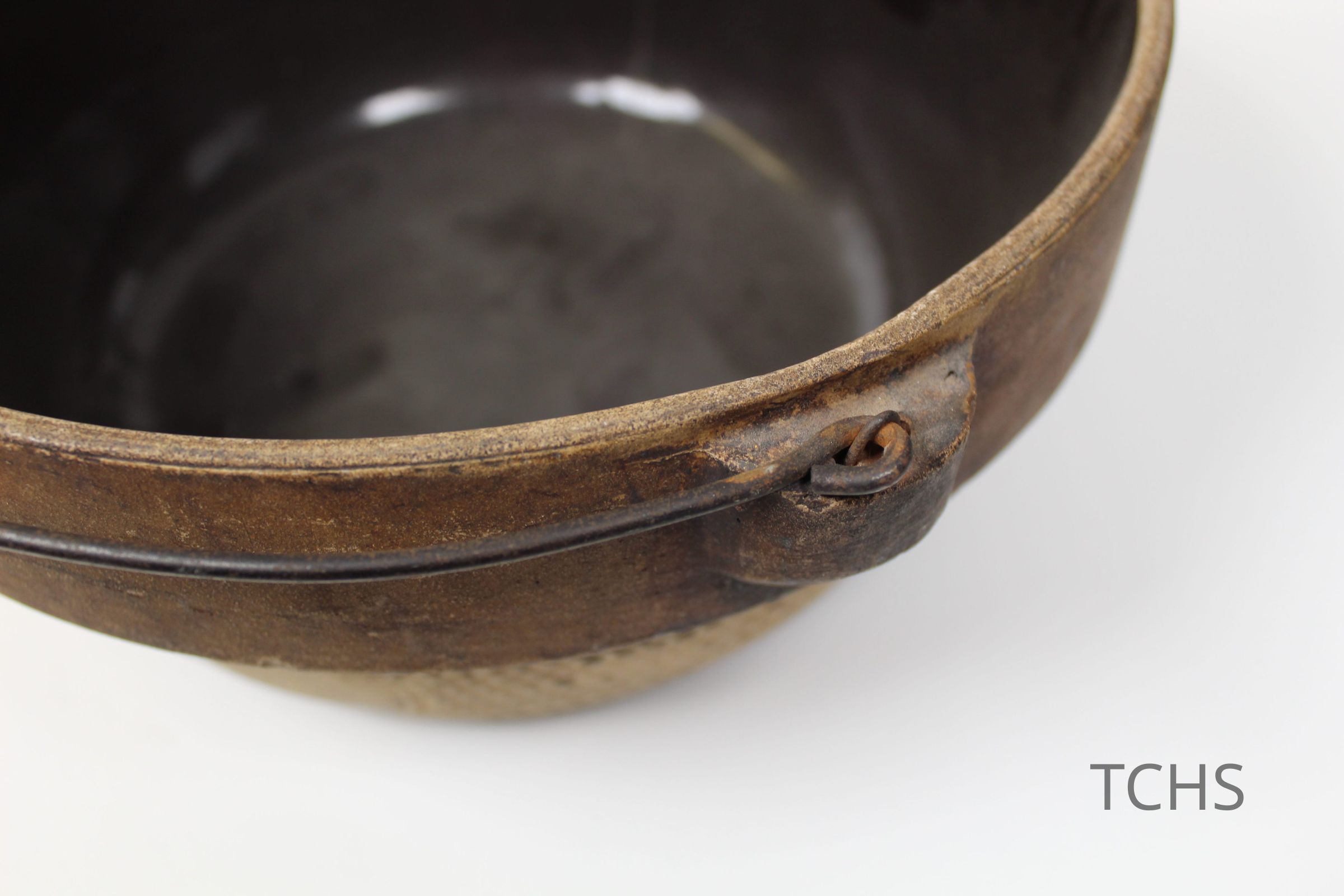 A brown ceramic bowl with a wire handle; on the side there is a dotted texture and hearts.Location