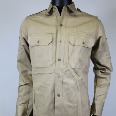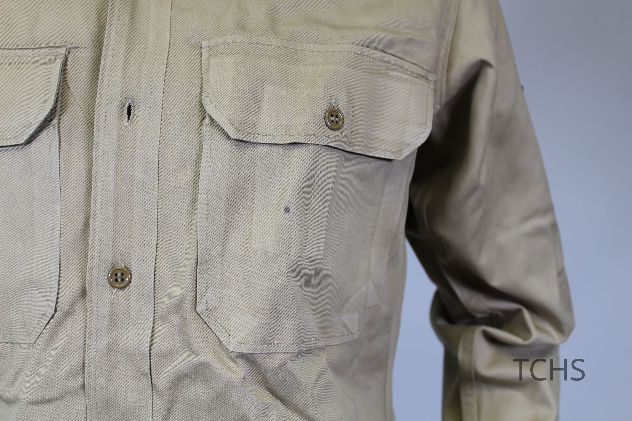 Korean War tan uniform shirt belonging to D. Boye. B-4913 is written on the inside.Acquisition