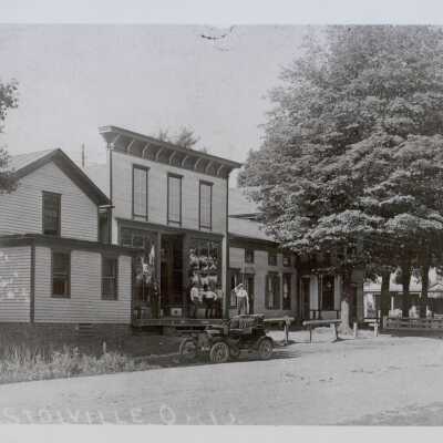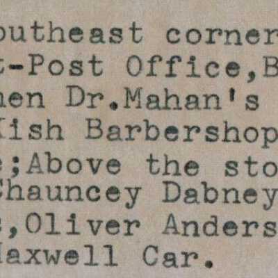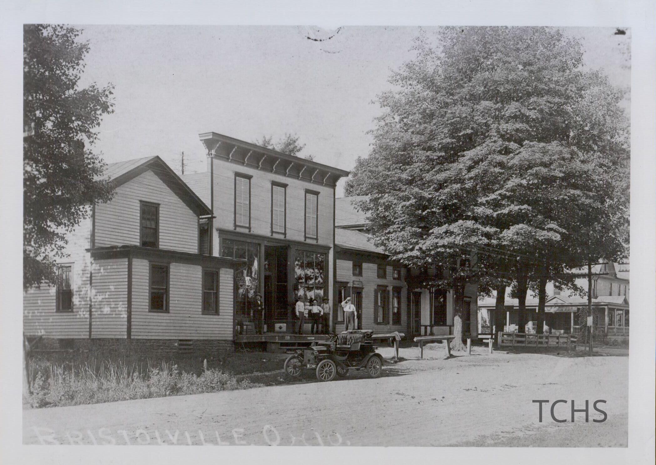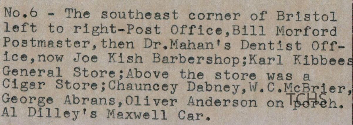 "The southeast corner of Bristol left to right - Post Office, Bill Morford Postmaster, then Dr. Mahan's Dentist office, now Joe Kish Barbershop; Karl Kibbee's General Store; Above the store was a Cigar Store; Chauncey Dabney, W. C. McBrier, George Abrans, Oliver Anderson on porch. Al Dilley's Maxwell Car."