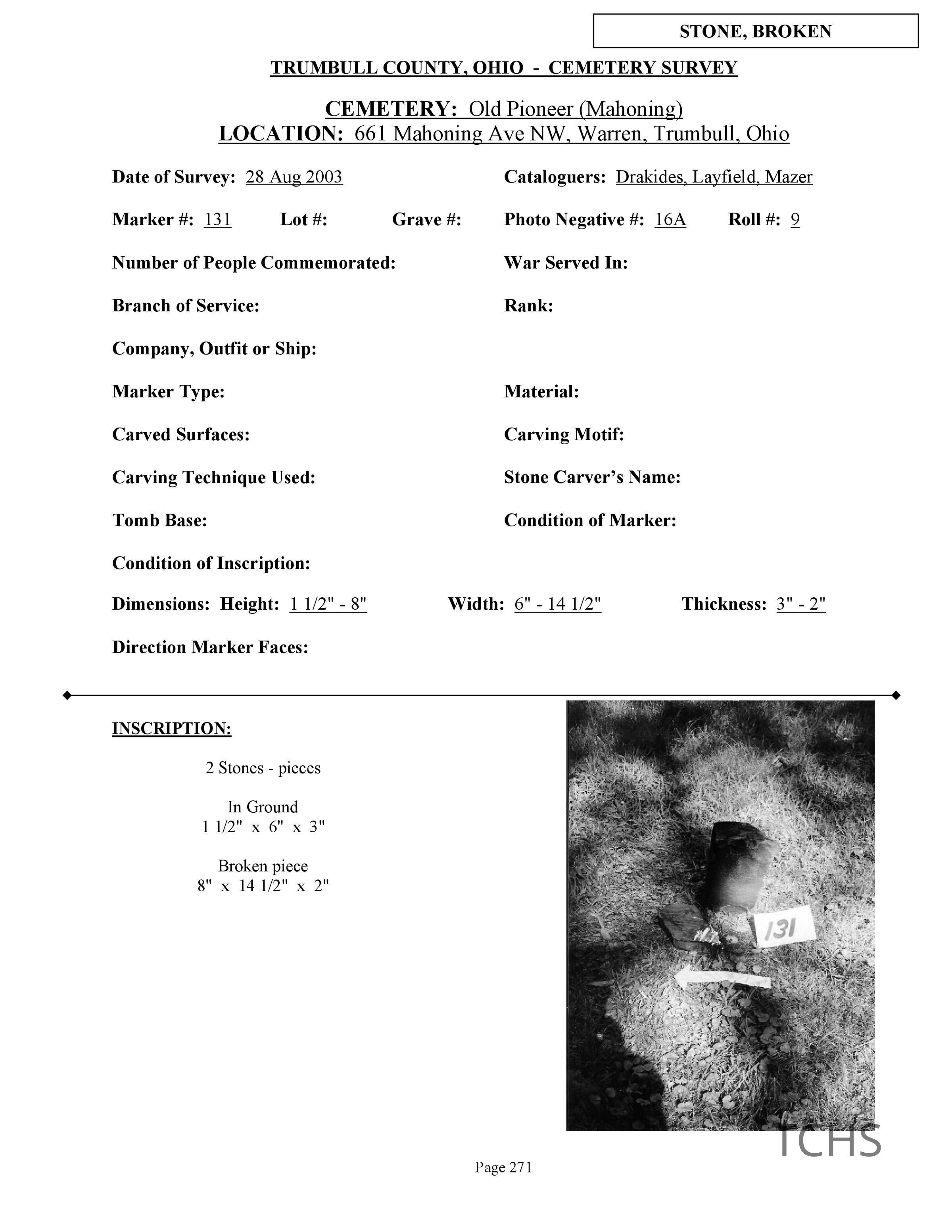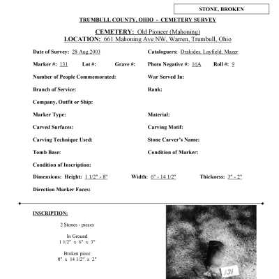 This page was compiled by the Trumbull County Genealogical Society during a 2002-2004 survey of Old Mahoning Cemetery.