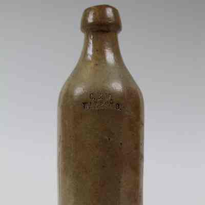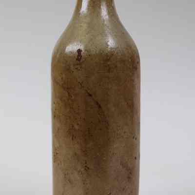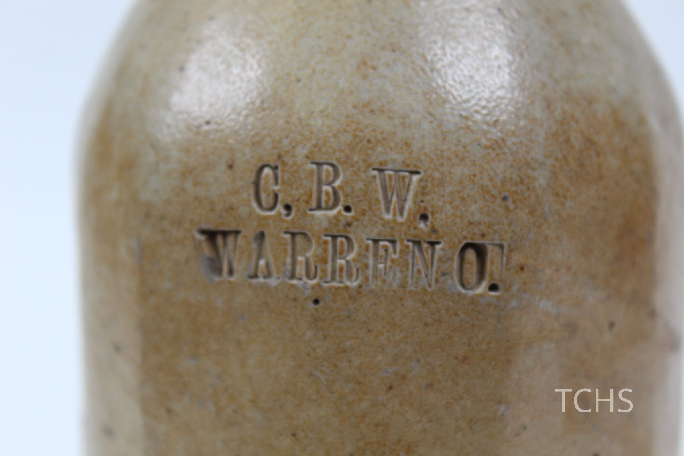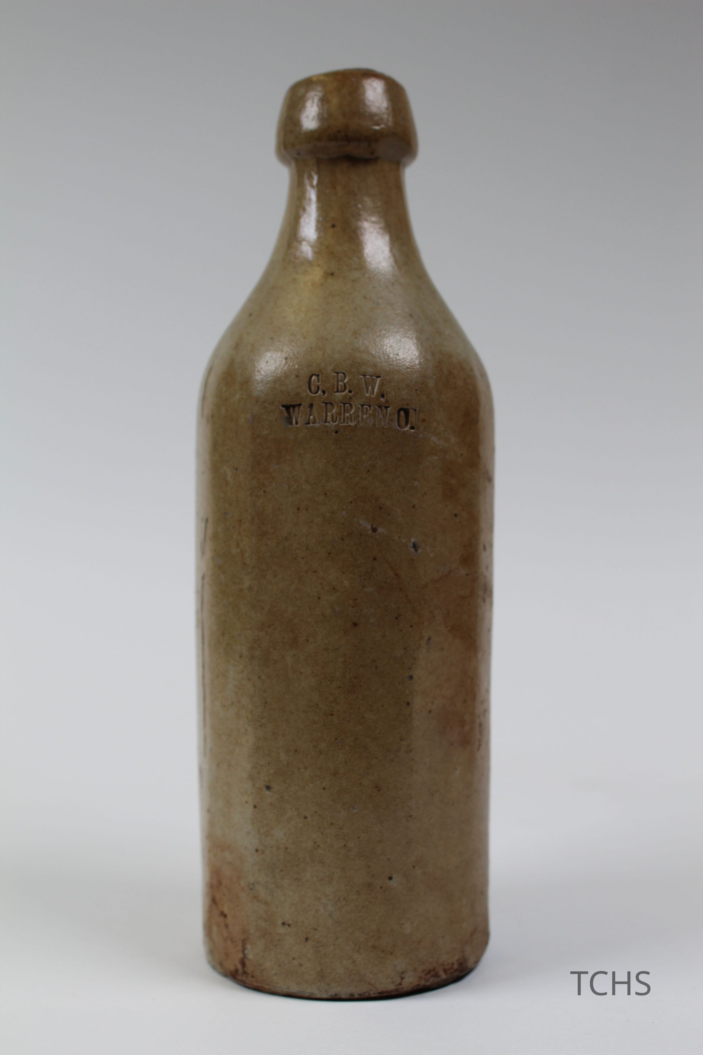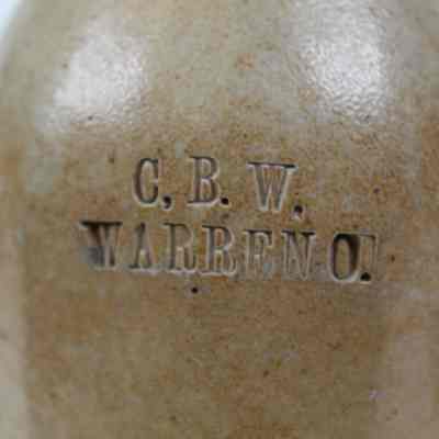 A long-necked ceramic bottle with 'C.B.W. Warren, O.' etched into it.Collection