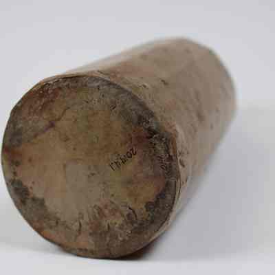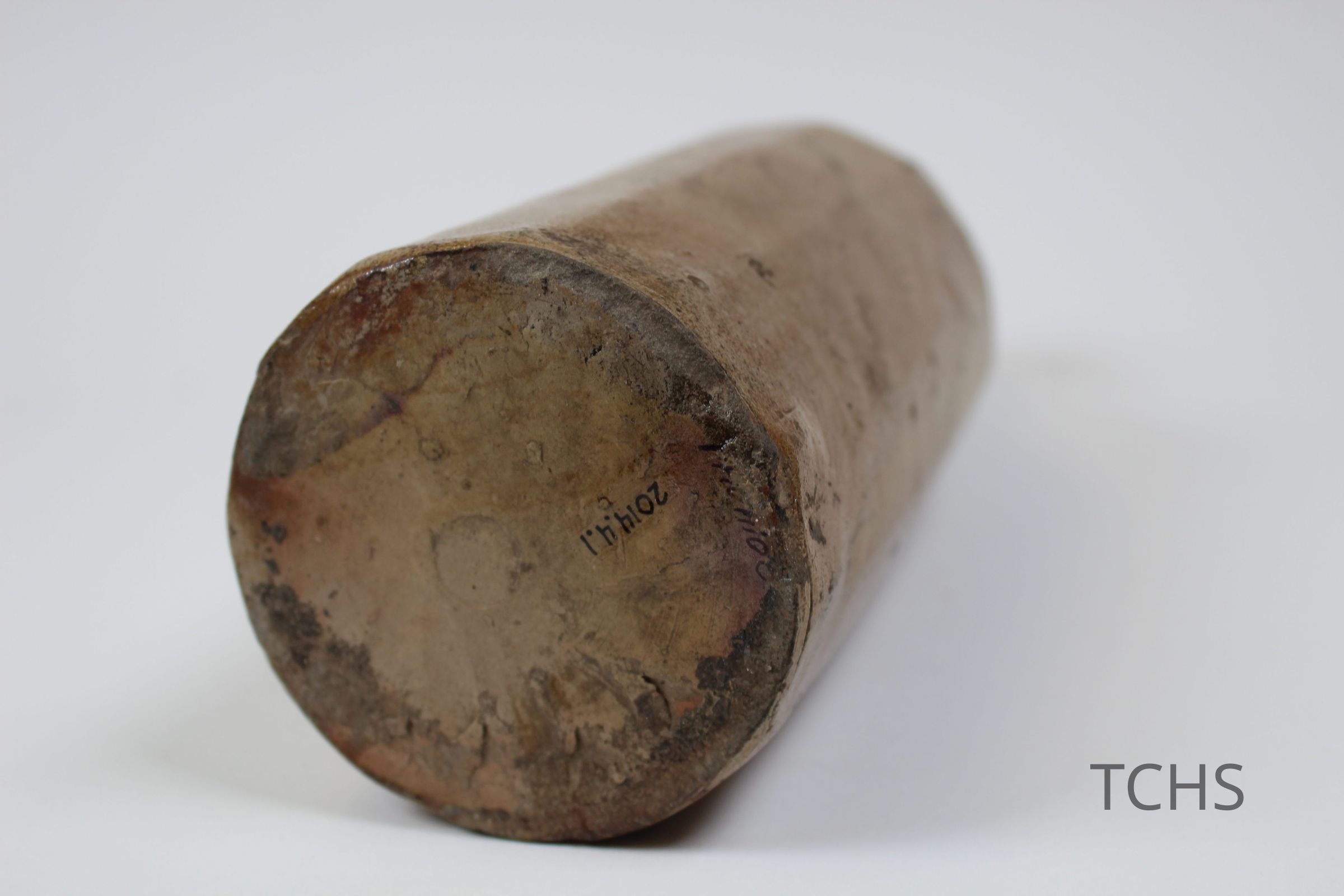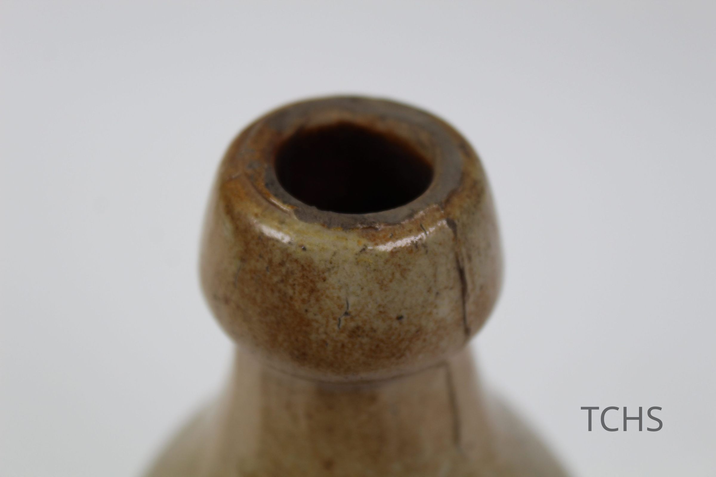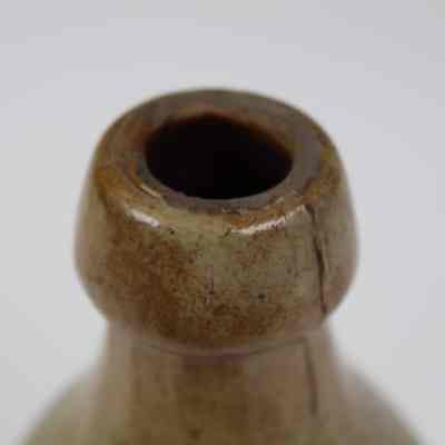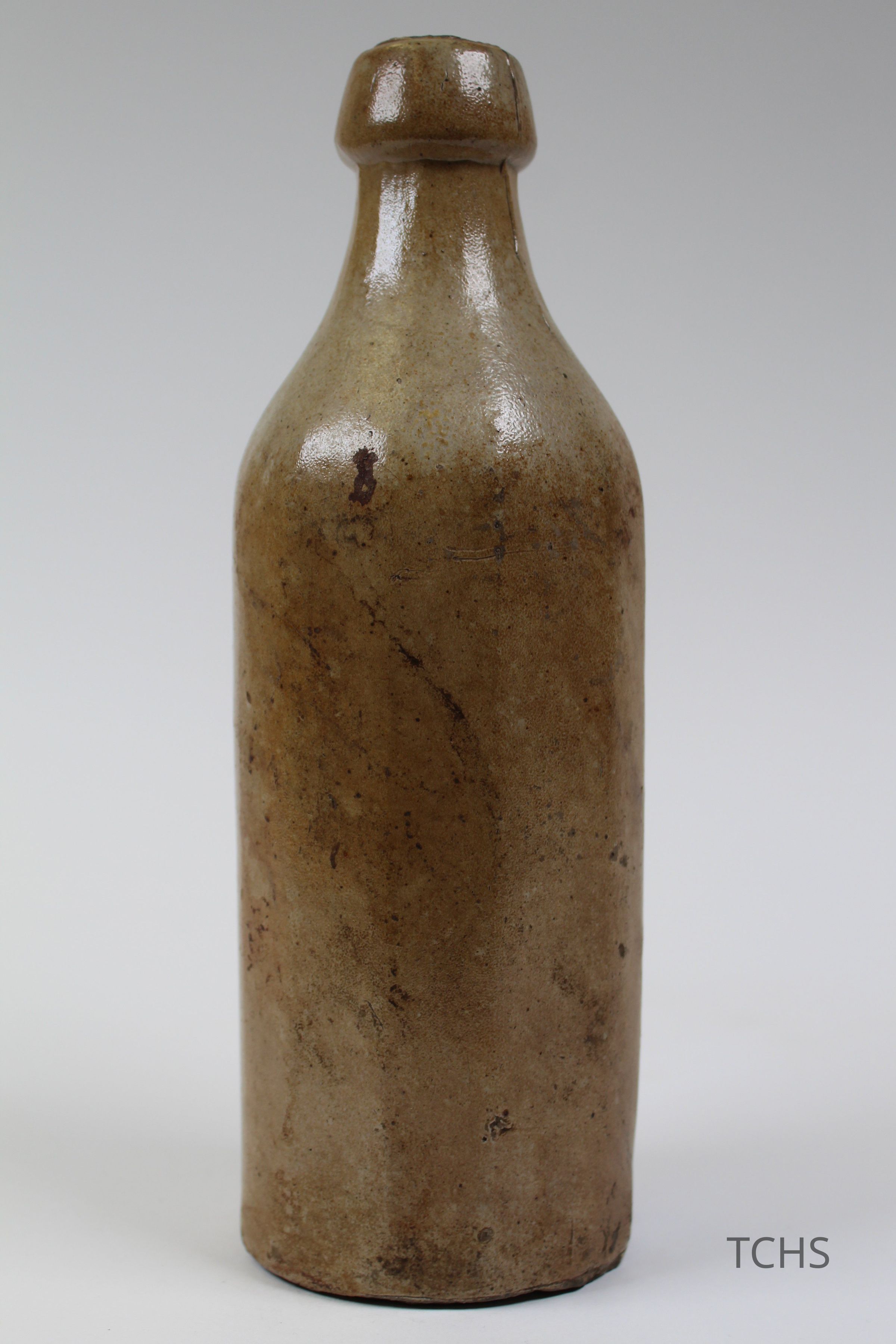 A long-necked ceramic bottle with 'C.B.W. Warren, O.' etched into it.Collection
