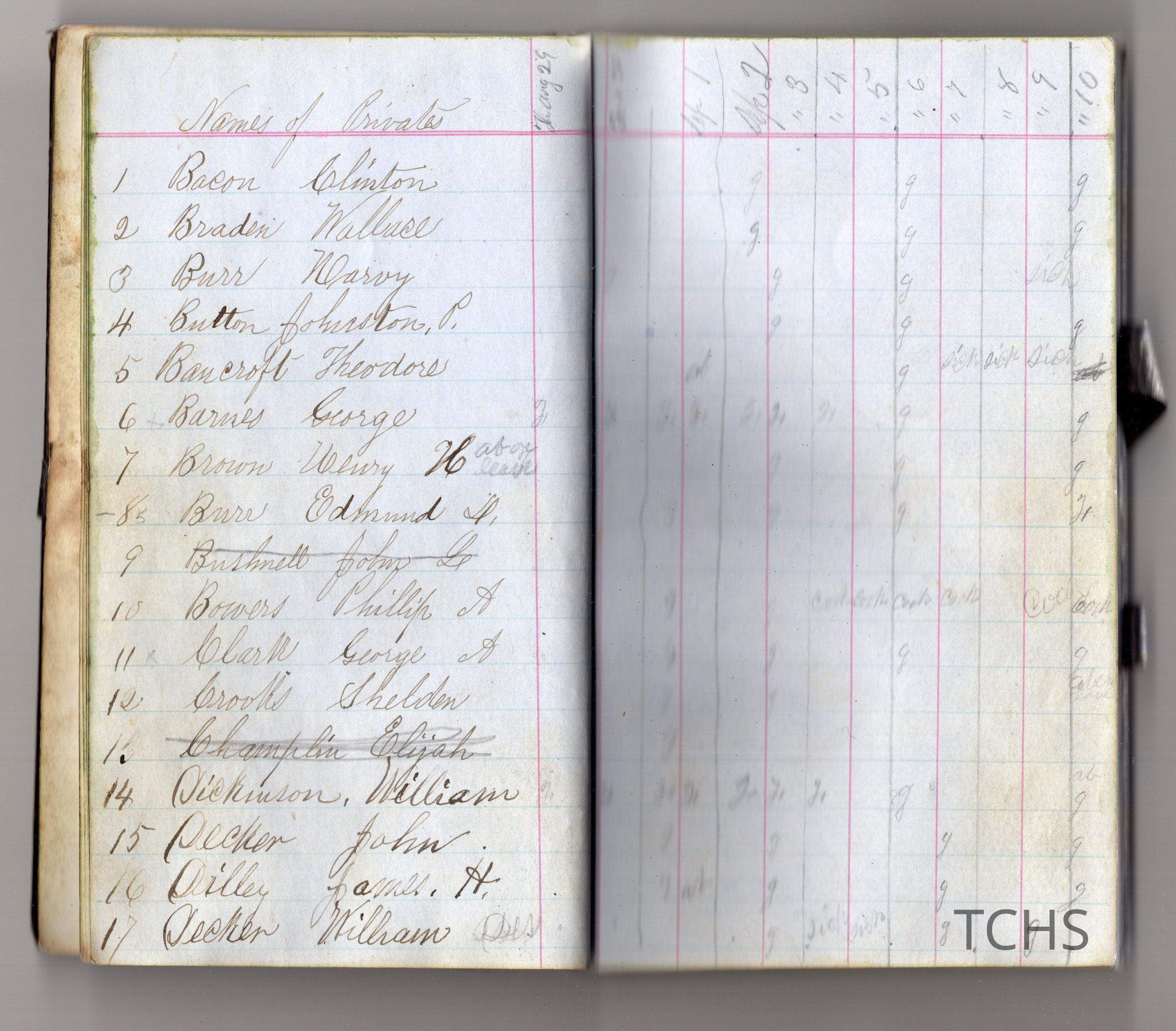 Burr, Harvey, Bancroft, Theodore, Dickenson, William, Decker, William, Barnes, George, Bowers, Phillip A., Bacon, Clinton, Champlin, Elijah, Crooks, Sheldon, Braden, Wallace, Hart, C.C., Bushnell, John L., Clark, George A., Dilley, James H., Button, Johnston P., Burr, Edmund H., Decker, John, Brown, Henry H.