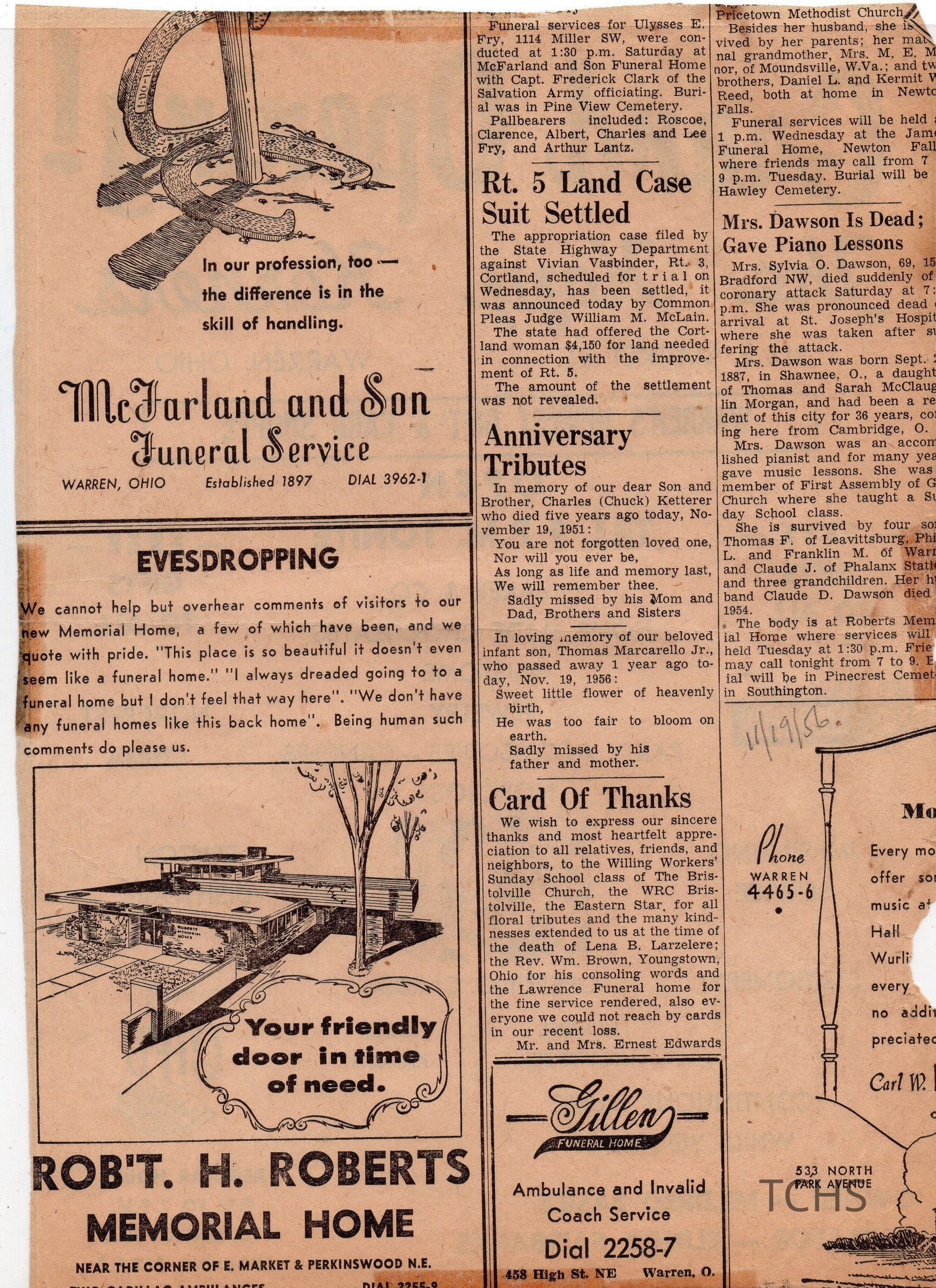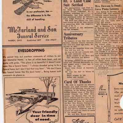 On the other side are ads for McFarland Funeral Home, Roberts Menorial Home, and other news updates.Acquisition