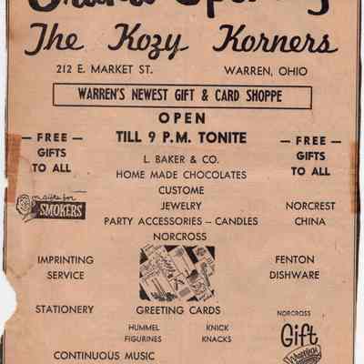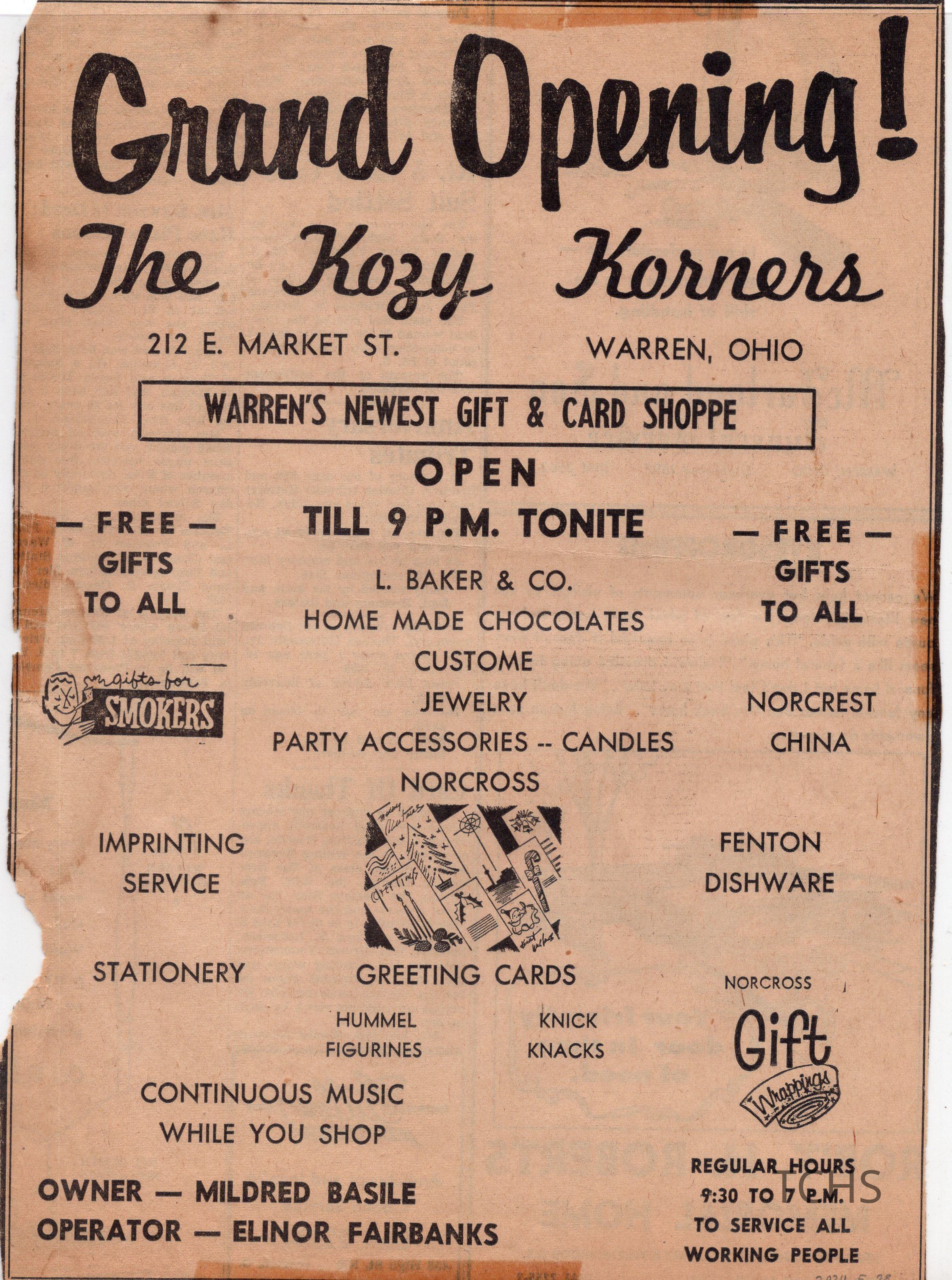 Newspaper Ad from 1956, Grand Opening of The Kozy Korners, lists address and the perks of coming to the store. Says special hours or opening night and regular hours.