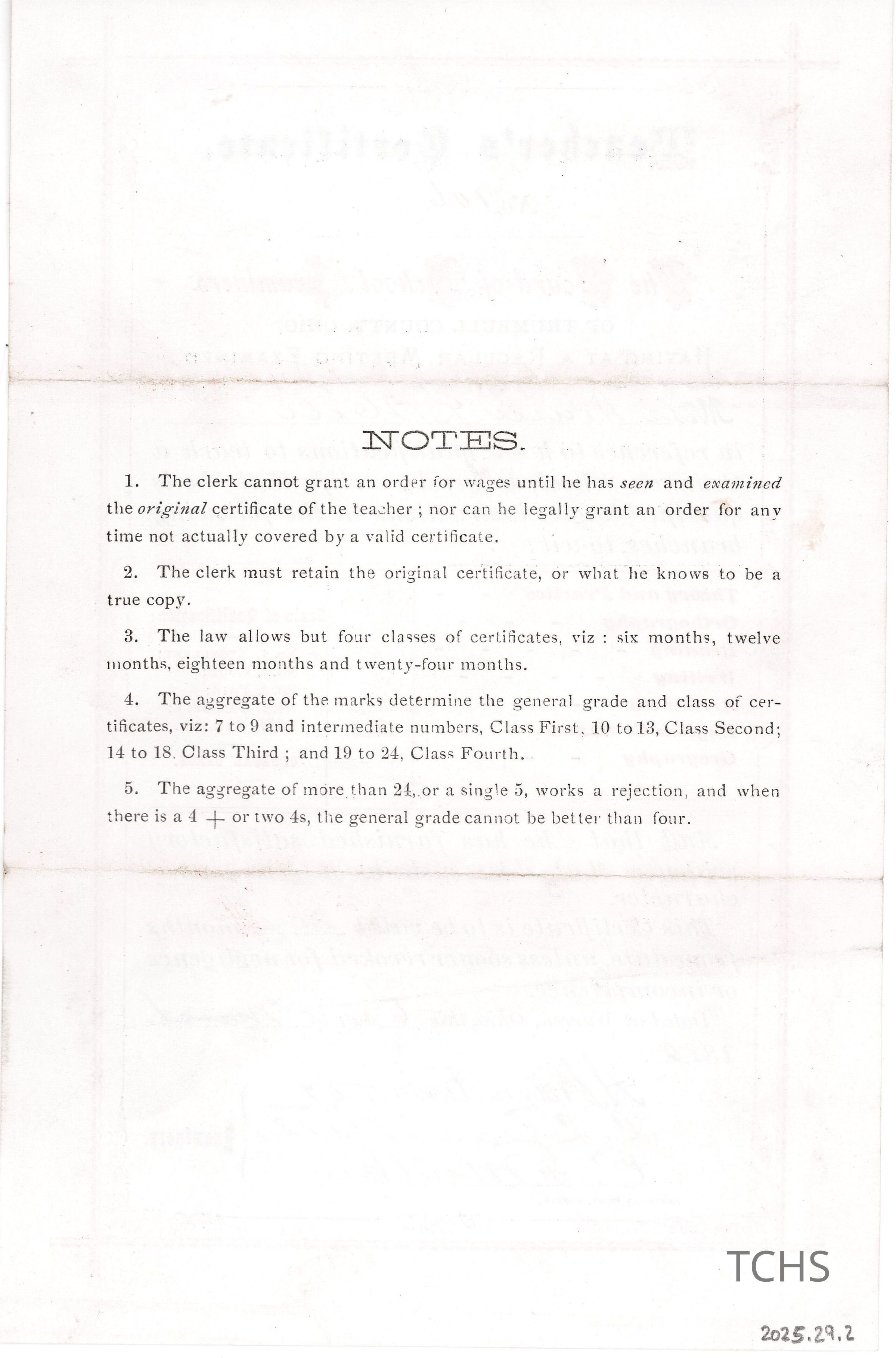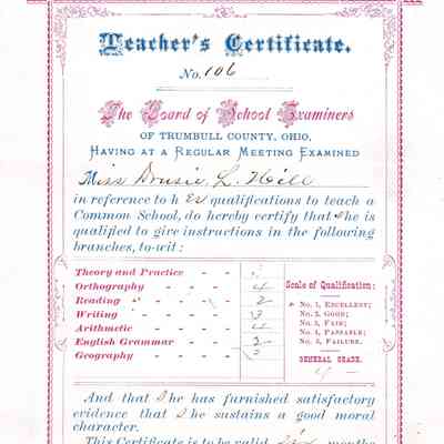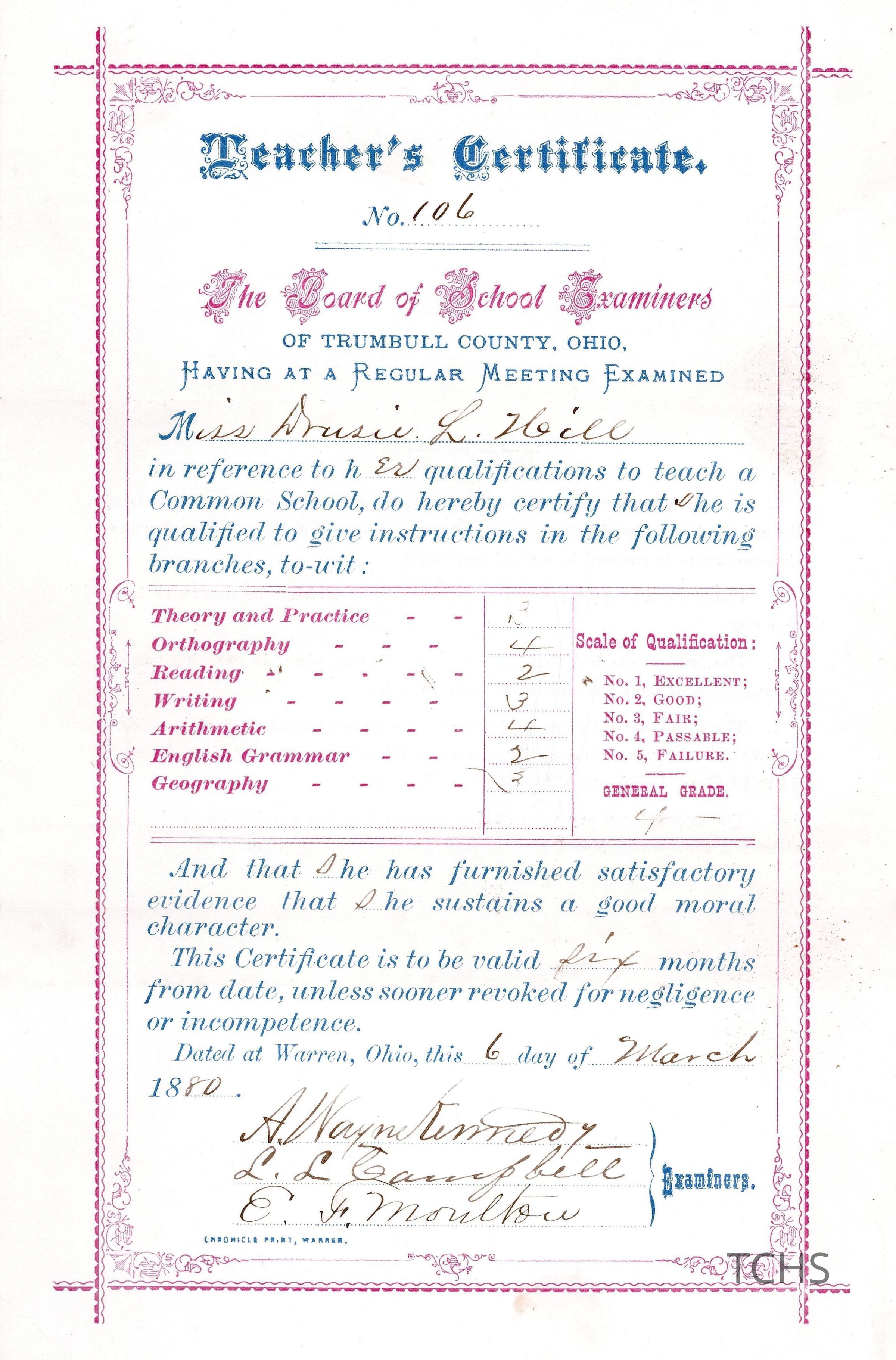 A teacher's certificate for Drusie L. Hill dated March 6th, 1880, issued by the Board of School Examiners of Trumbull County.Date(s) of Creation