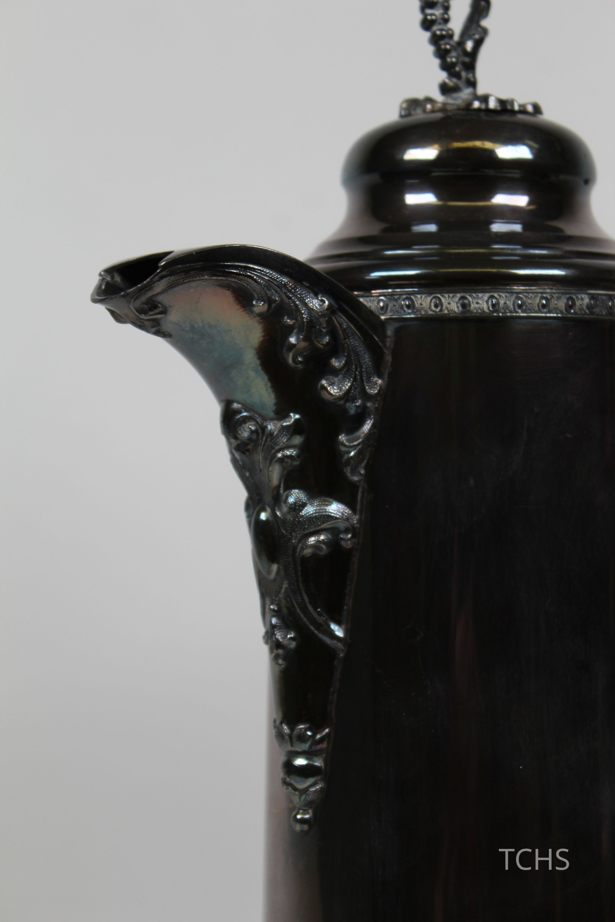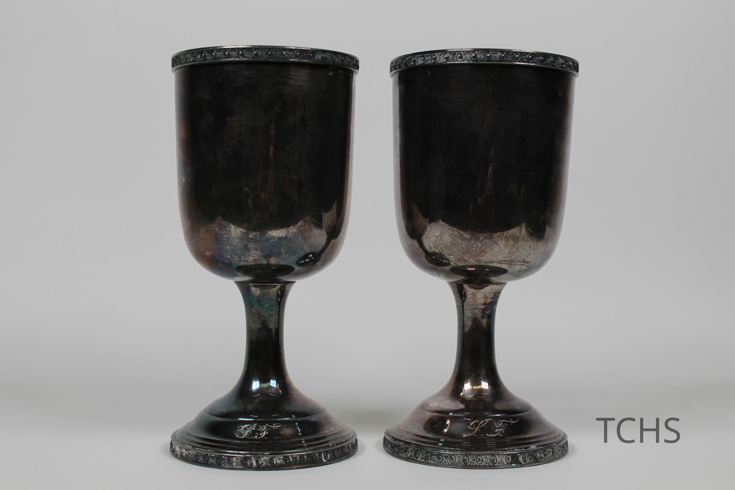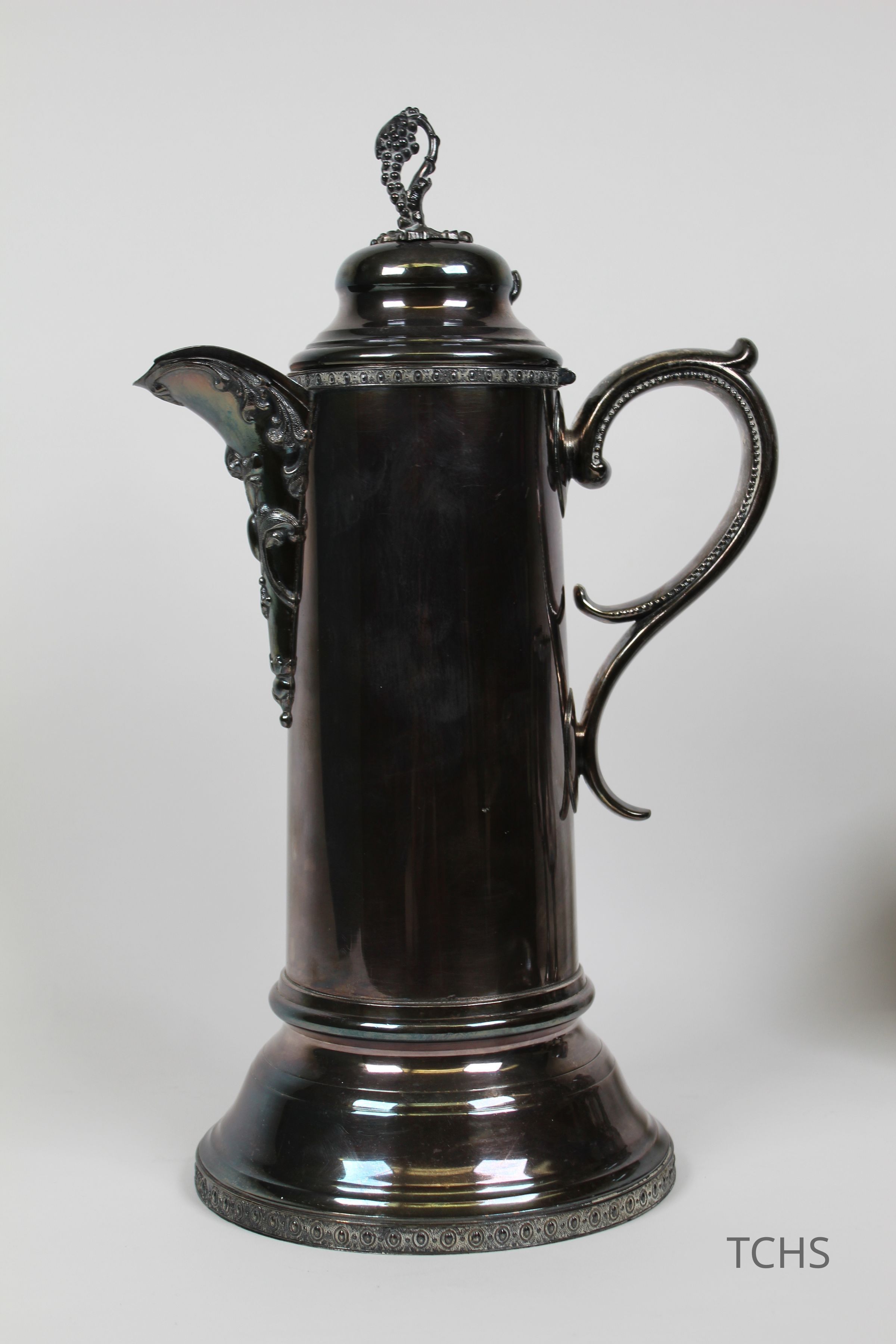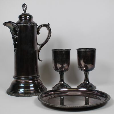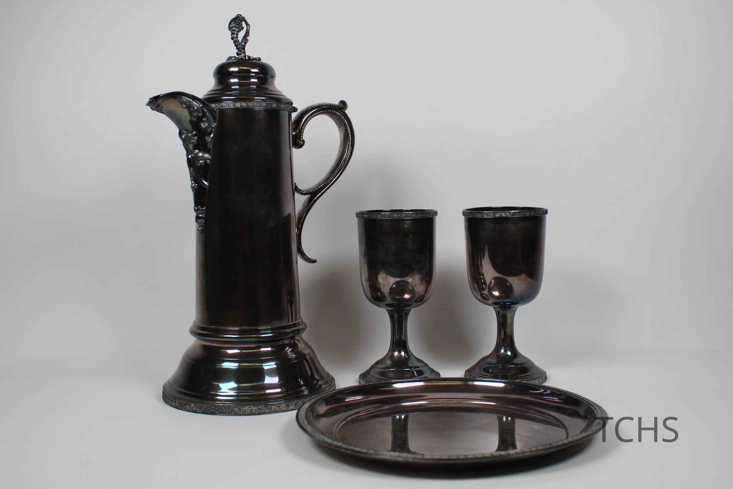 An 1875 silver communion set, four pieces, from the Brockway Methodist Church located in Hartford Township. The set includes a flagon, tray, and two goblets.