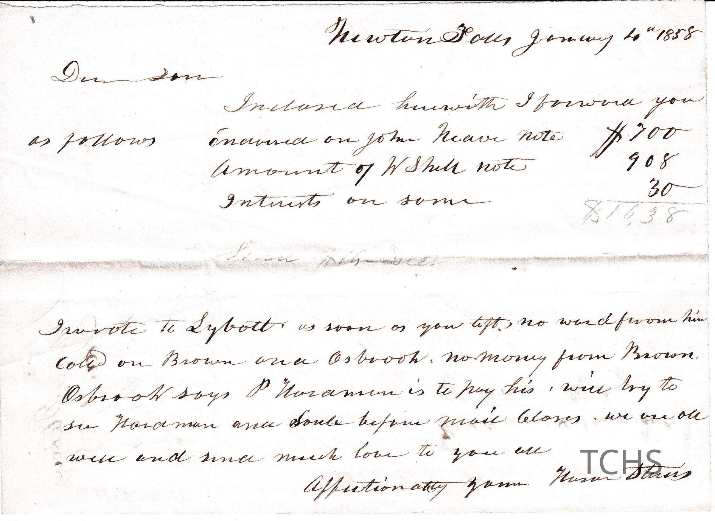 Letter to 'son' from Horace Stevens, dated Newton Falls, January 10 (?), 1858Location