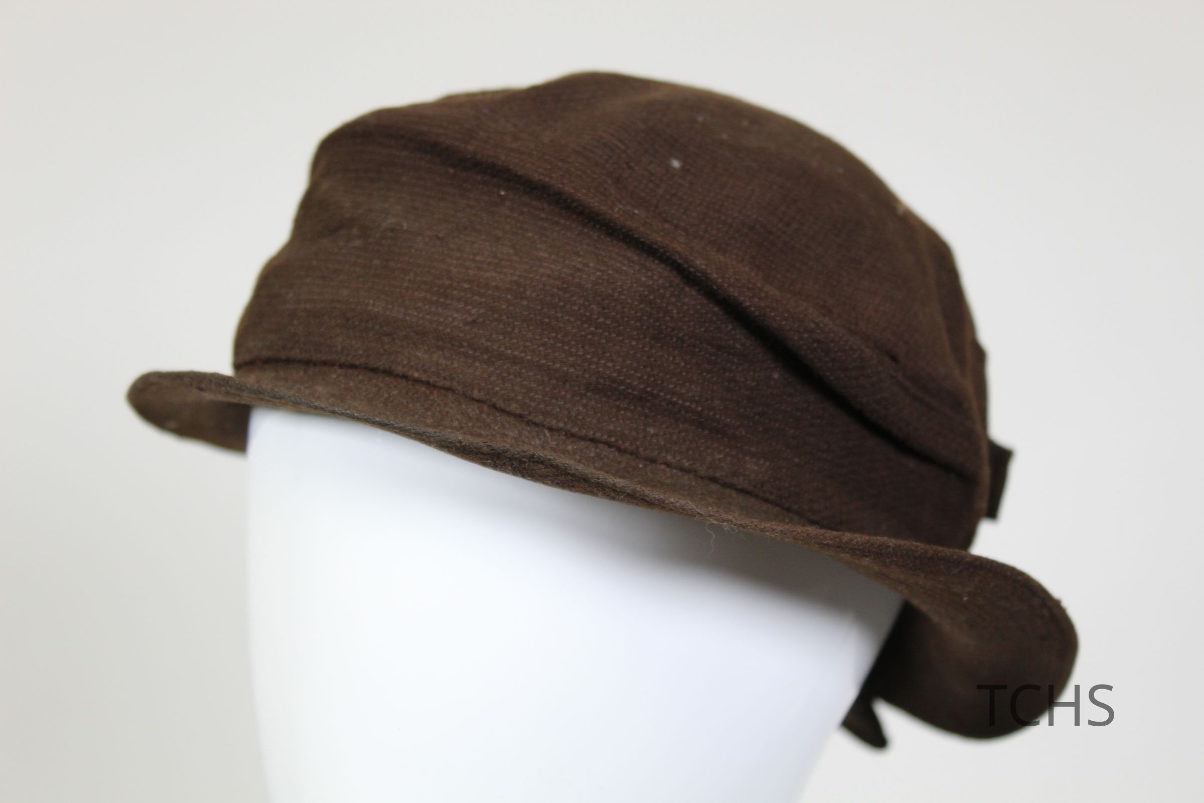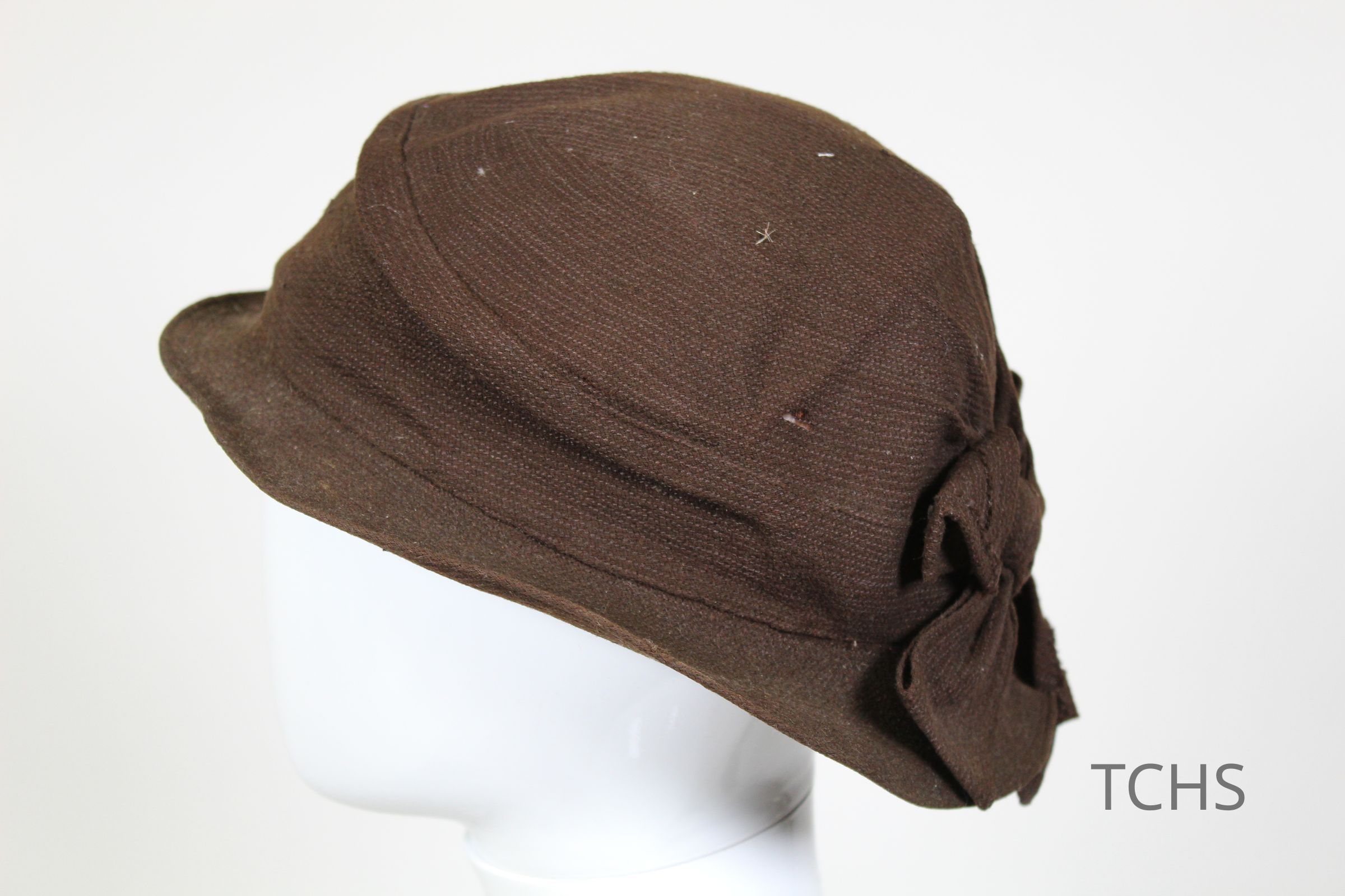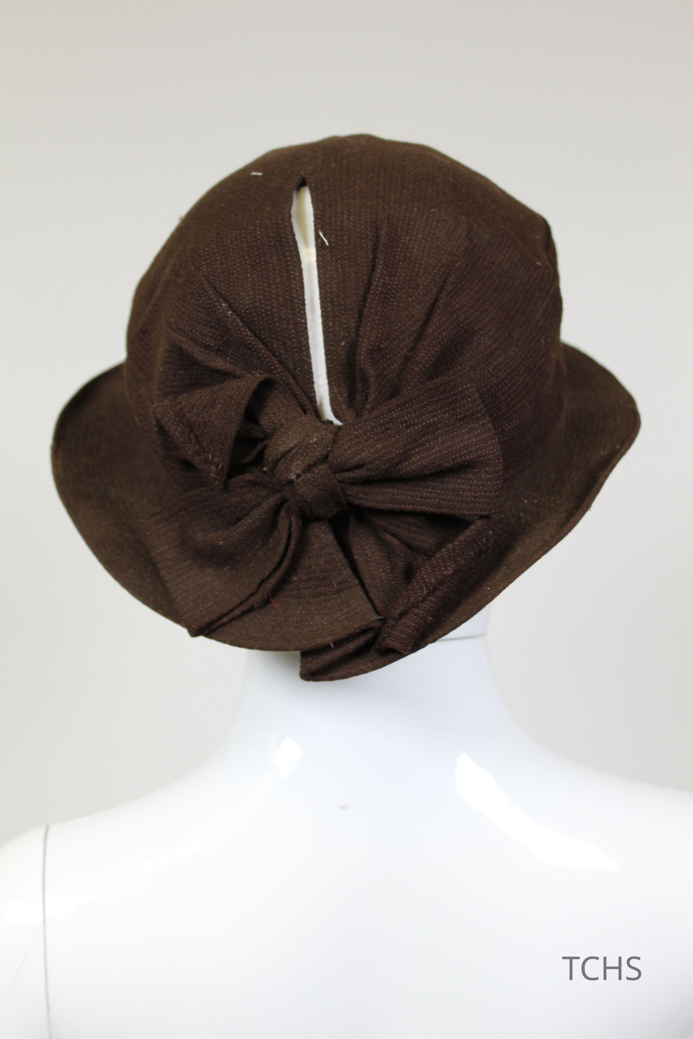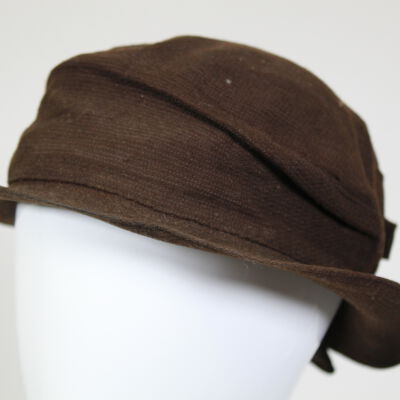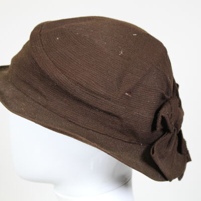 This is a brown color hat with a bow and opening at the back of the hat. The brim is small and rigid. There are no labels on the inside of the hat to indicate a brand.