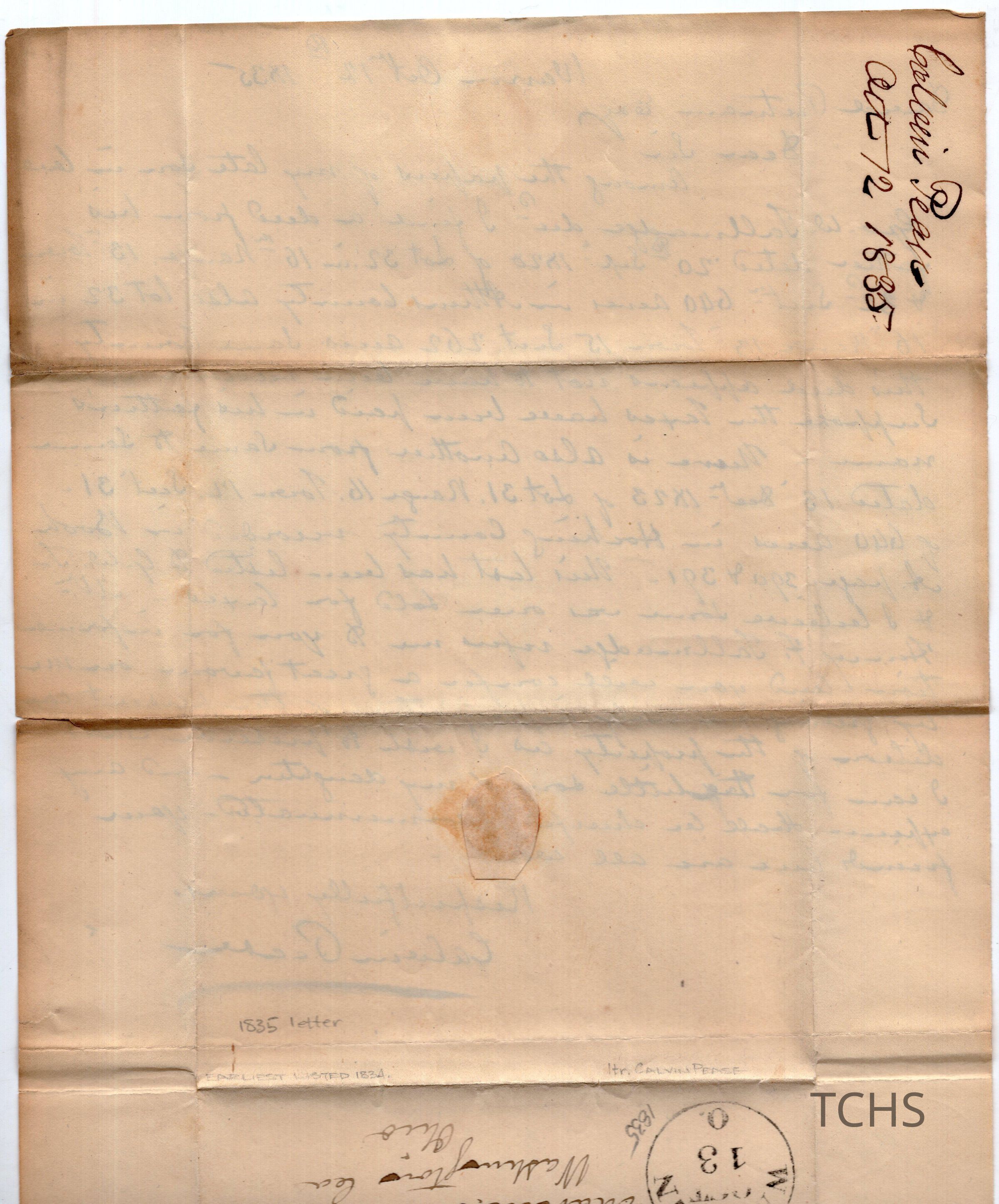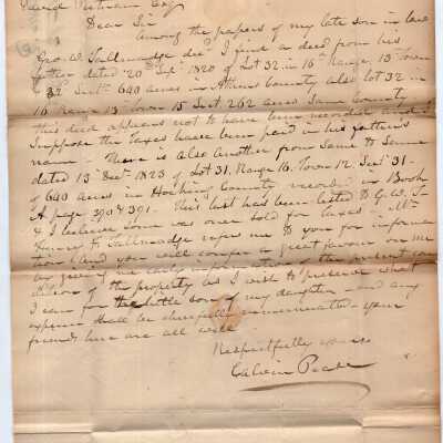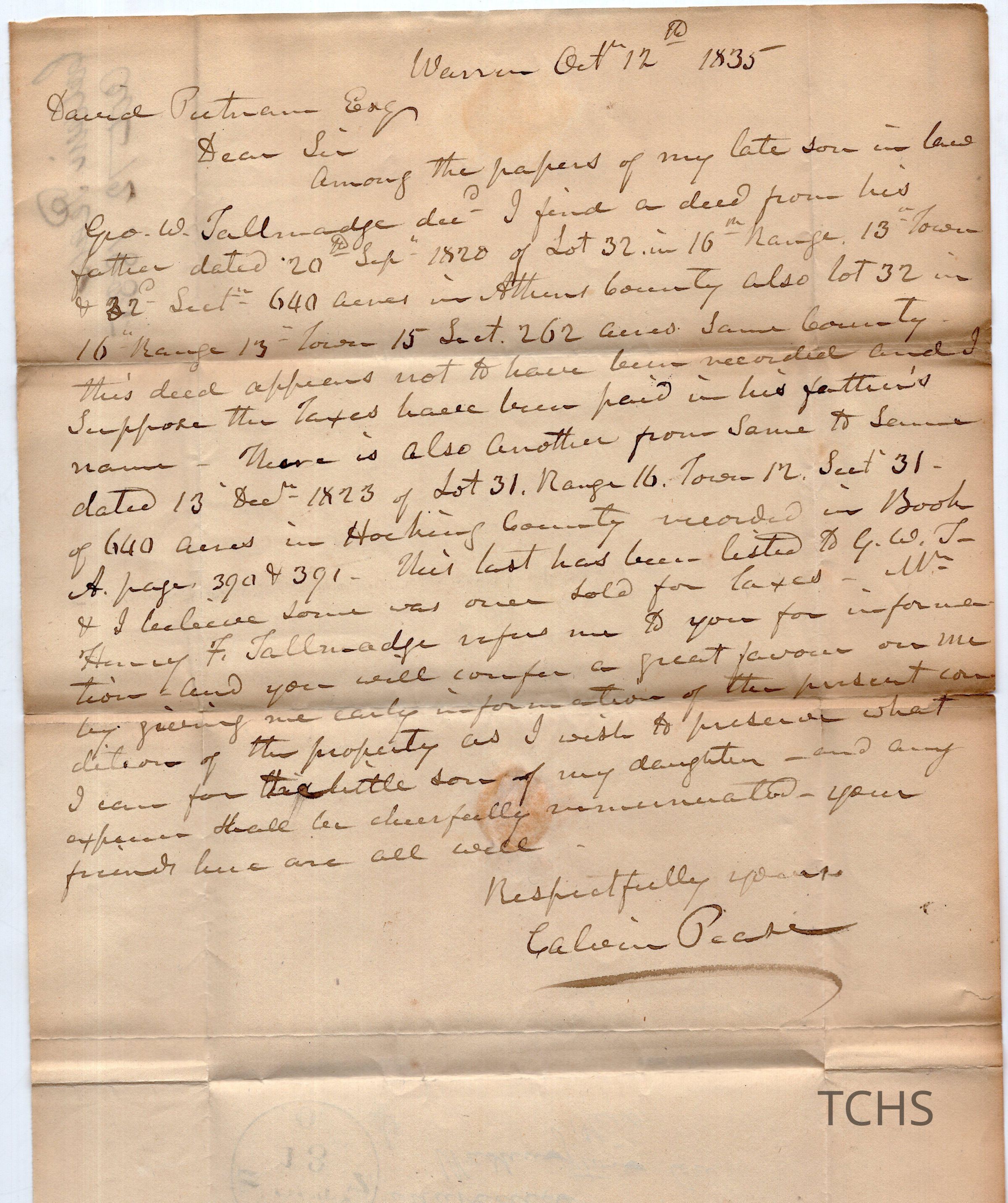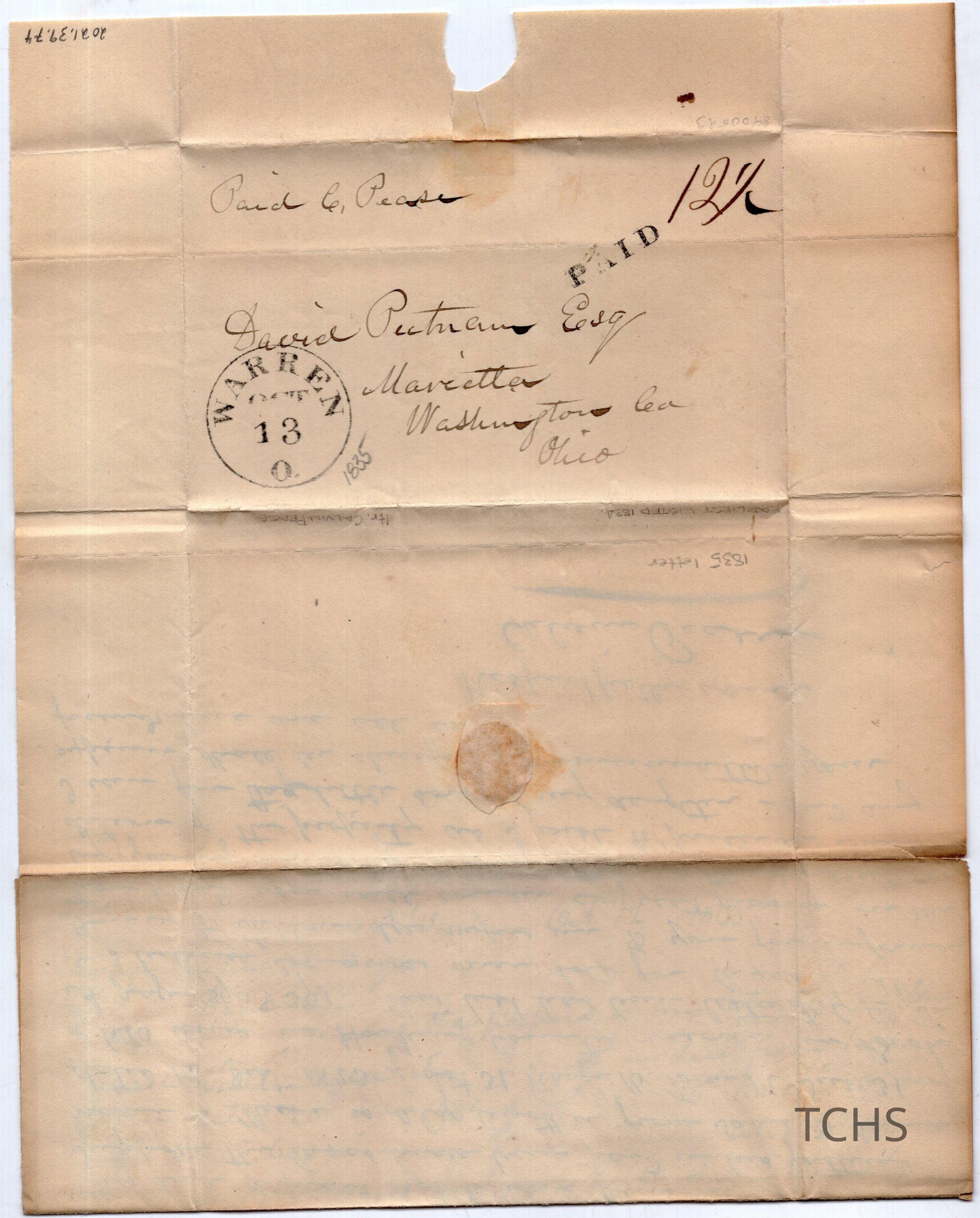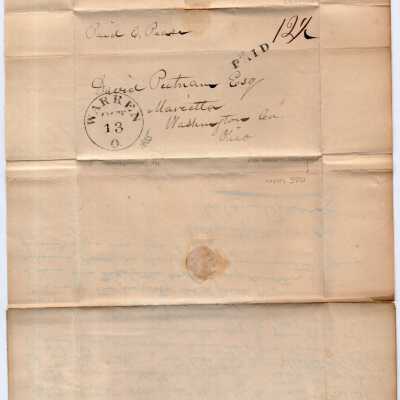 Letter to David Putnam of Marietta Washington Co., Ohio from Calvin Pease, of Warren, on behalf of his son's estate. Donor note, "black cds, 'PAID:' (to settle son's estate). $65". "12 1/2" written as postal marking. Collectors notes in different handwriting/ink.Collection