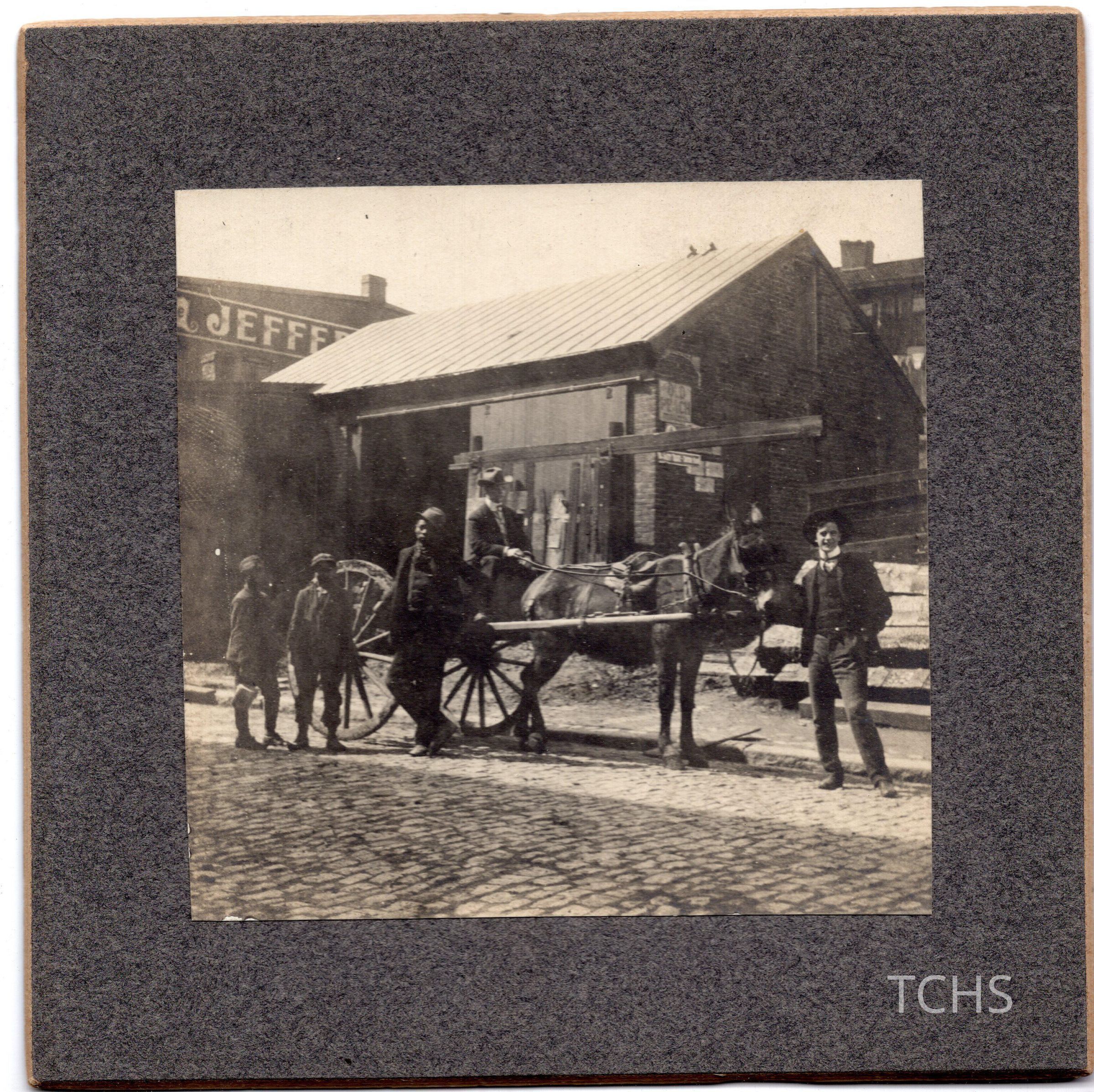 Image men with horse and buggy. Three young black men and one man pulling horse and another riding carriage. Handwritten "1903”. Stamped “Property of W.D. Ackley Warren Ohio”Acquisition