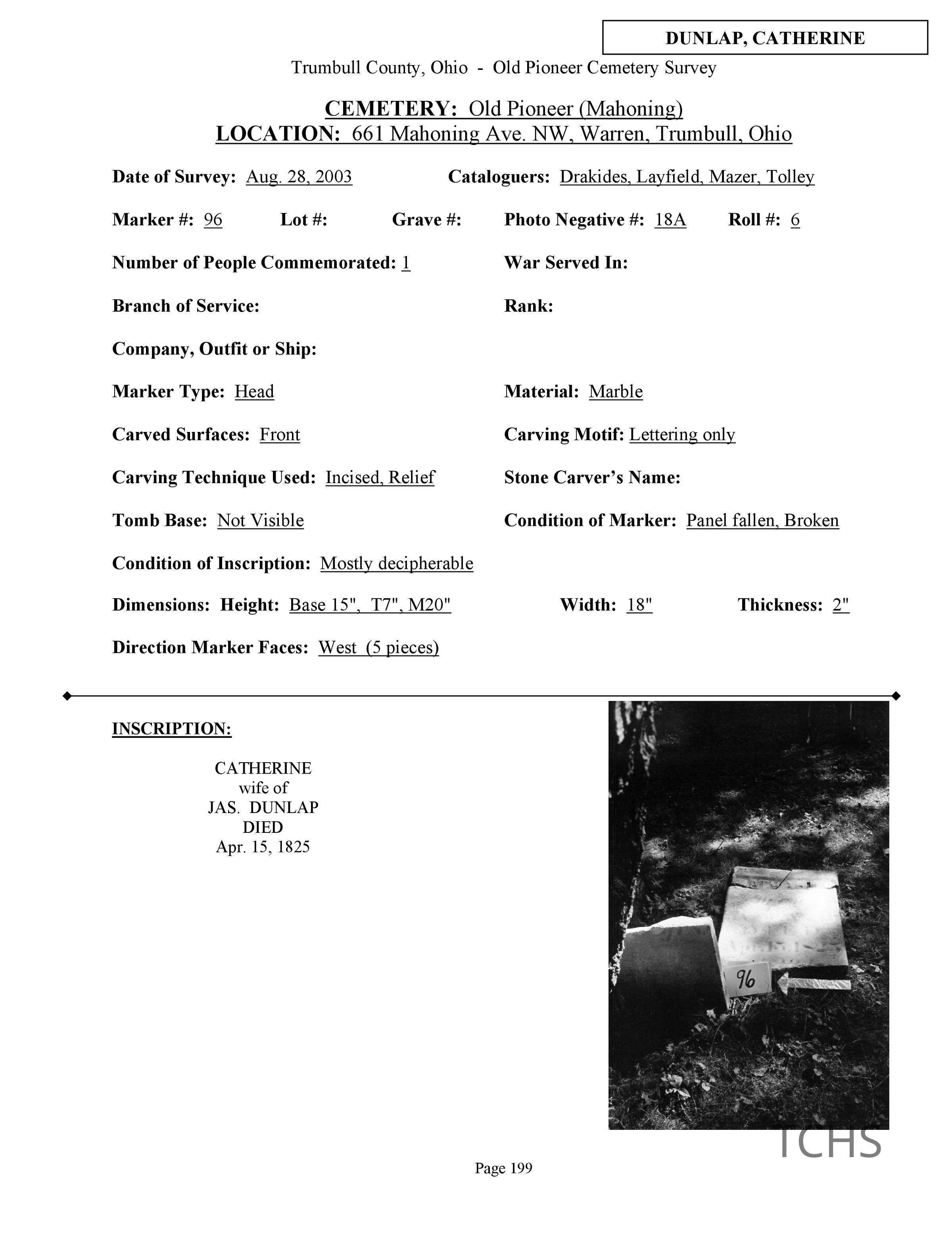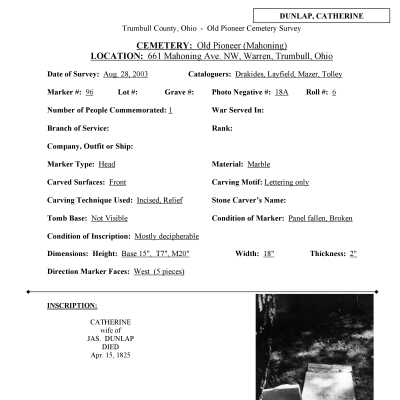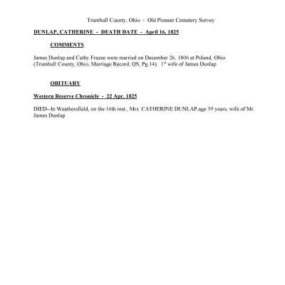 Catherine Dunlap died April 15, 1825 (April 16, 1825?) and is buried at the Old Mahoning (Pioneer) Cemetery.