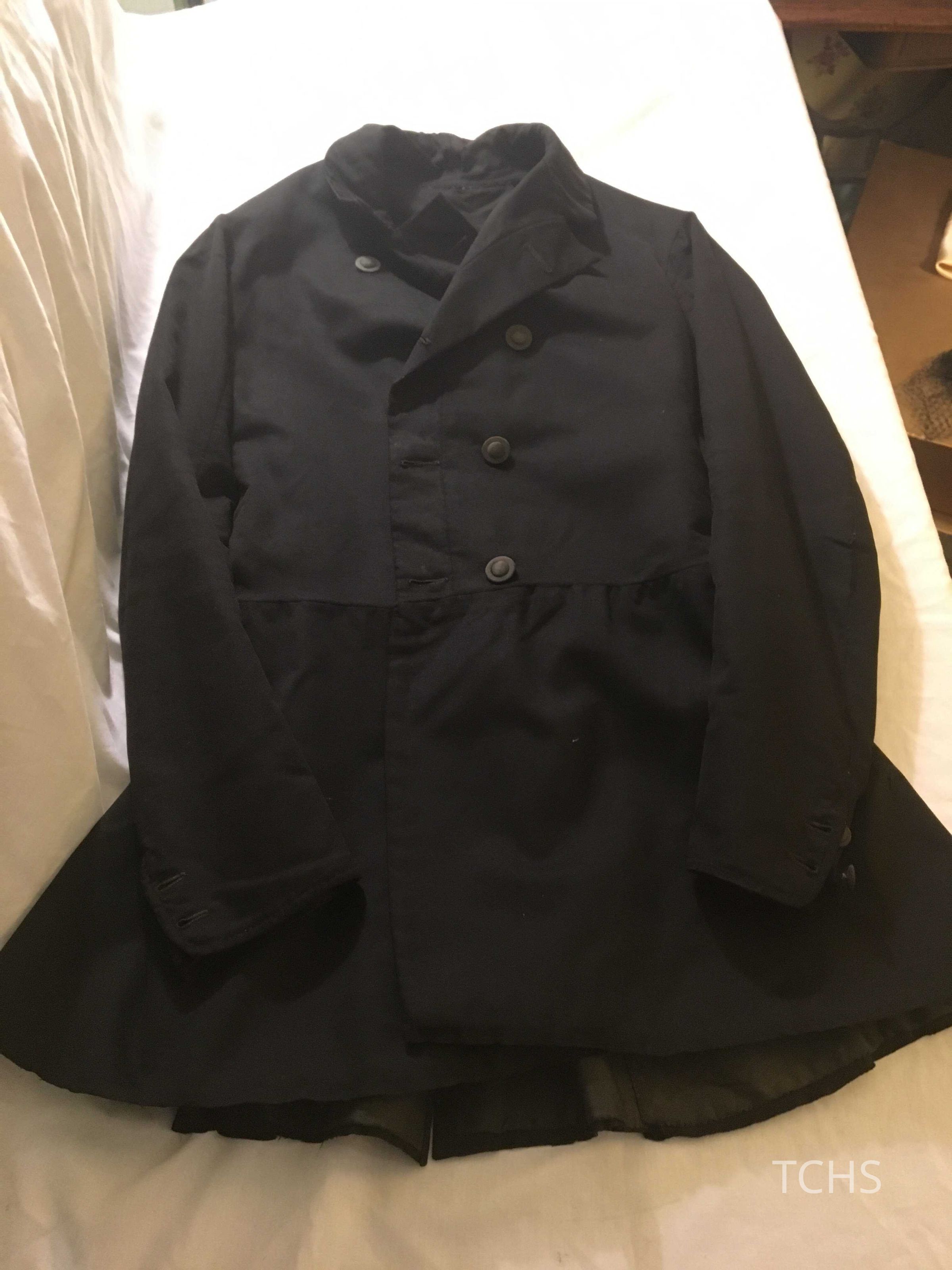 Black jacket (unsure mens or womens?) with four fabriced buttons down front to close. Buttons also present at sleeve cuffs. Button is comprised of separate section with a slight flareAcquisition