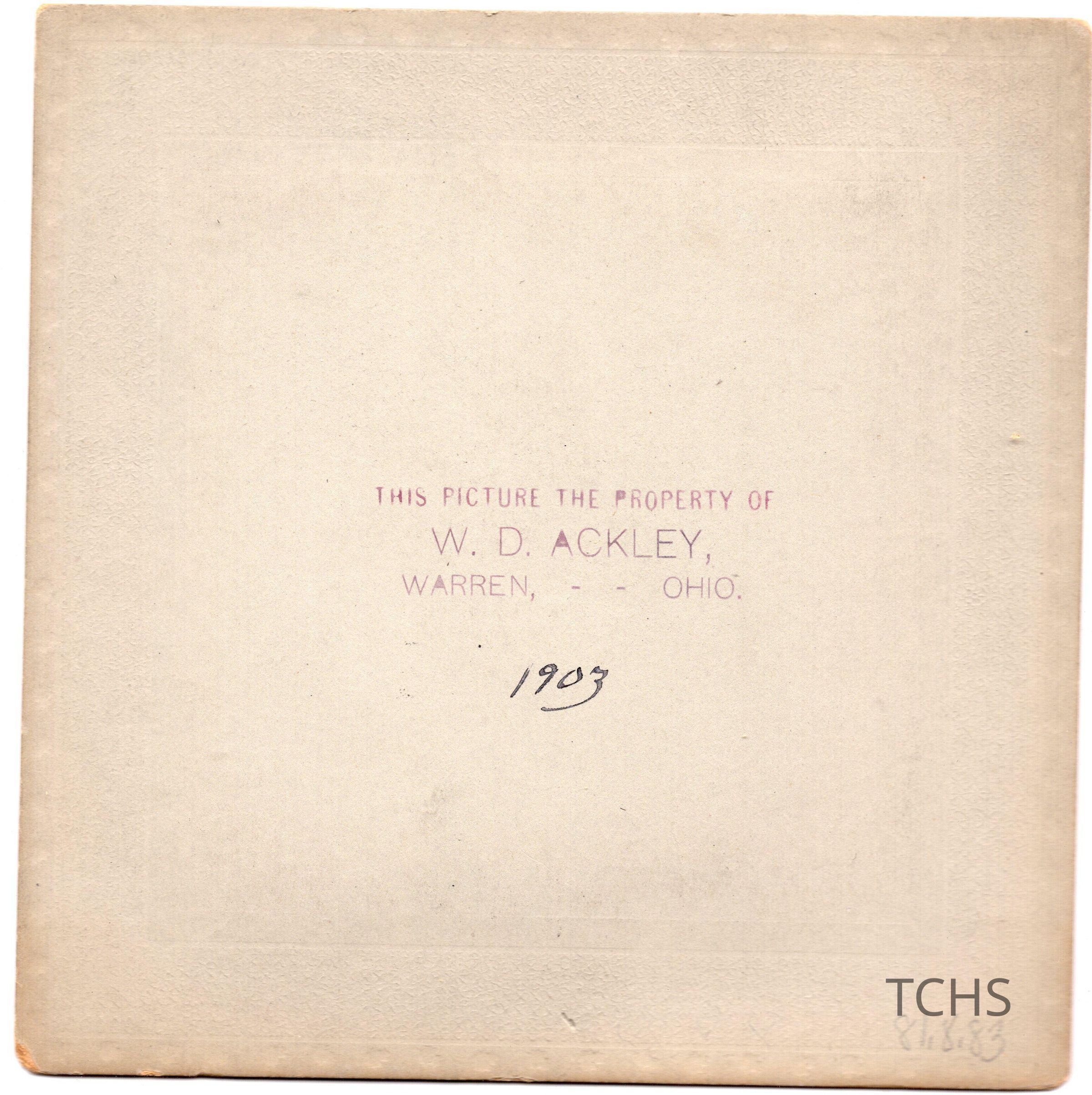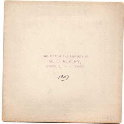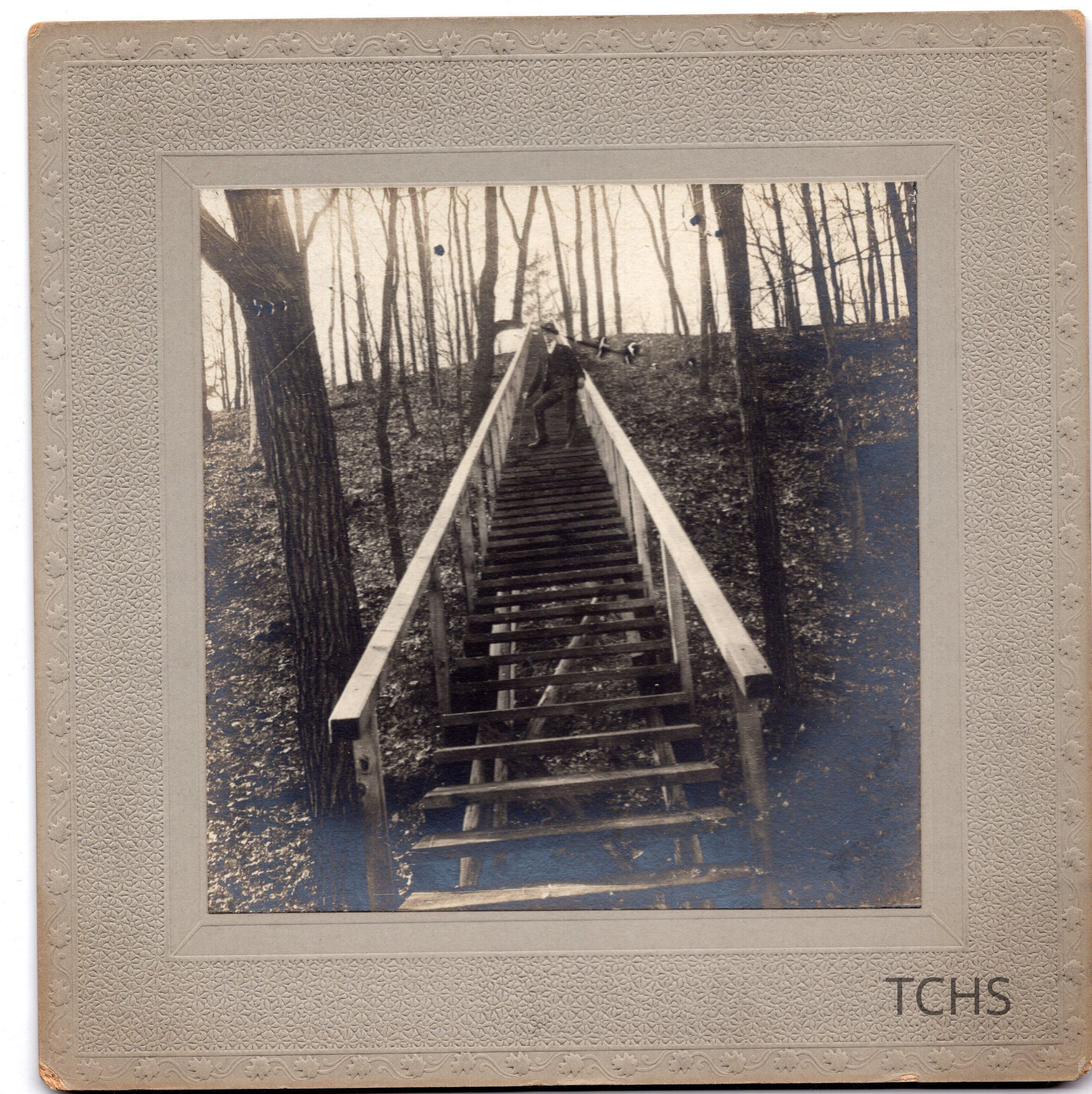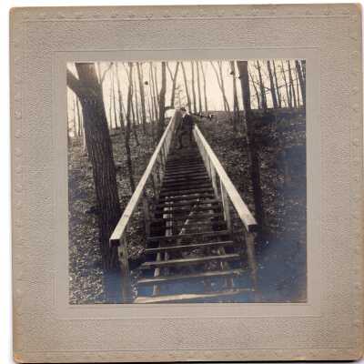Image of a man posing on a staircase in the woods. Handwritten "1903”. Stamped “Property of W.D. Ackley Warren Ohio”Acquisition