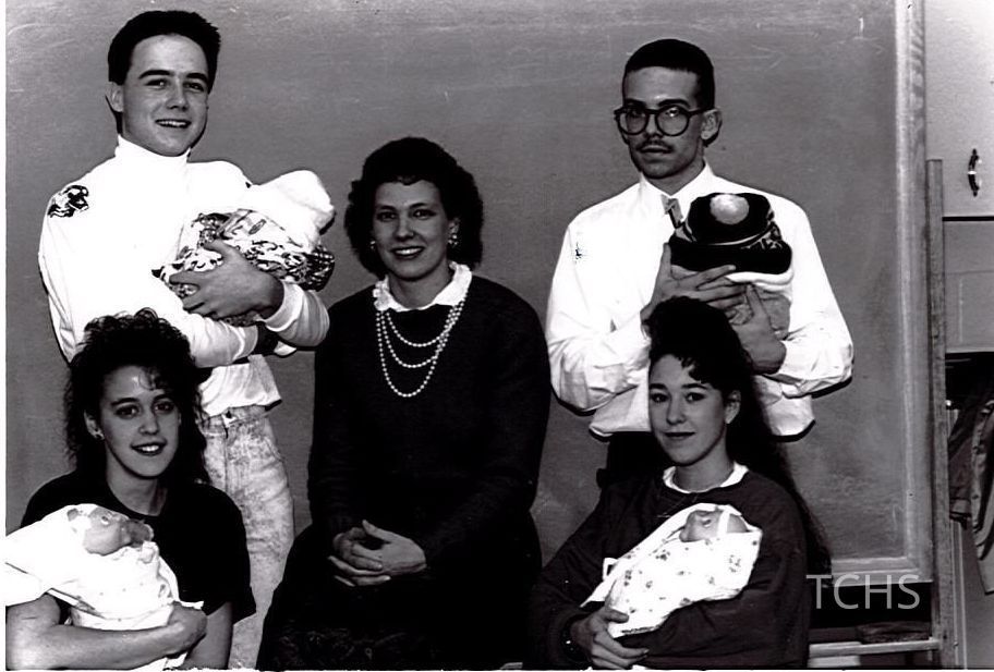 "Students at Chalker High School learned child care responsibilities with the help of five-pound sacks of flour. First row, left-right: Brandi St. Clair, Mrs. Perry Graf, teacher, Mandy Lather. Second Row: Travis Kelly & Baron Lockhart."