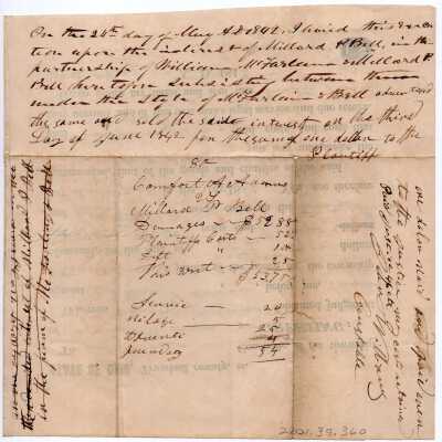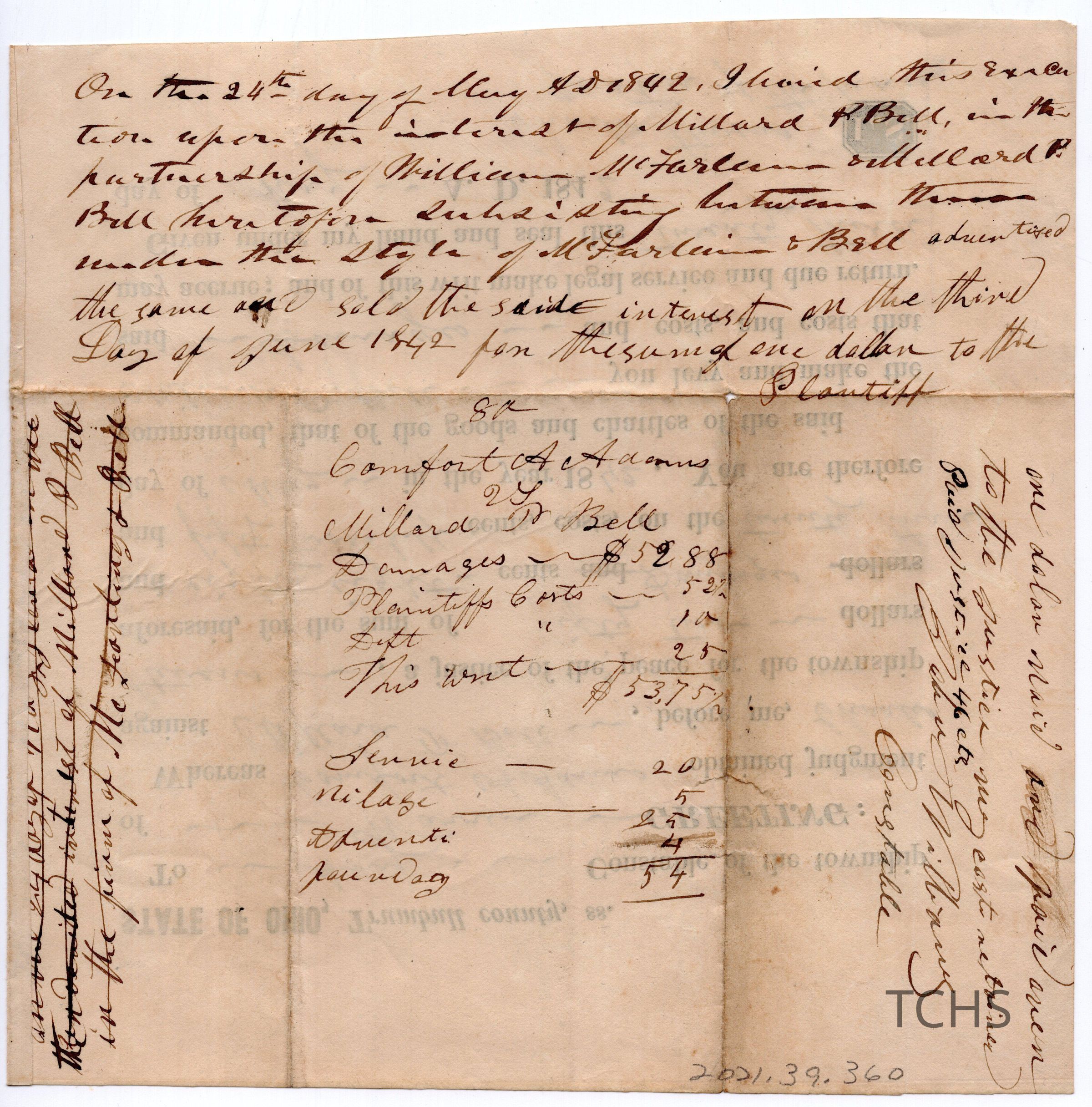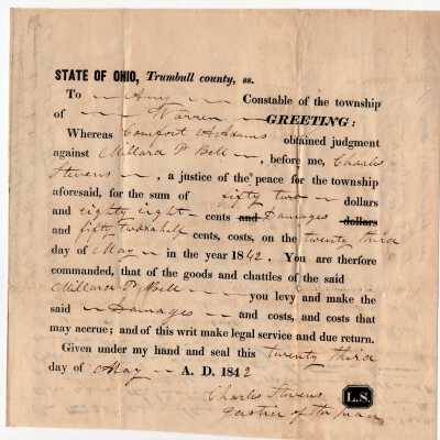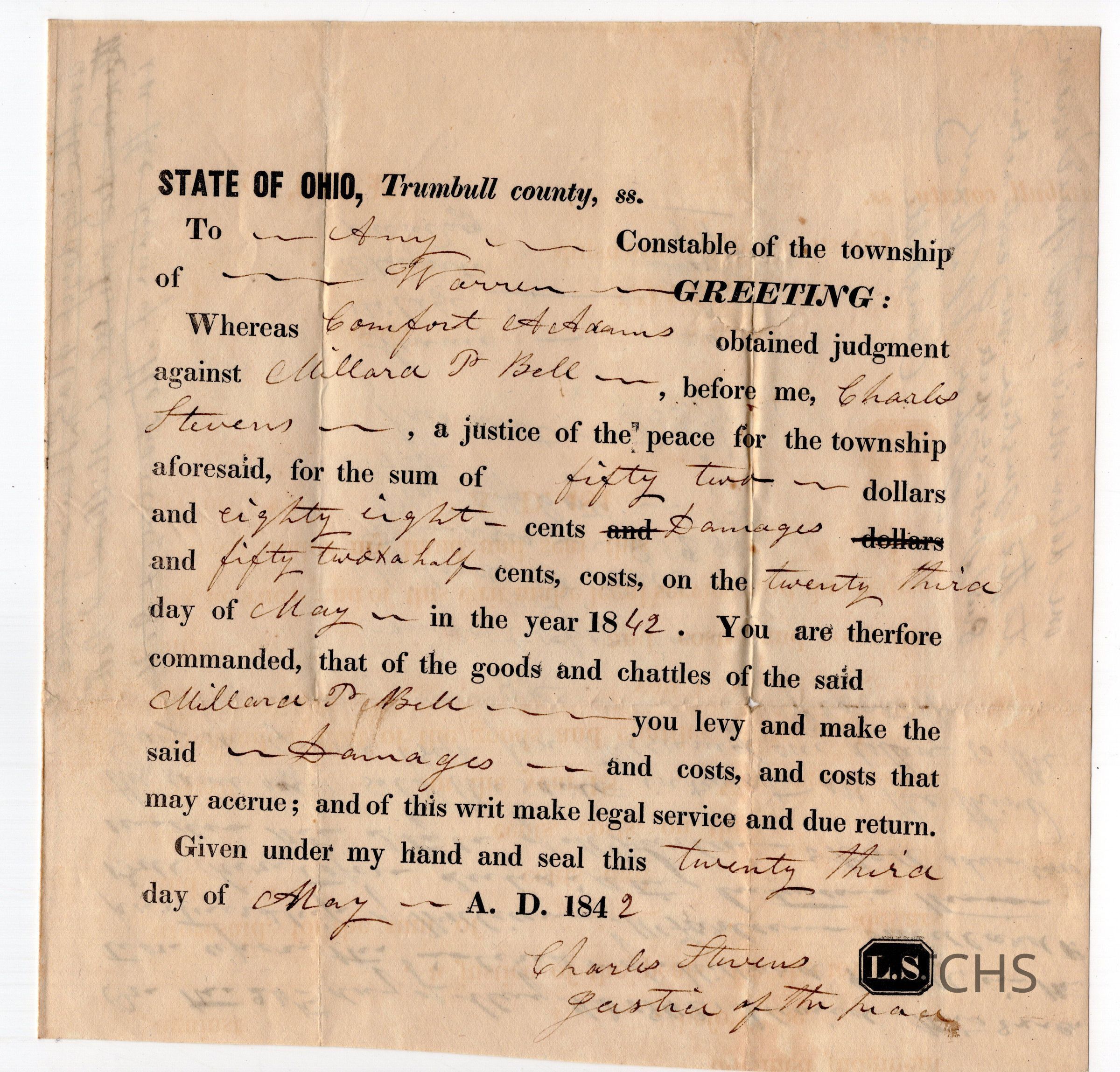 Legal document from Trumbull County statement of judgement of Comfort A. Adams vs Millard P. Bell. Judgement by Charles Stevens, Justice of the Peace.Collection
