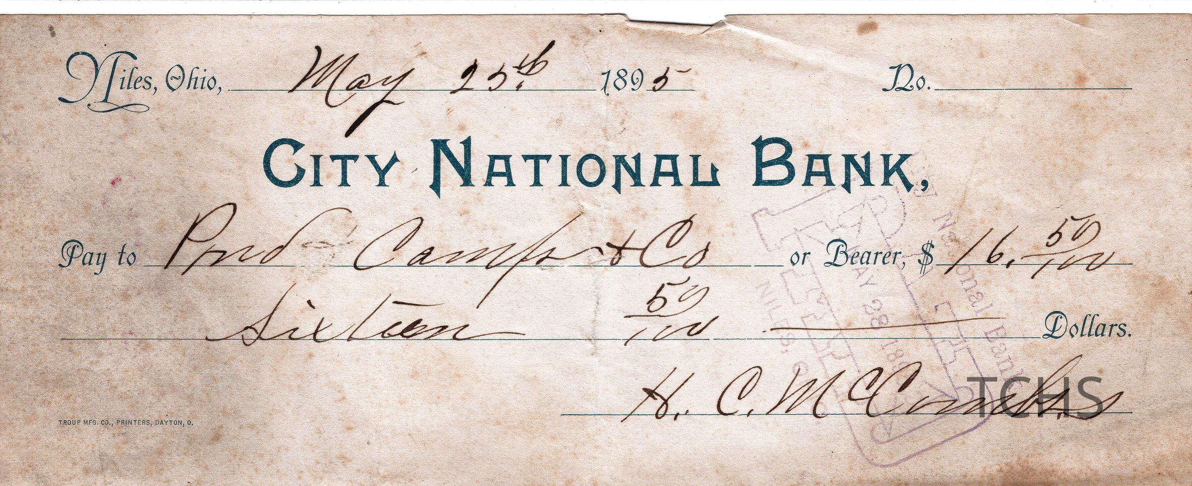 Checks from City National Bank found in the Horace Stevens Collection. Checks range in date from 1895-1899 and are signed by H.C. McCombs.Location