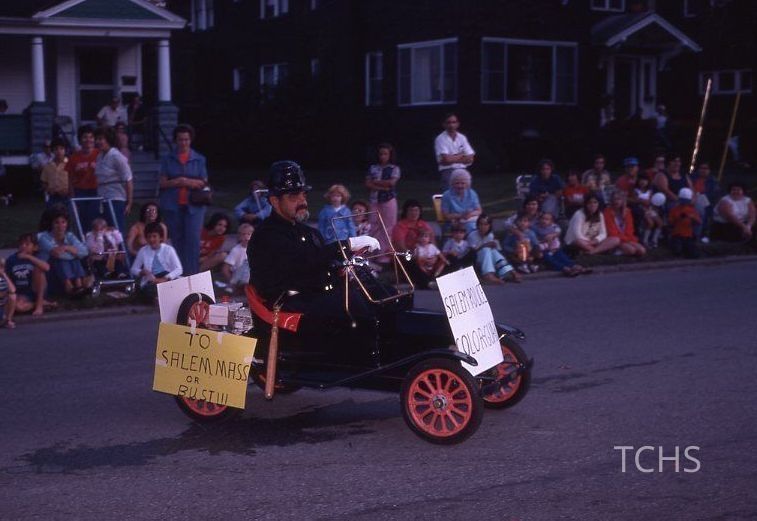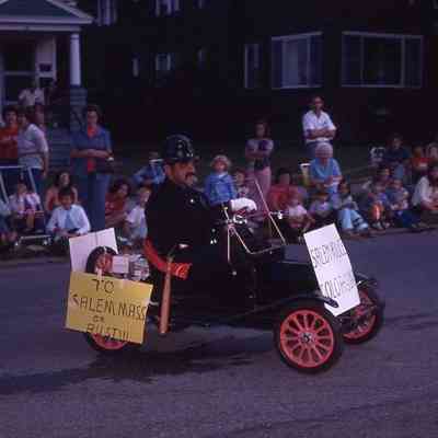 Kodachrome Photograph of Cop with sign 'To Salem Mass. or Bust!!!' for Bicentennial Celebration taken July 8, 1976 by Russell J. MontgomeryLocation
