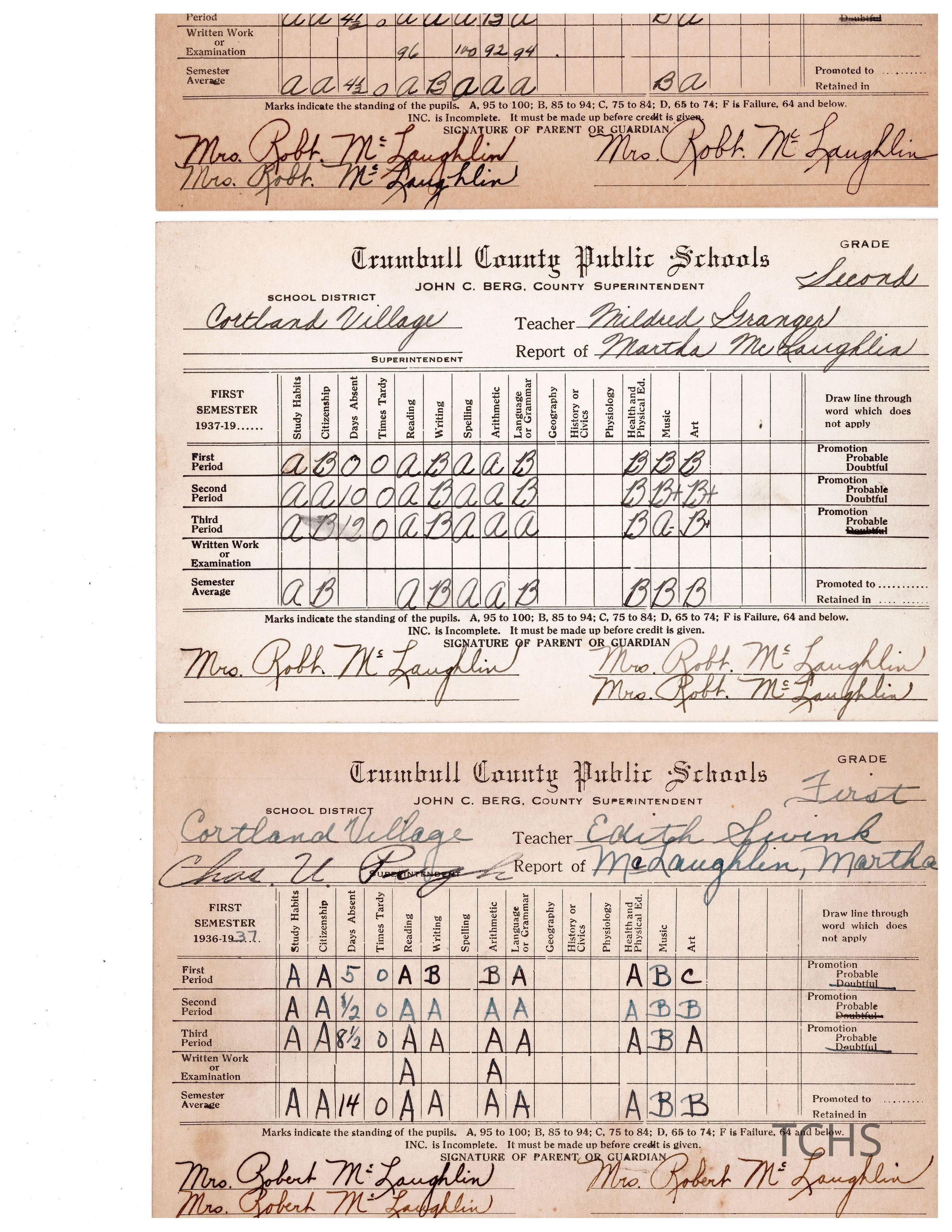 Cortland Village School Report Cards (4) from various dates.Collection
