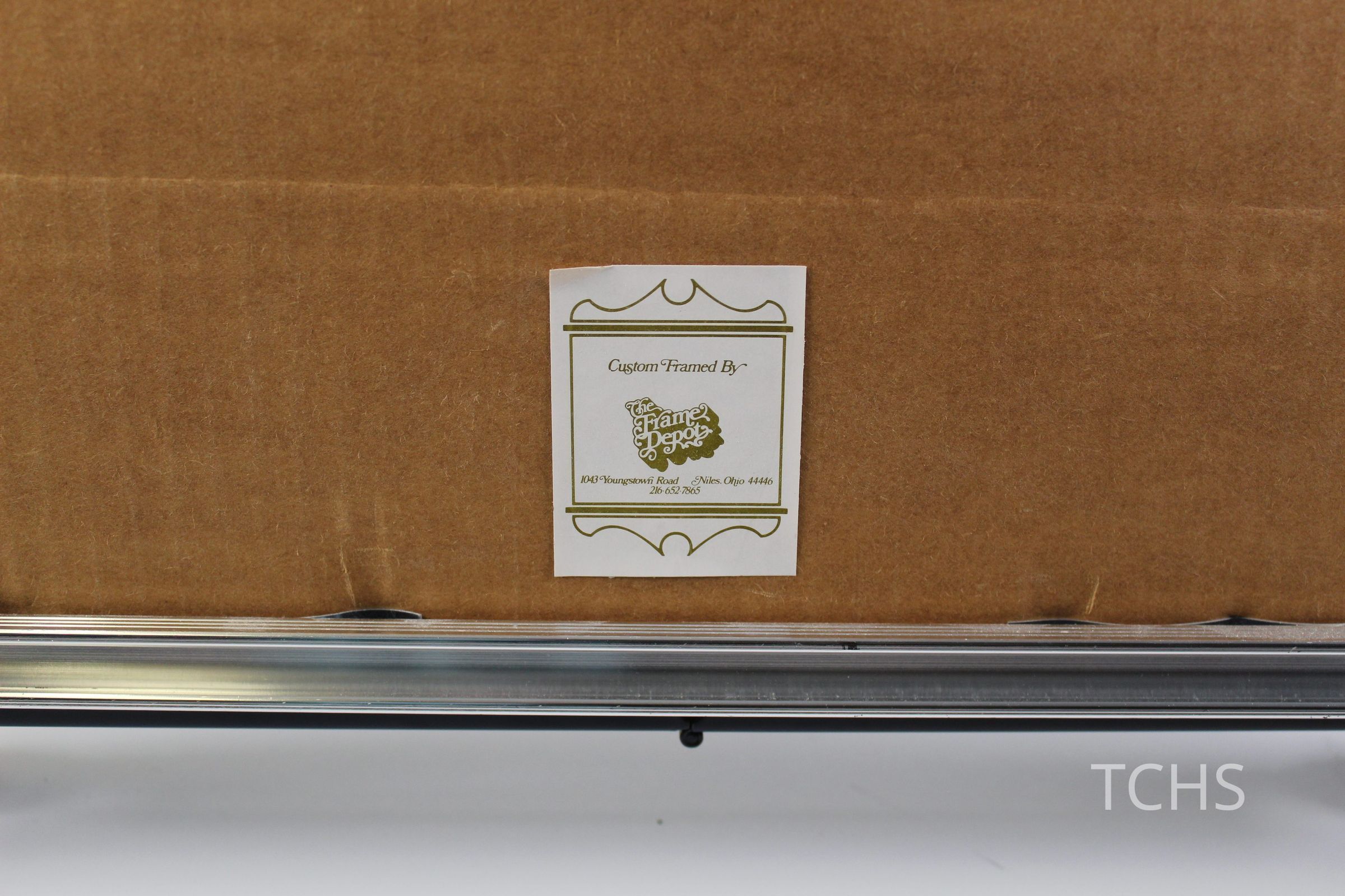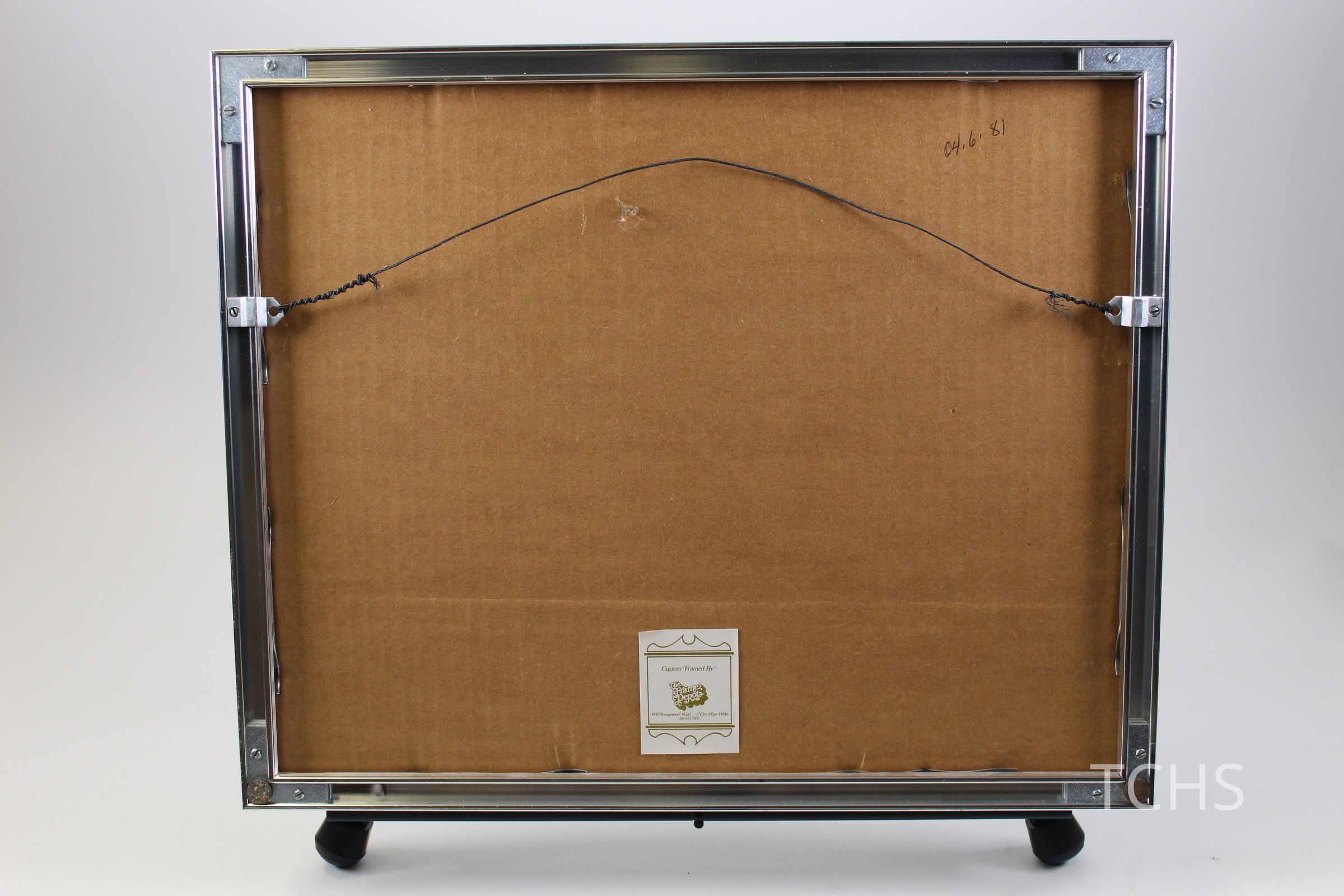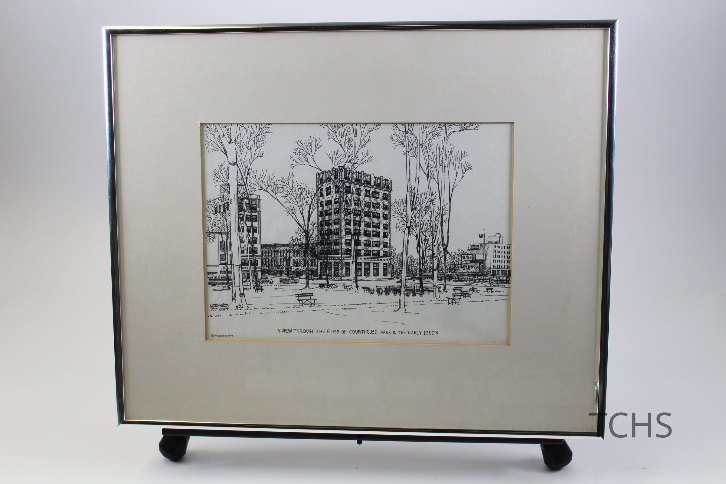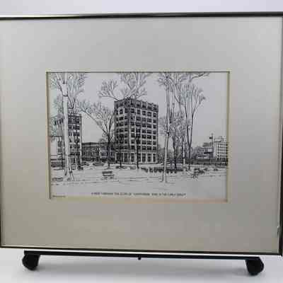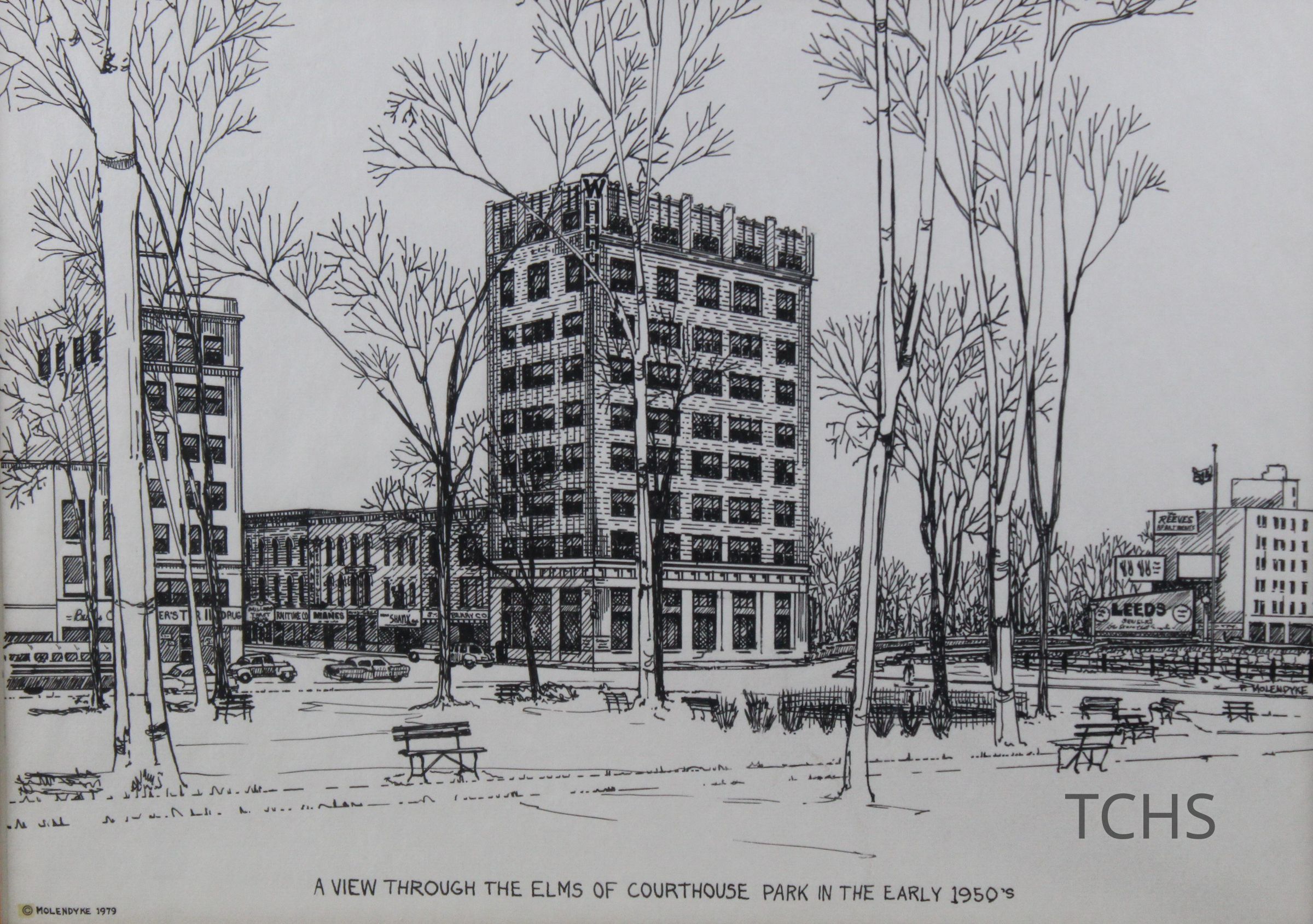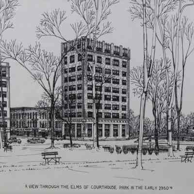 A framed drawing of 'a View Through the Elms of Courthouse Park in the Early 1950s' by P. Molendyke, copyrighted 1979.Acquisition