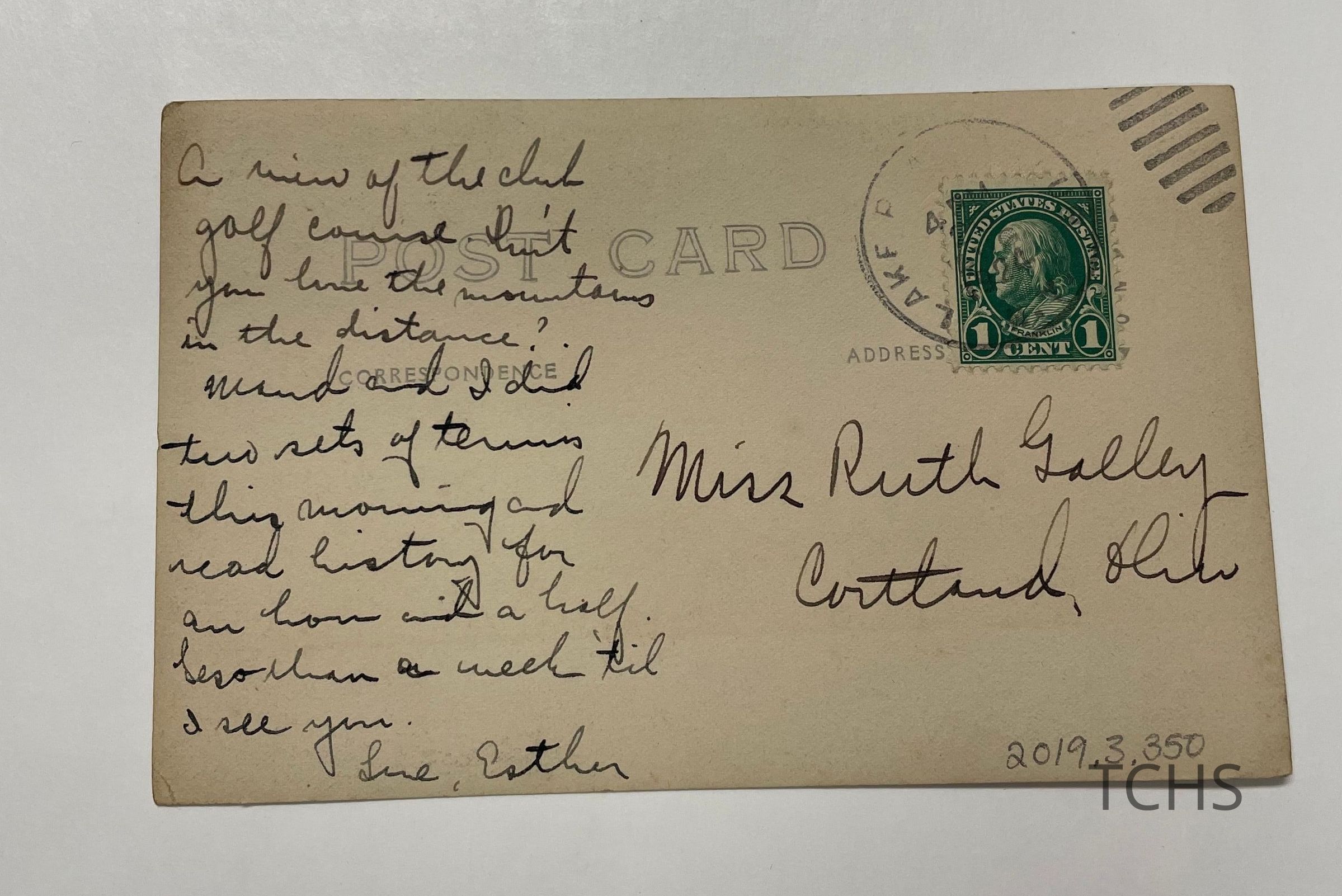 Postmarked to Cortland, OH from Lake Placid, NY 1924. Addressed to Ruth Galley from Esther (Galley).