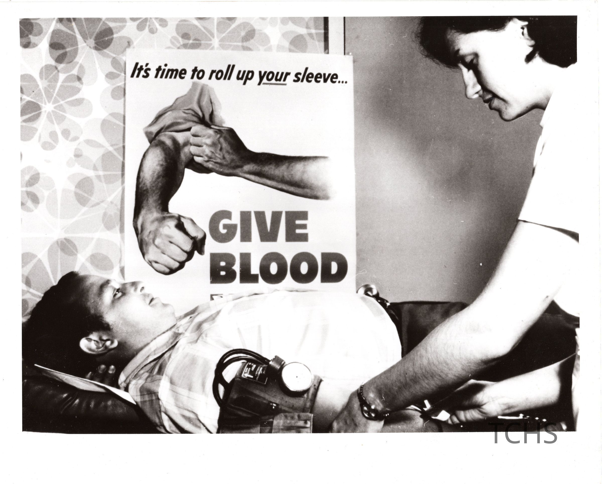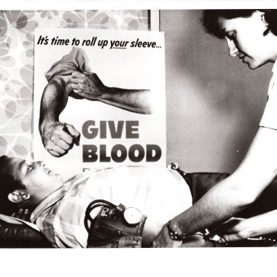 Nurse drawing blook from patient in front of a Give Blood poster.Collection