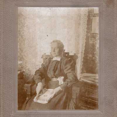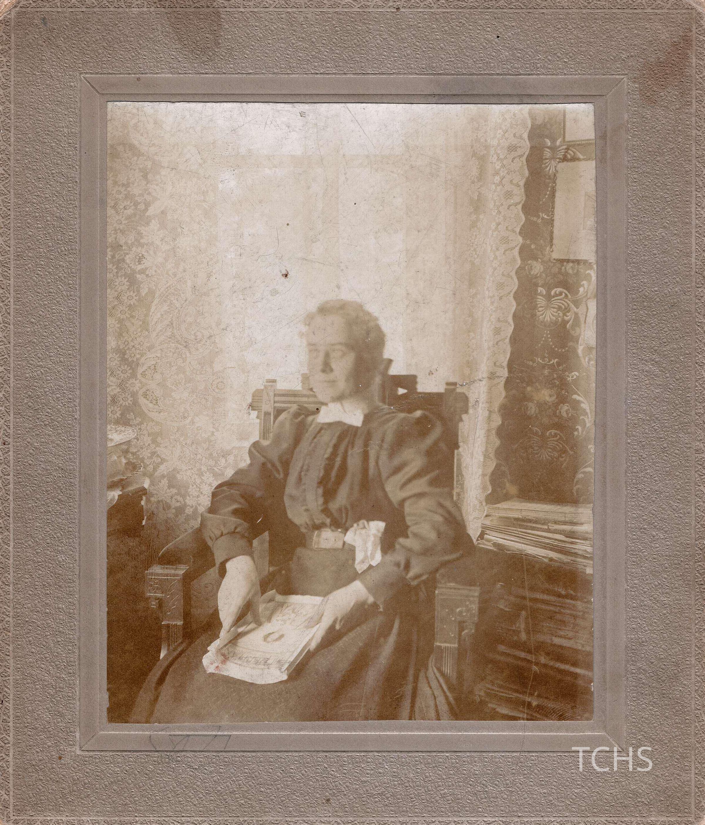 Undated photo of Mary Ohl, sitting in a chair with a book.