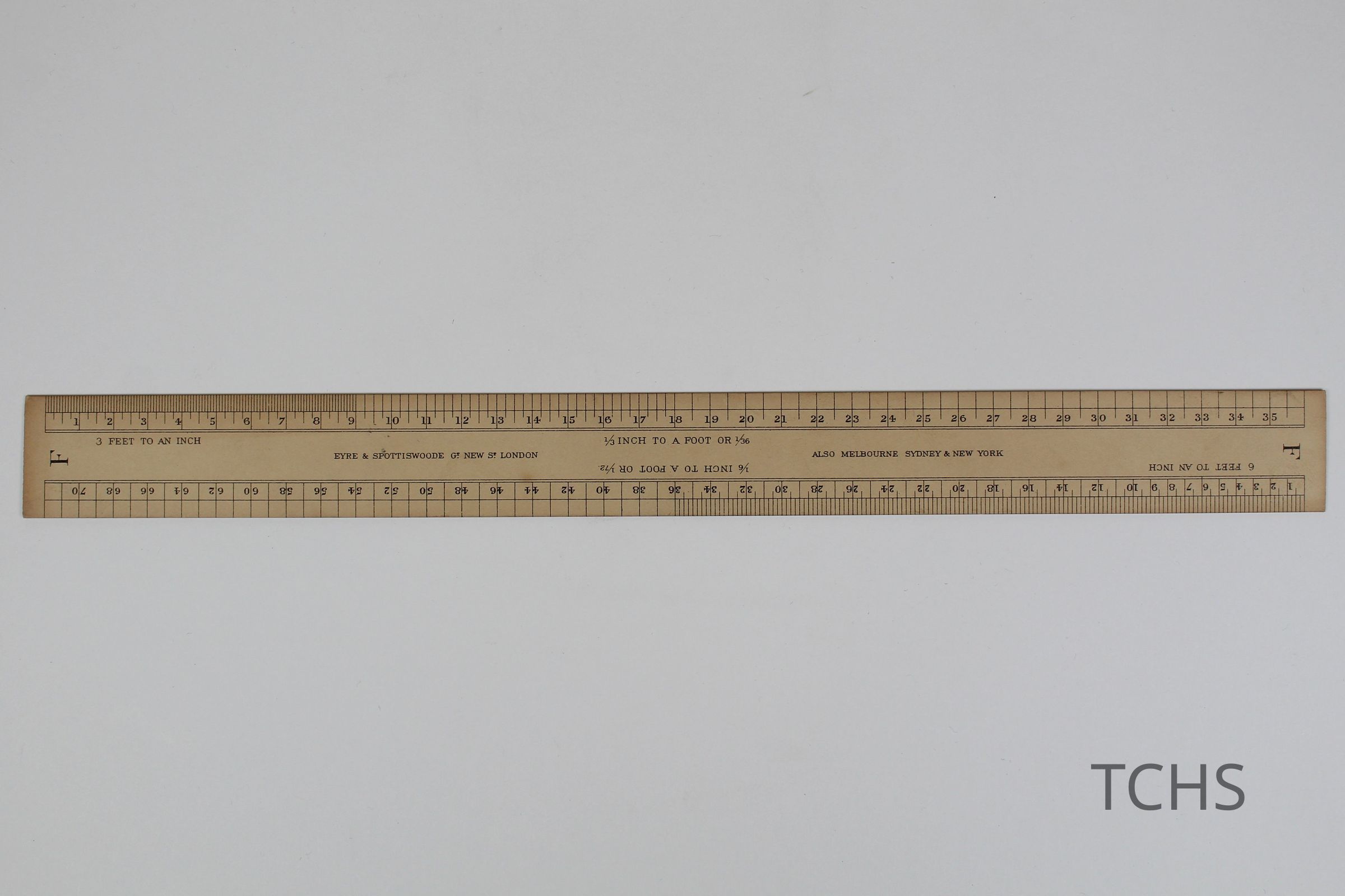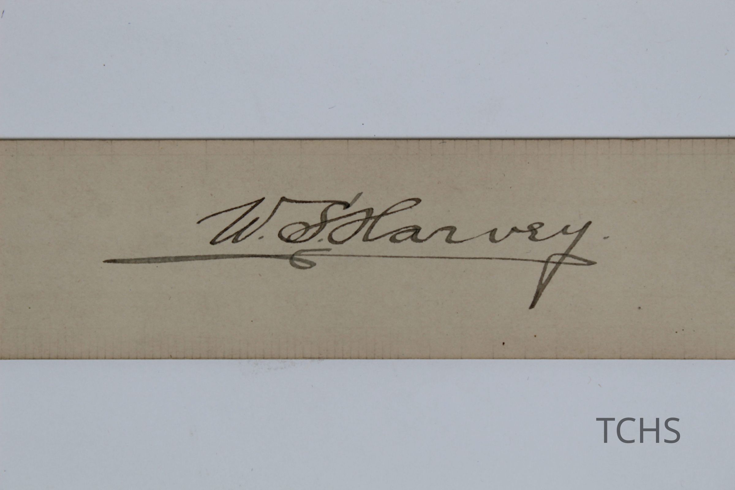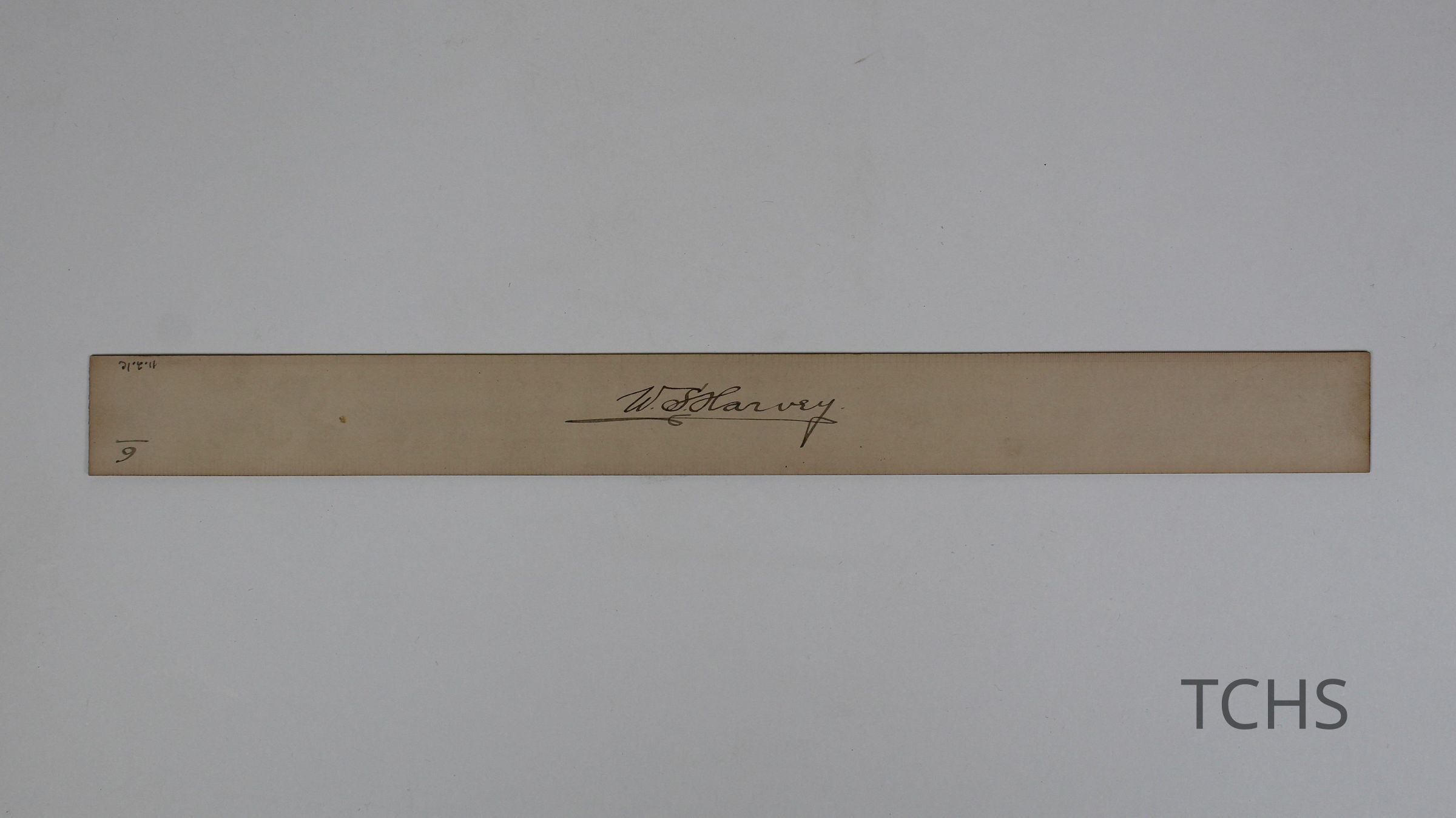 Drafting ruler, F, with W.S. Harvey's signature stamped on the back.Acquisition