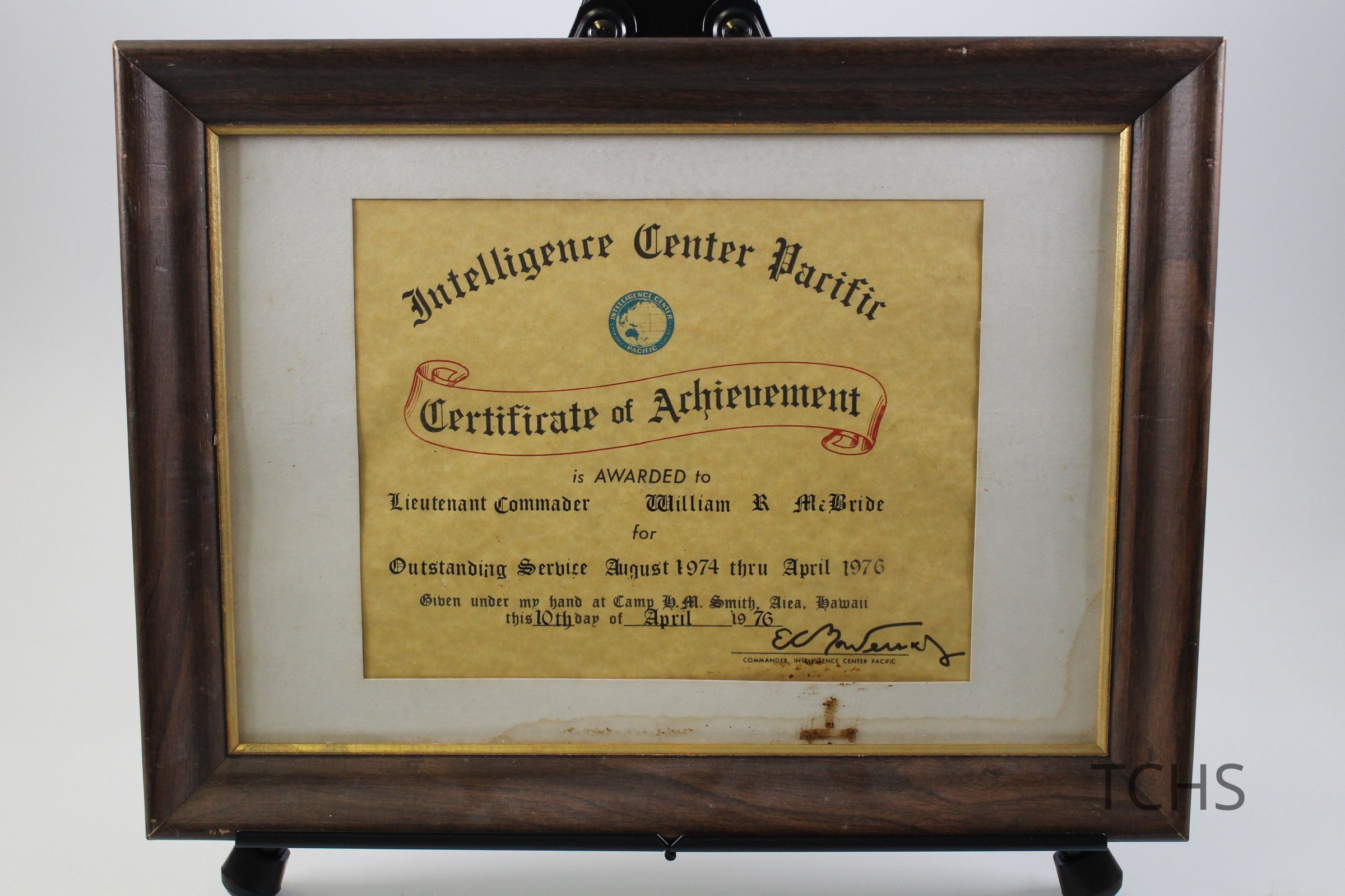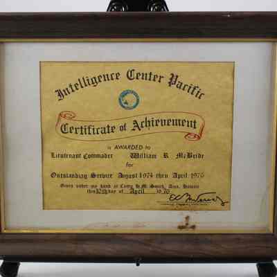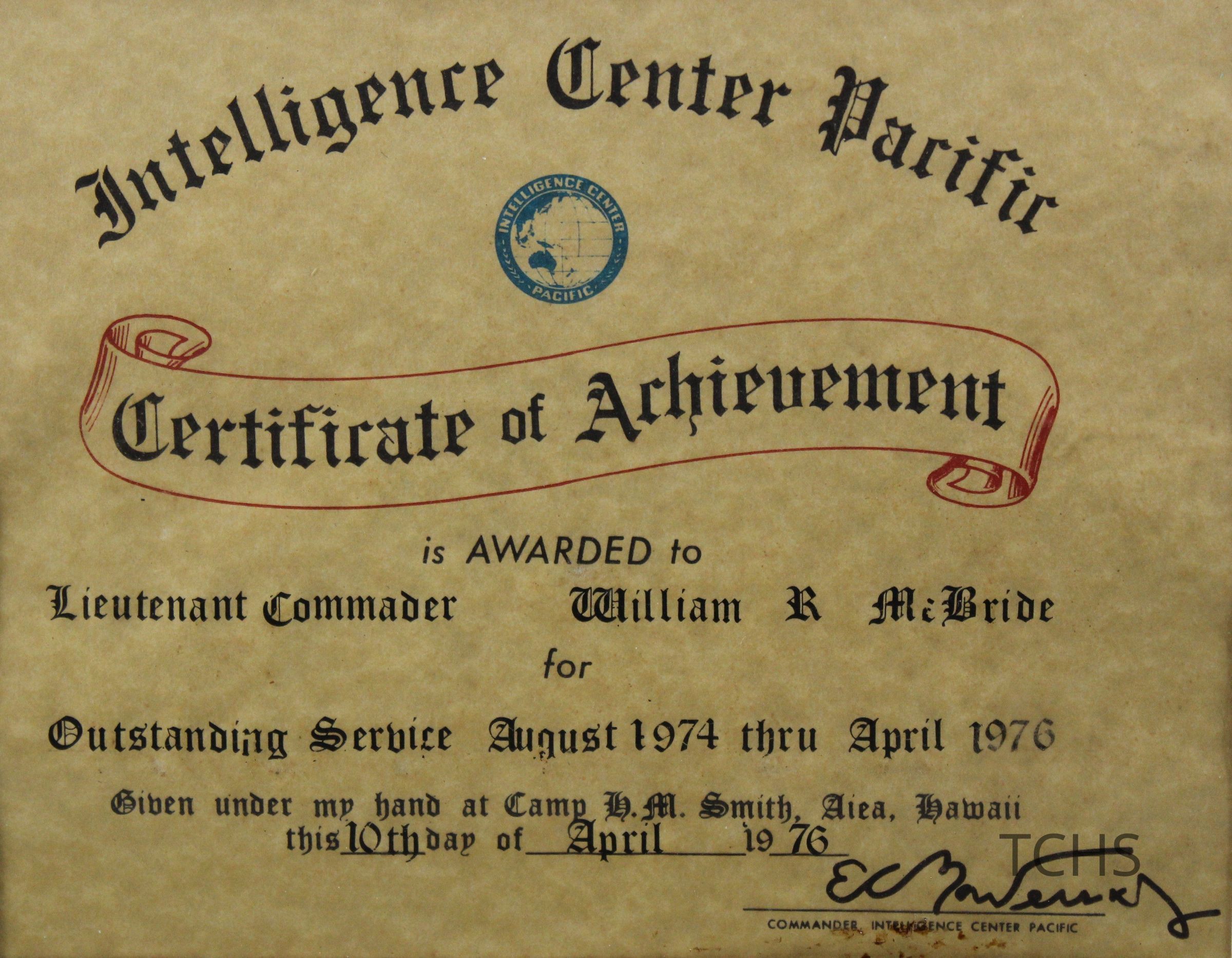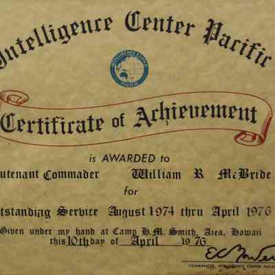 A framed Certificate of Achievement from the Intelligence Center Pacific to Lieutenant Commander William R. McBride for outstanding service from August 1974 thru April 1976.Location
