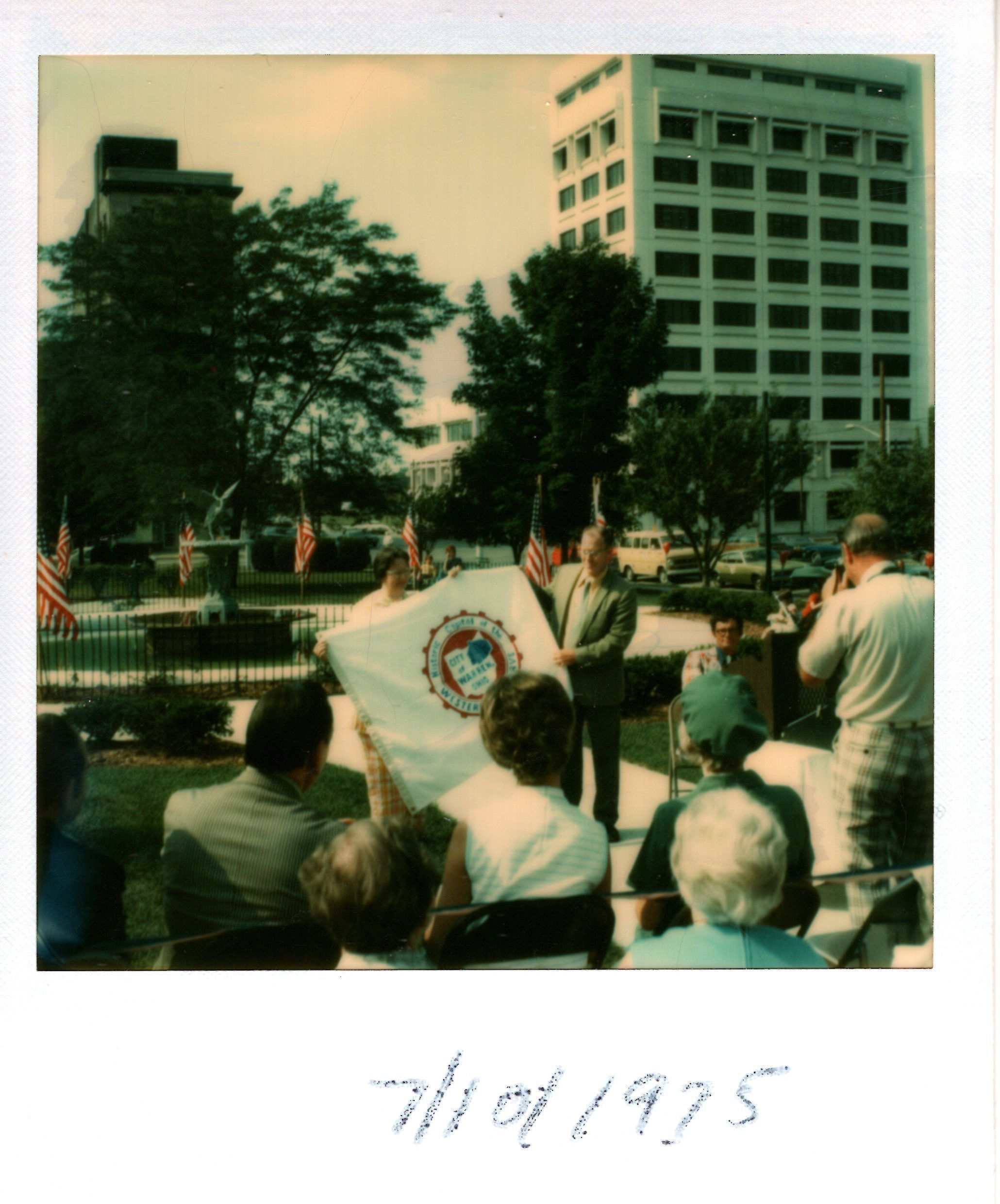 Polaroid of the Dedication of the Bicentennial Fountain event held on July 10, 1975; the image was taken for the crowd of two unknown individuals holding a City of Warren flag.Acquisition