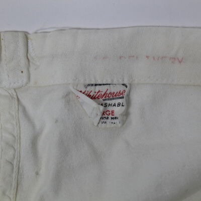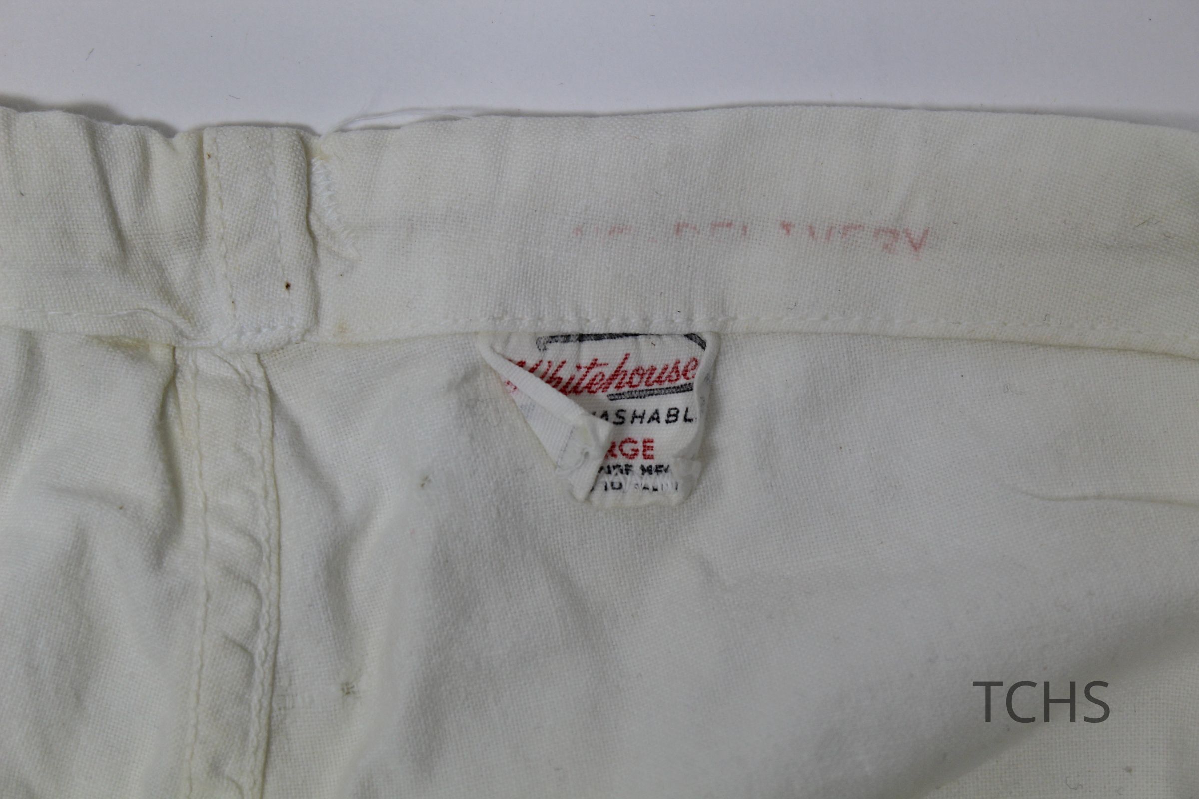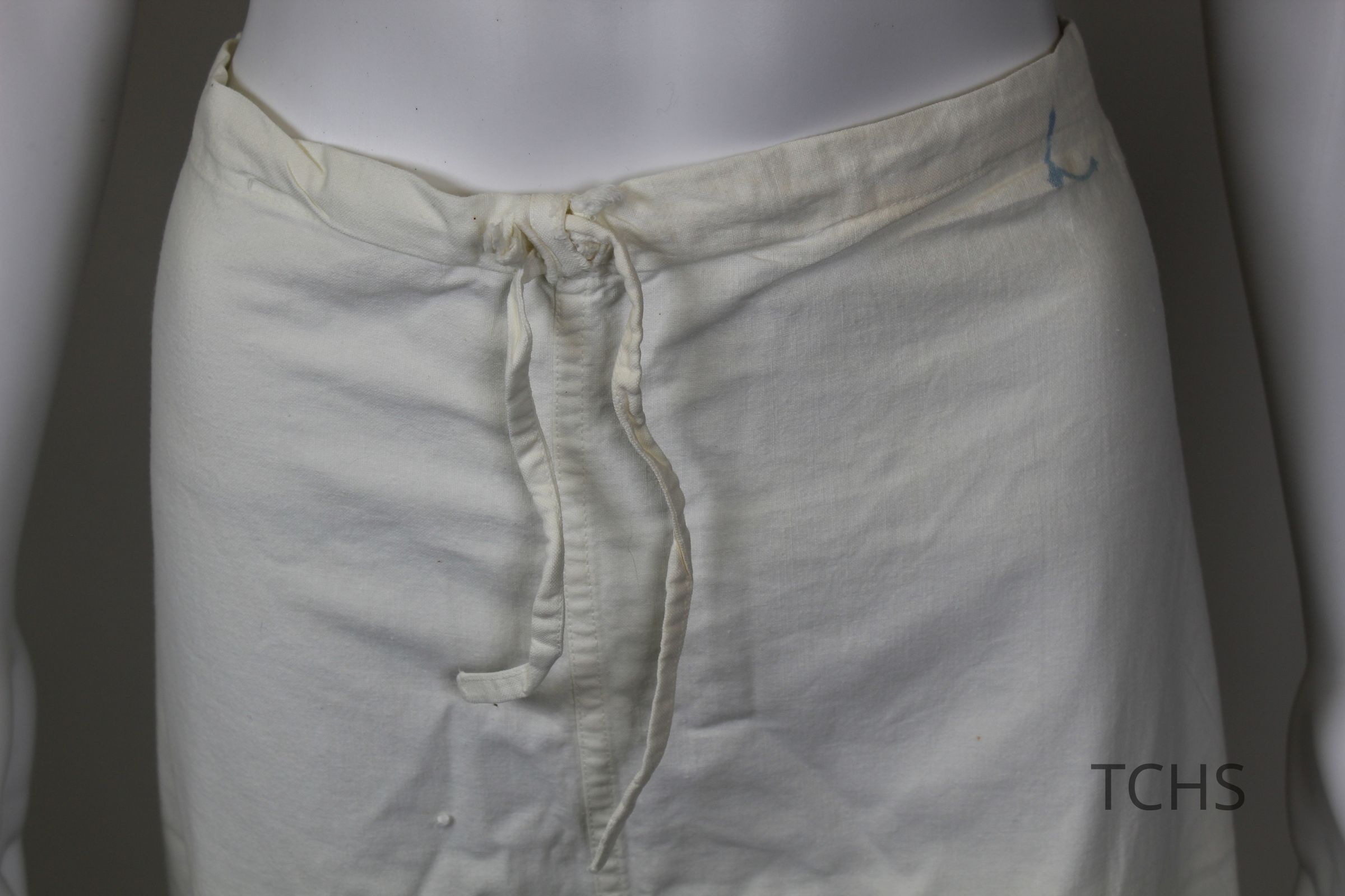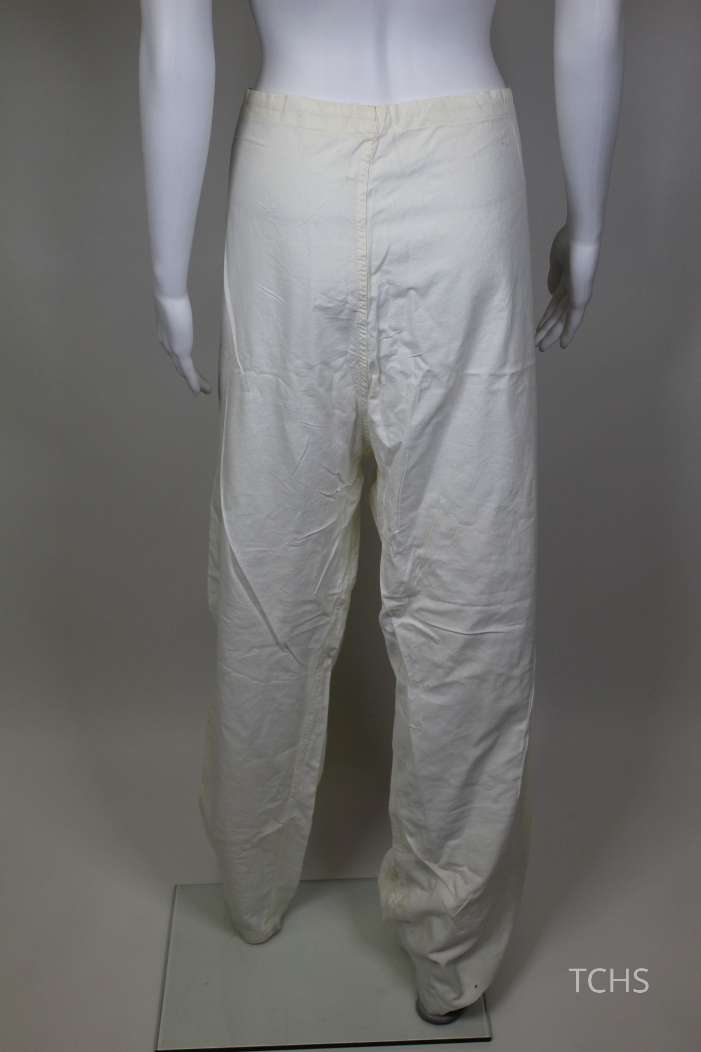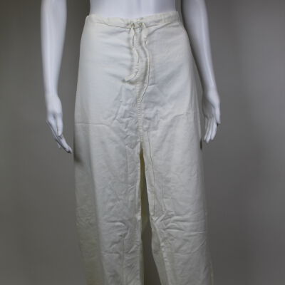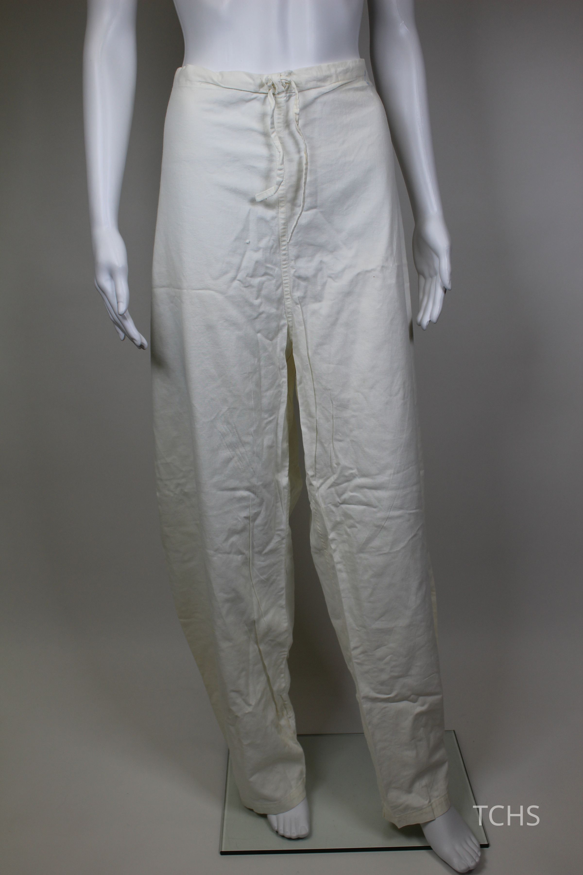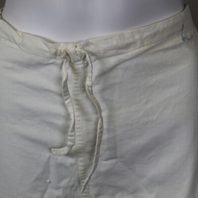 White pants with a drawstring waist, likely part of a nursing uniform, belonging to Mary Yerman Horvat.Acquisition