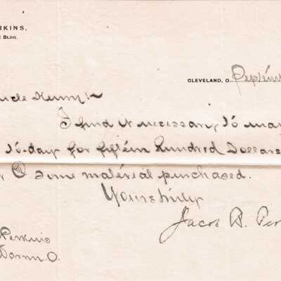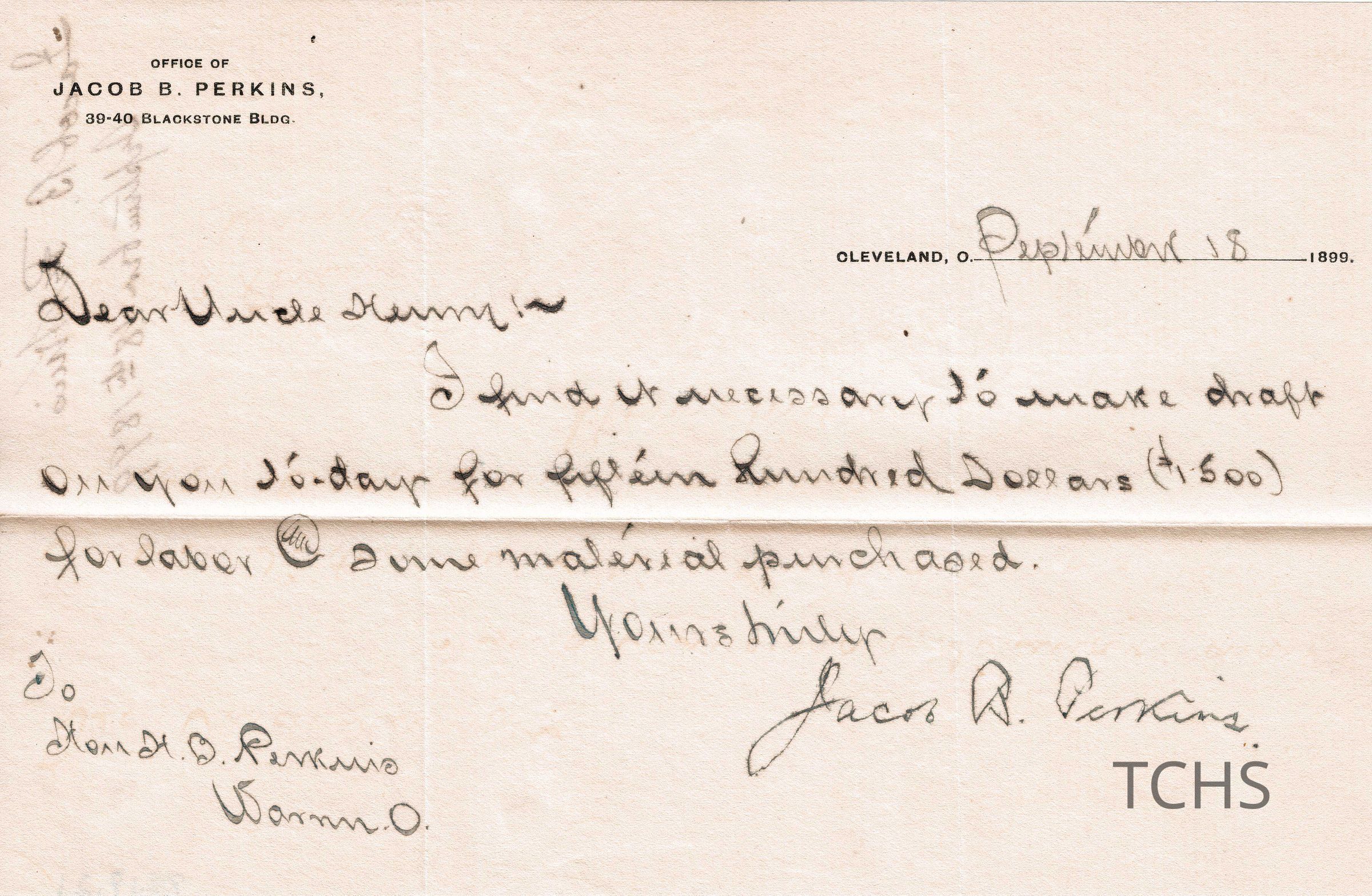 Letter, Sept. 18, 1899, From Jacob B. Perkins to Henry Bishop Perkins regarding a bank draft.Acquisition