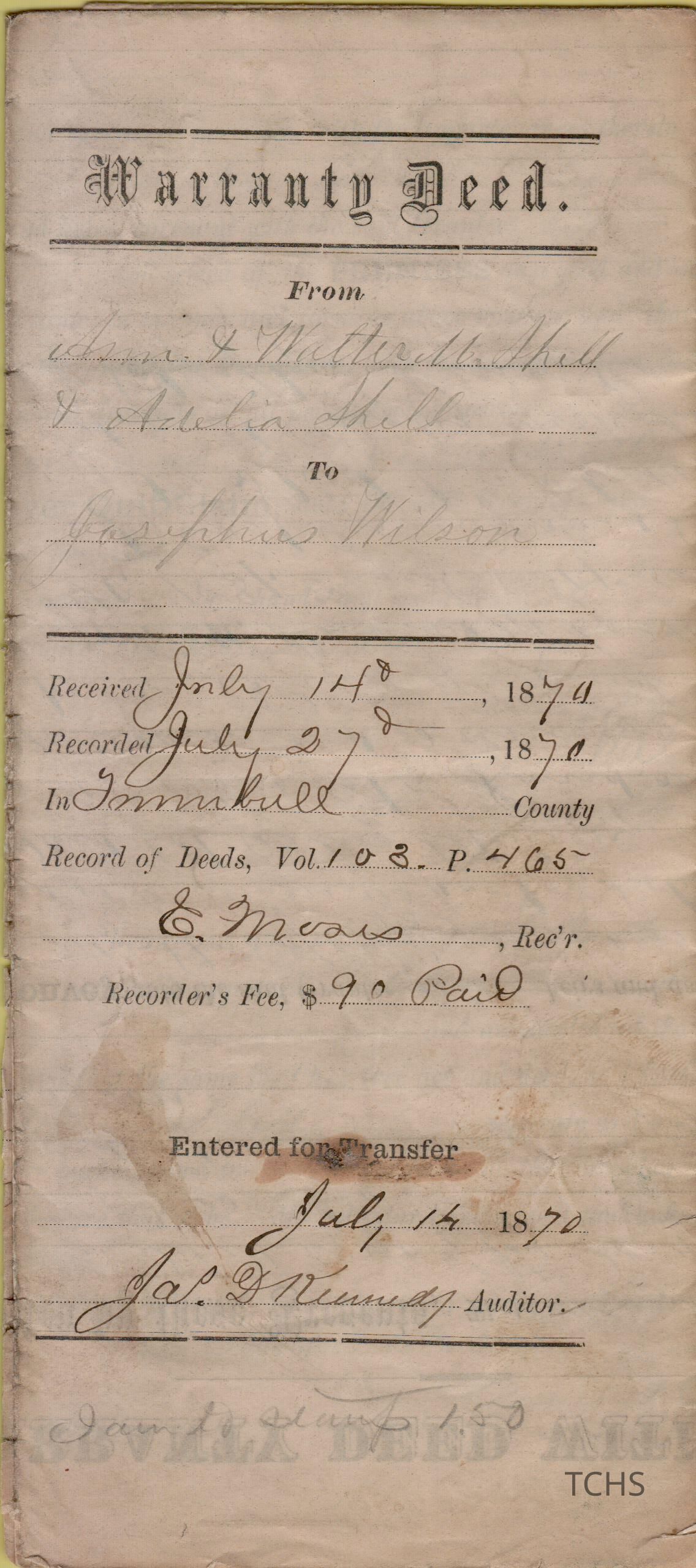 Warranty deed from Ann, Walter, and Adelia Shell to Josephus Wilson