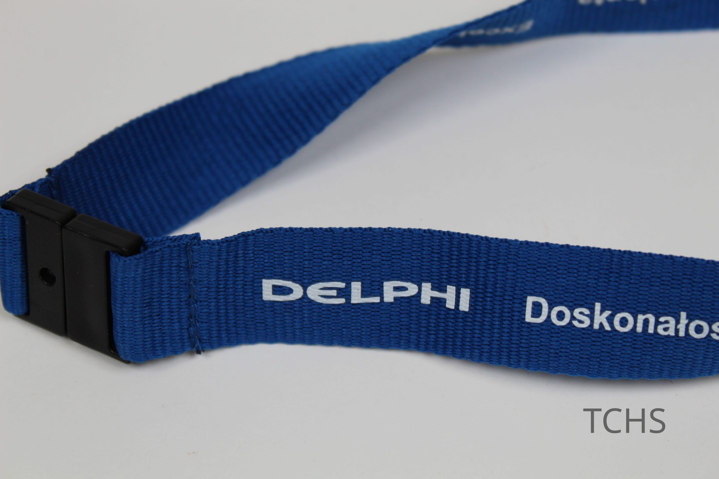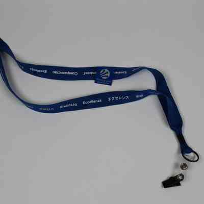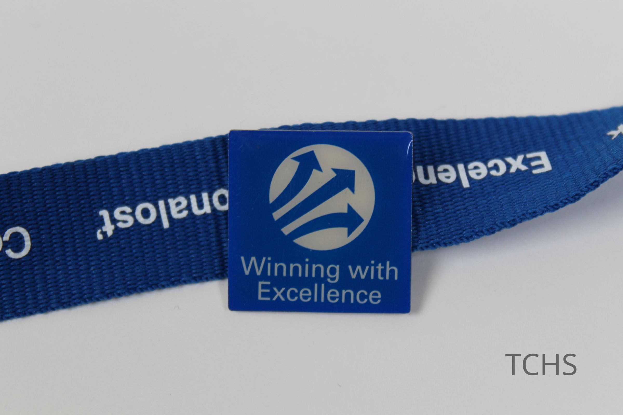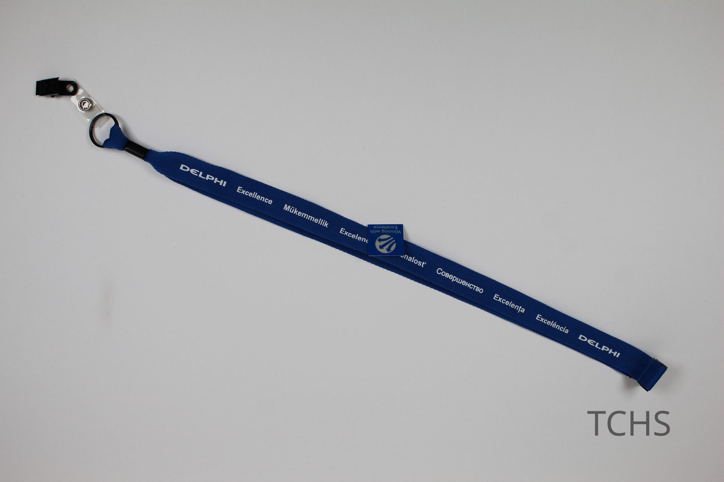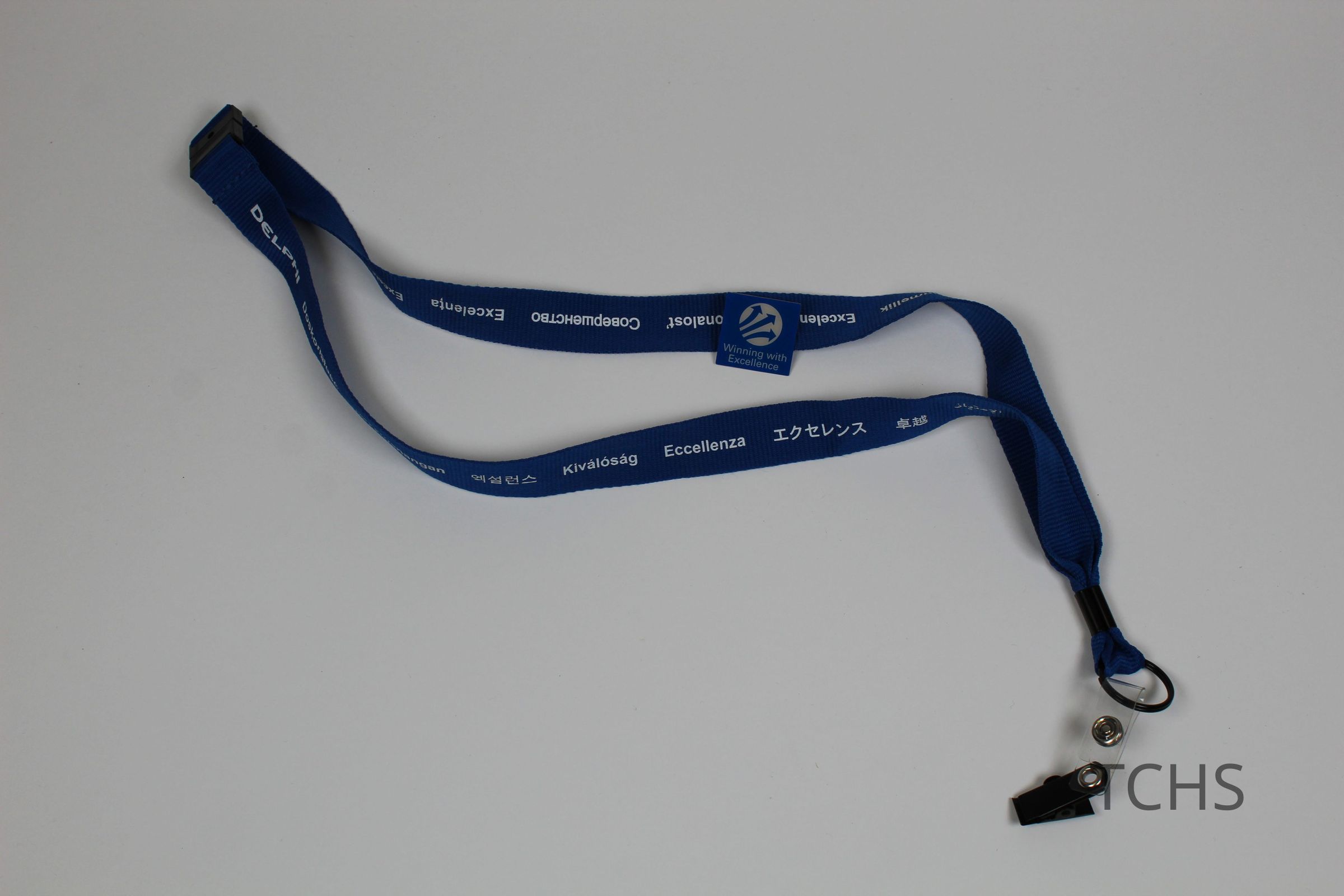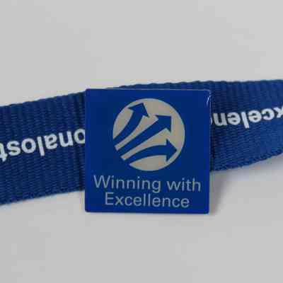 A blue Delphi lanyard with the word excellent in different languages in white; there is a Winning with Excellence pin attached to the lanyard.