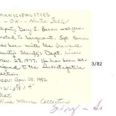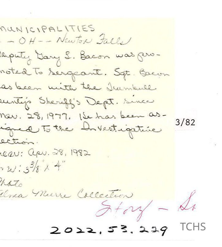 "Deputy Gary L. Bacon was promoted to Sergeant. Sgt. Bacon has been with the Trumbull County Sheriff's Dept. since Mar. 28, 1977. He has been assigned to the Investigative Section."